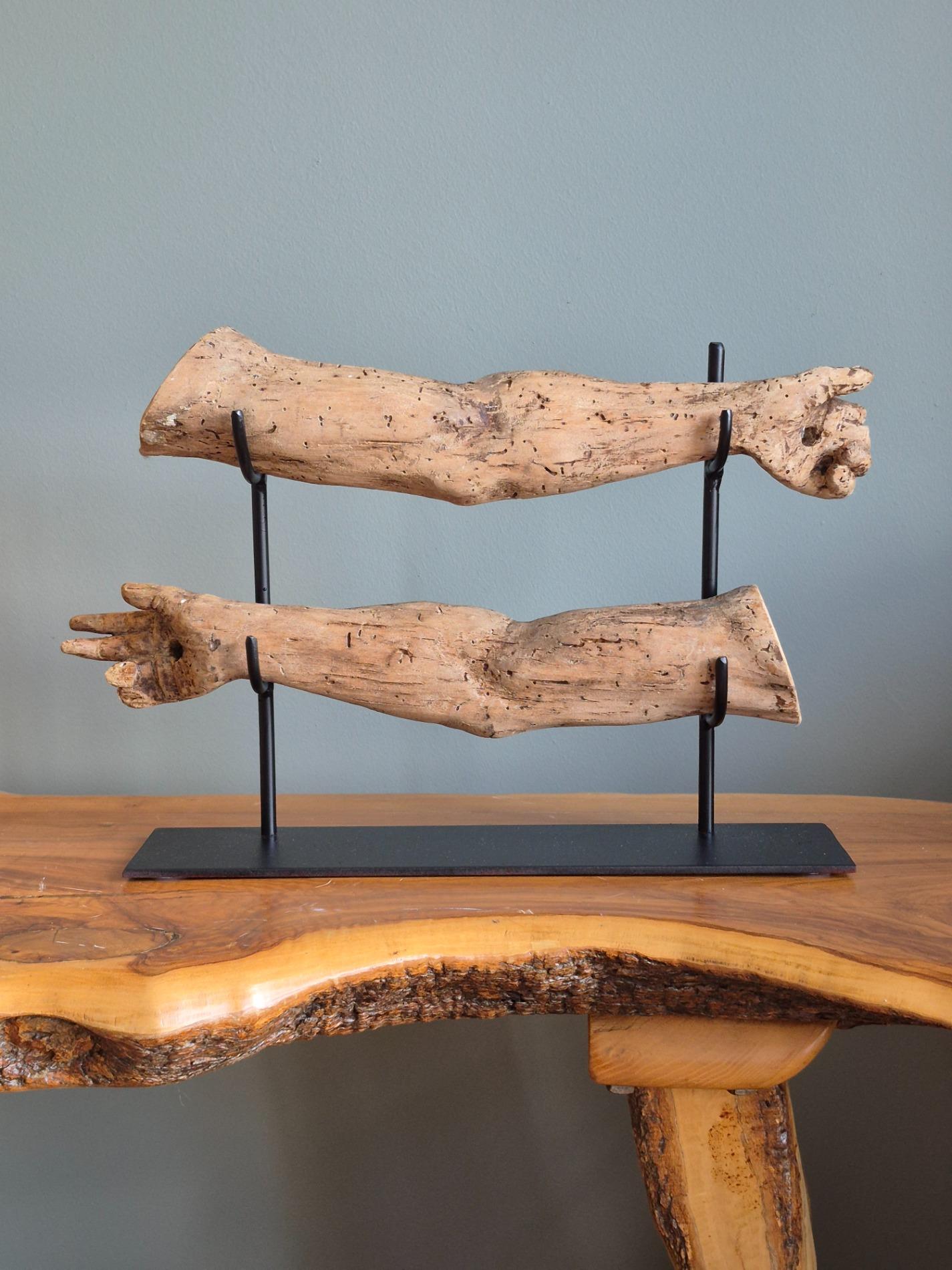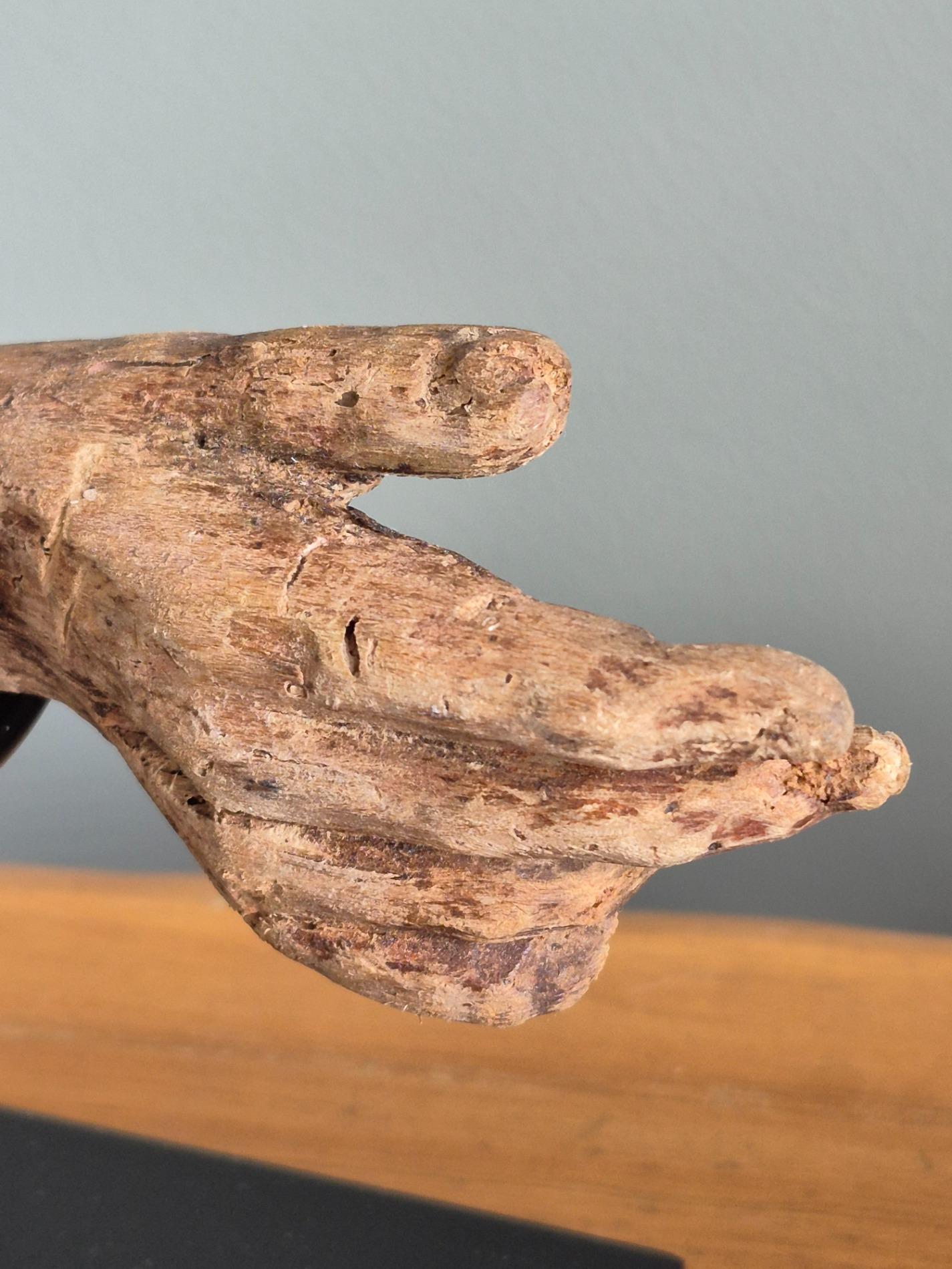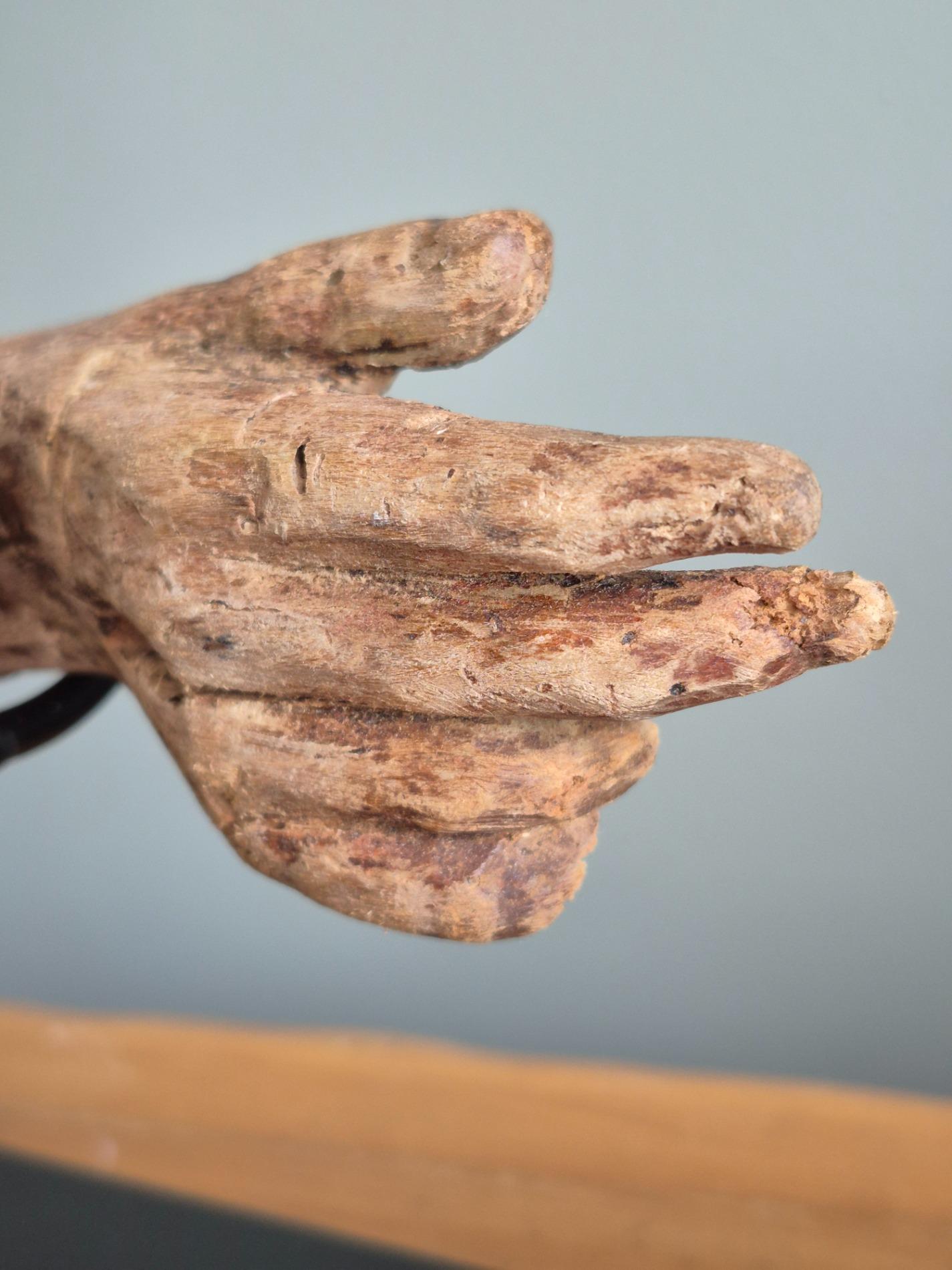 Pair of 17th C arms of a corpus christ. Made of limewood with nice patina and traces of time. Mounted on a custom made metal display.