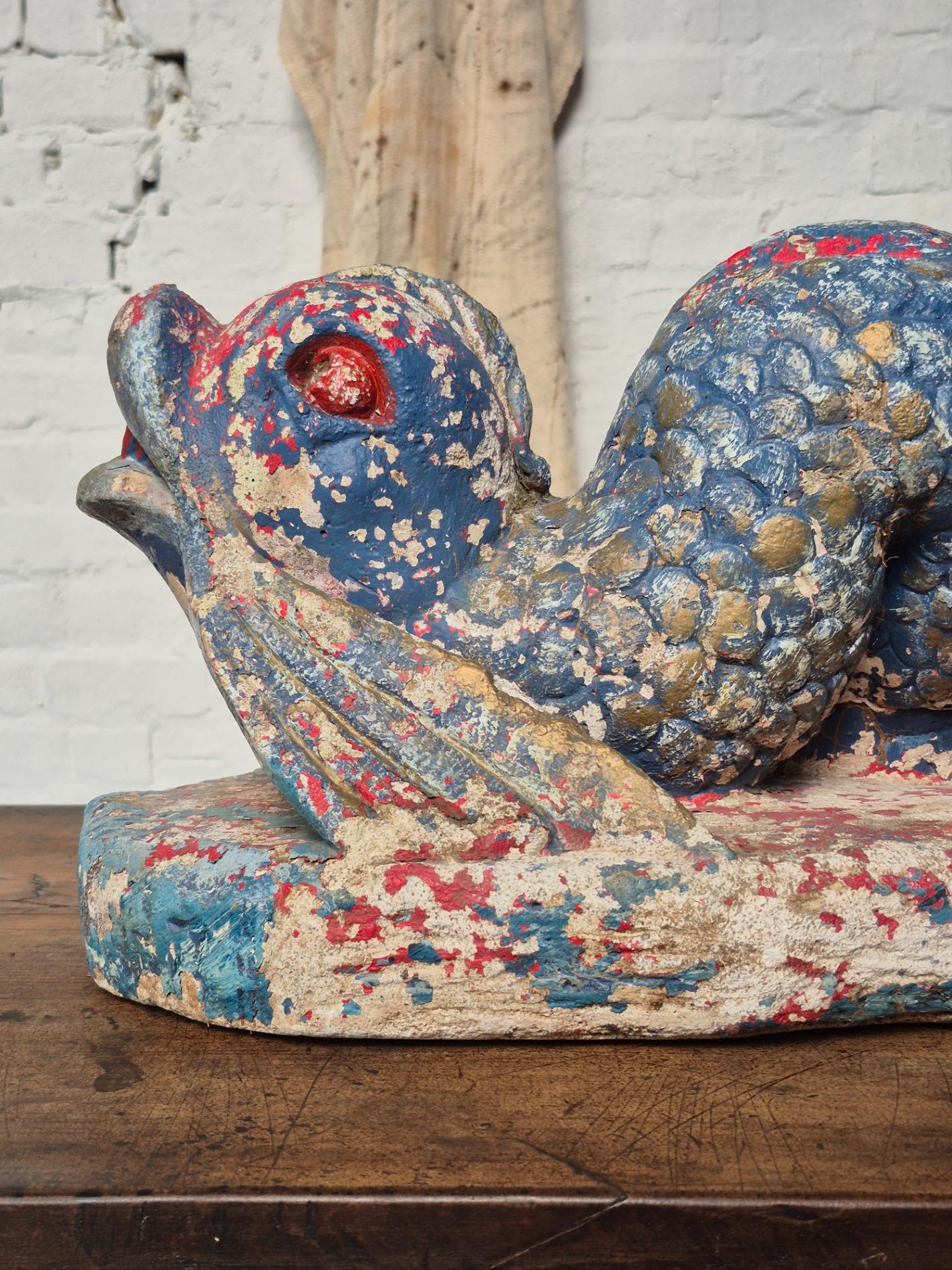 Old 1950' s fountain in the shape of a fish. Painted by the owner for years in different colours, which has created a wonderful and colourful patina.