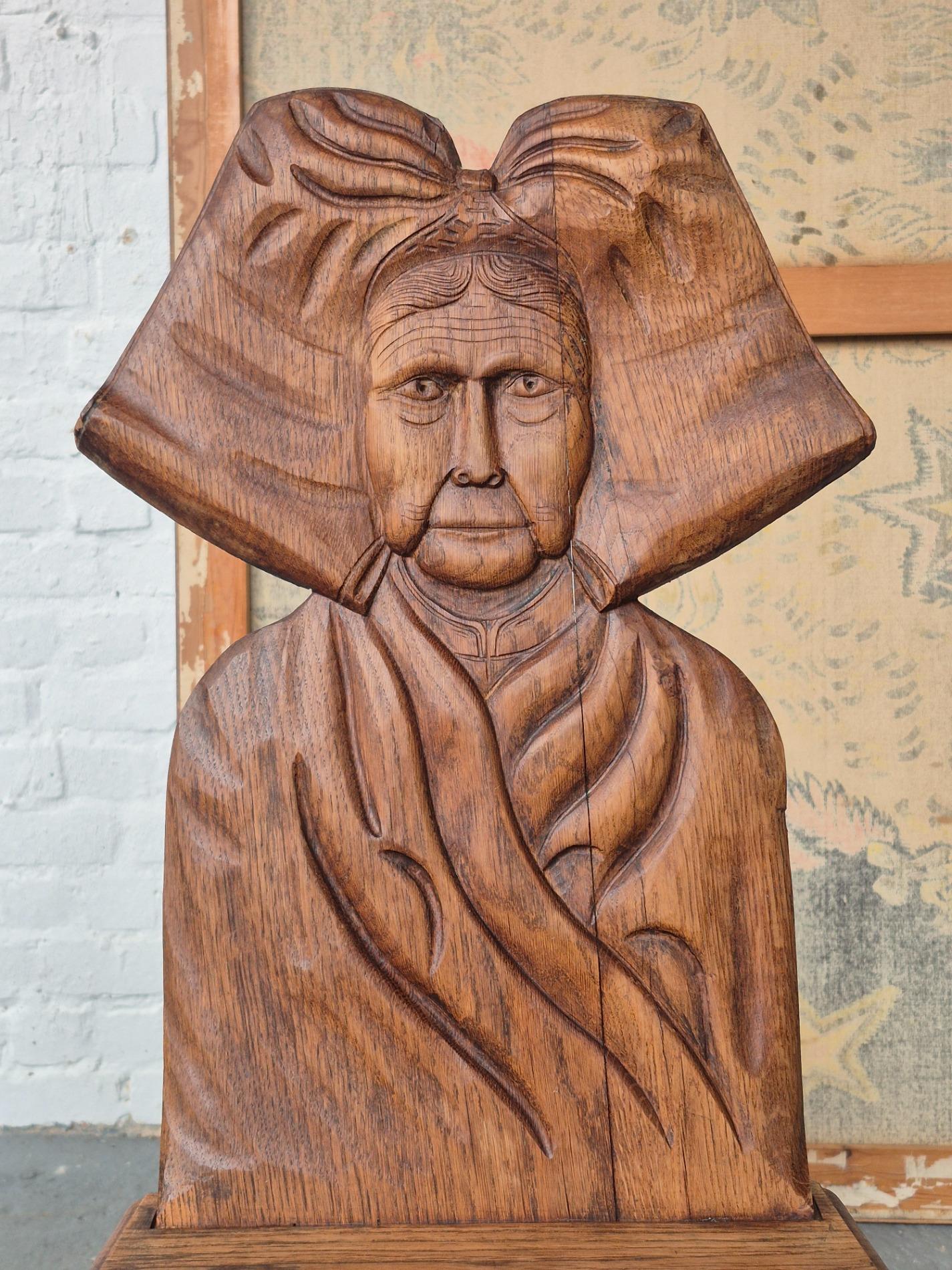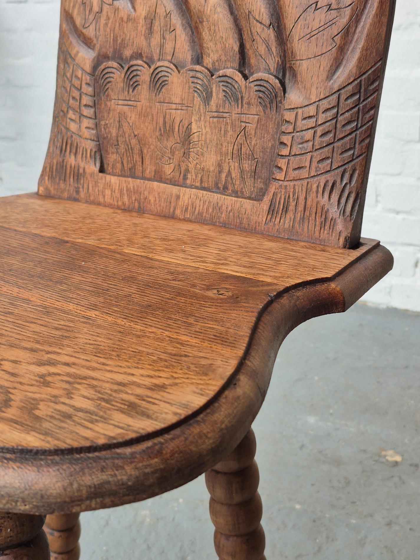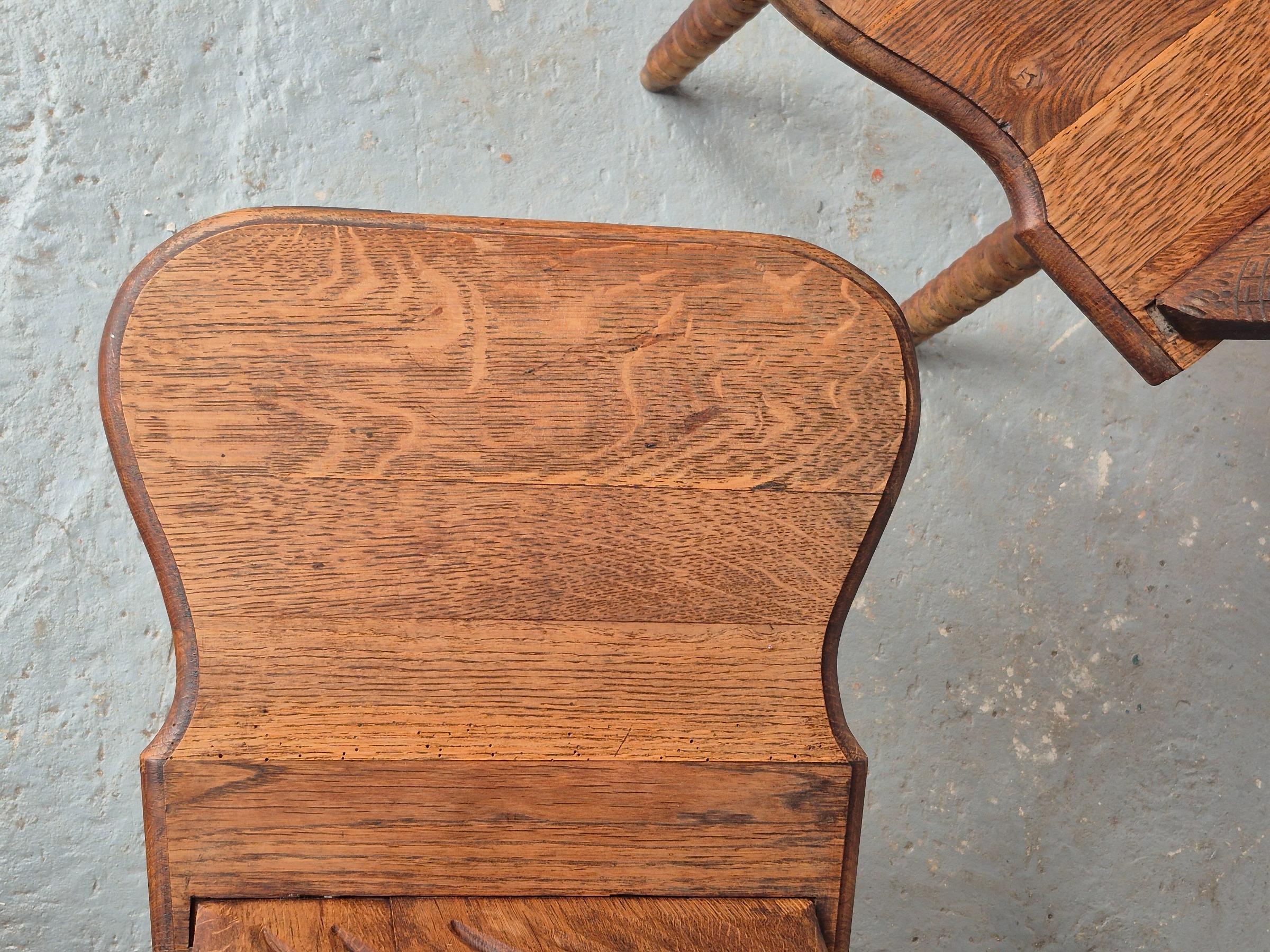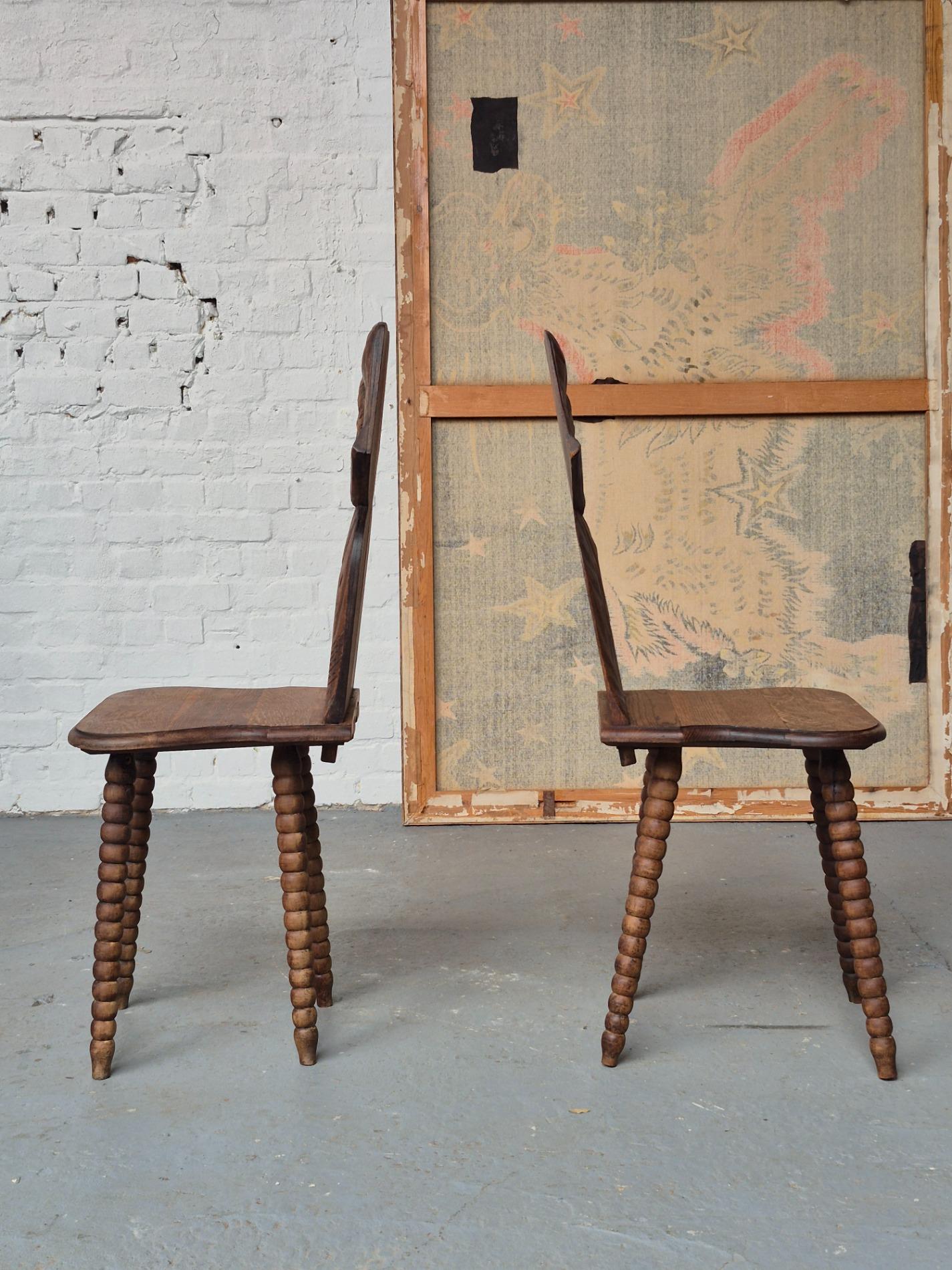Pair of 19th century French folk art woman chairs, these chairs were made as a gift when someone was leaving the parents house, because of marriage or to live alone. This pair is very rare to find because it depicts two women, probably sisters. These chairs were a typical tradition in the Alsace region. Made of oakwood with nice primitive details and patina.