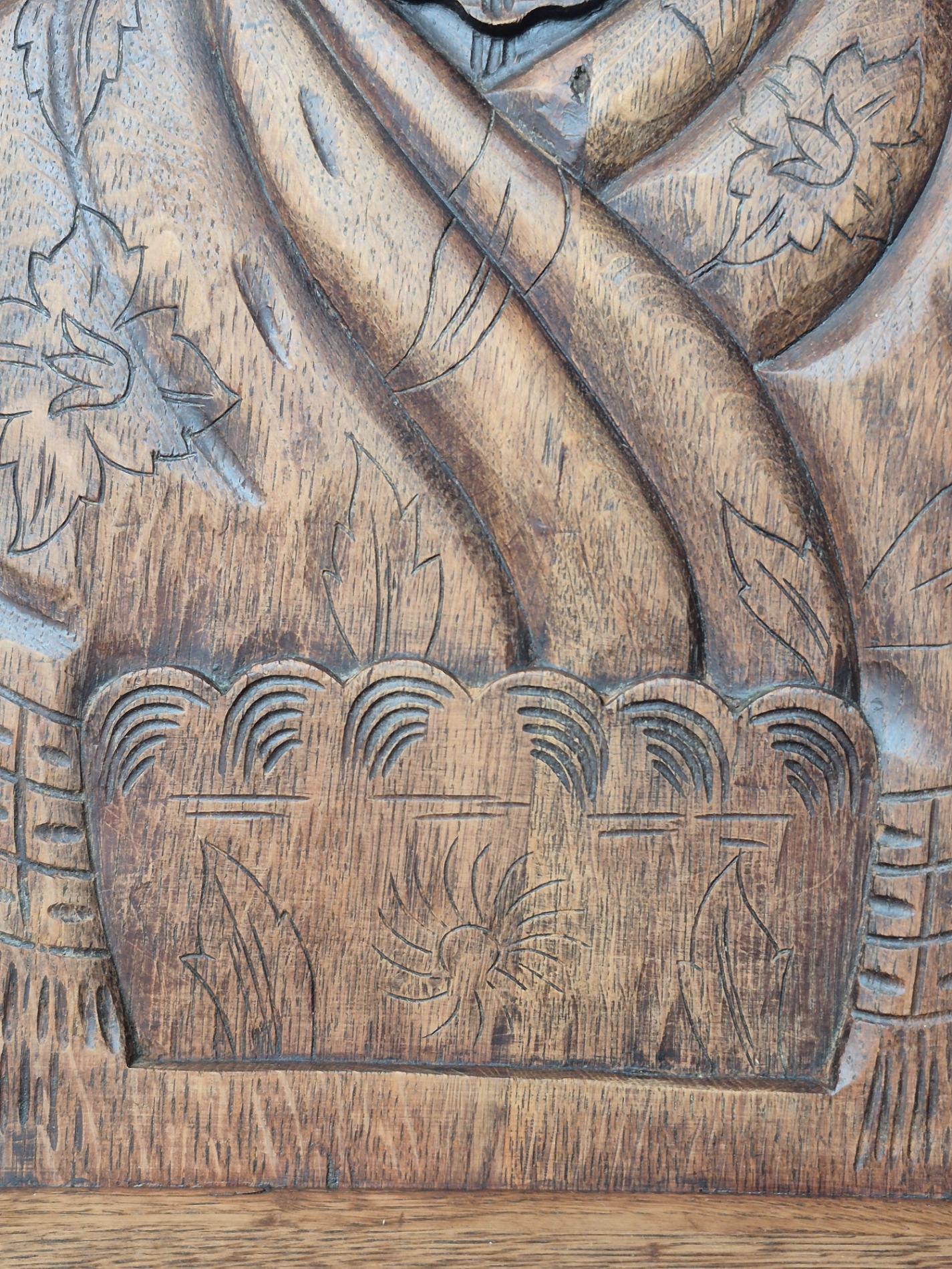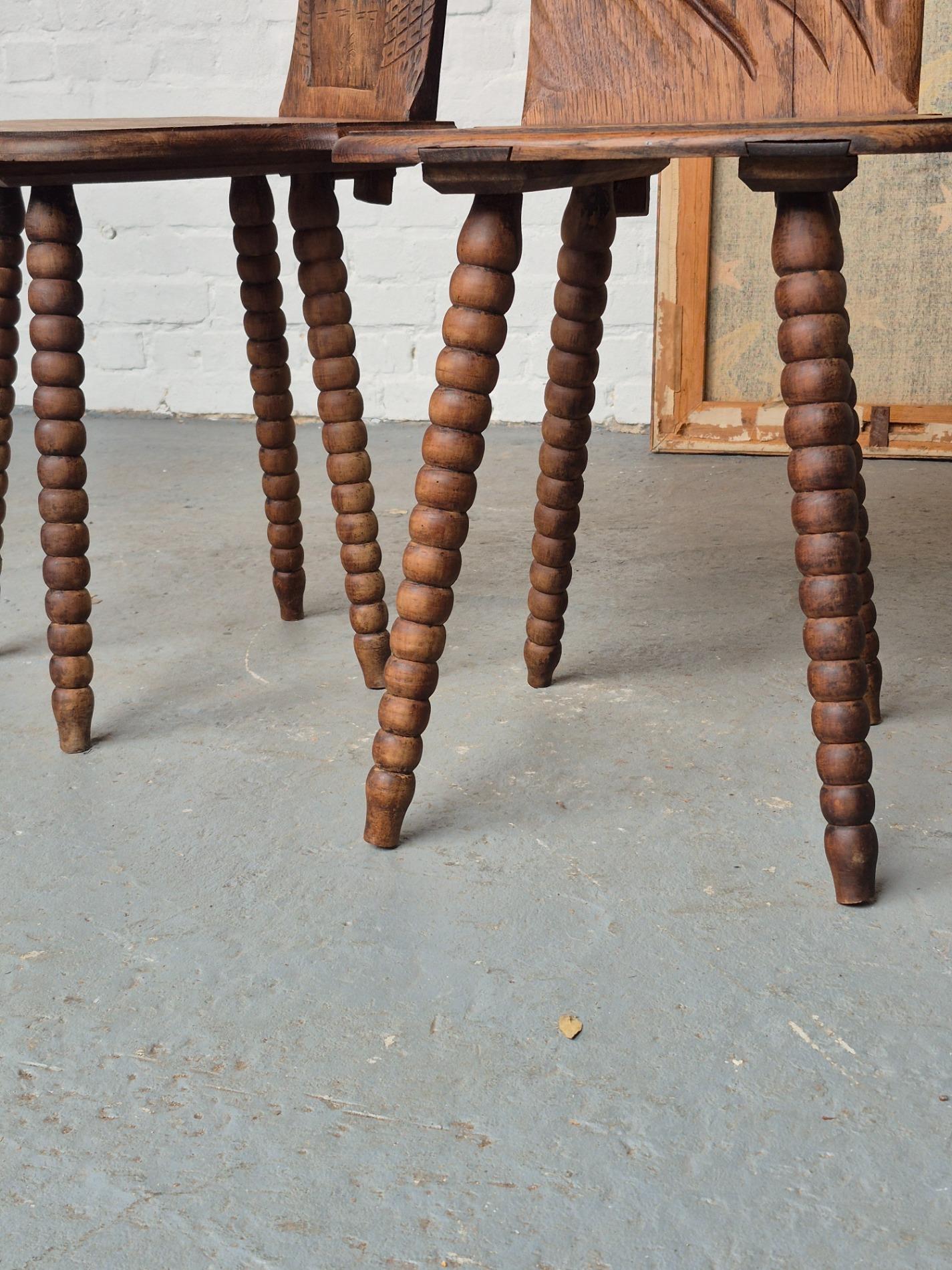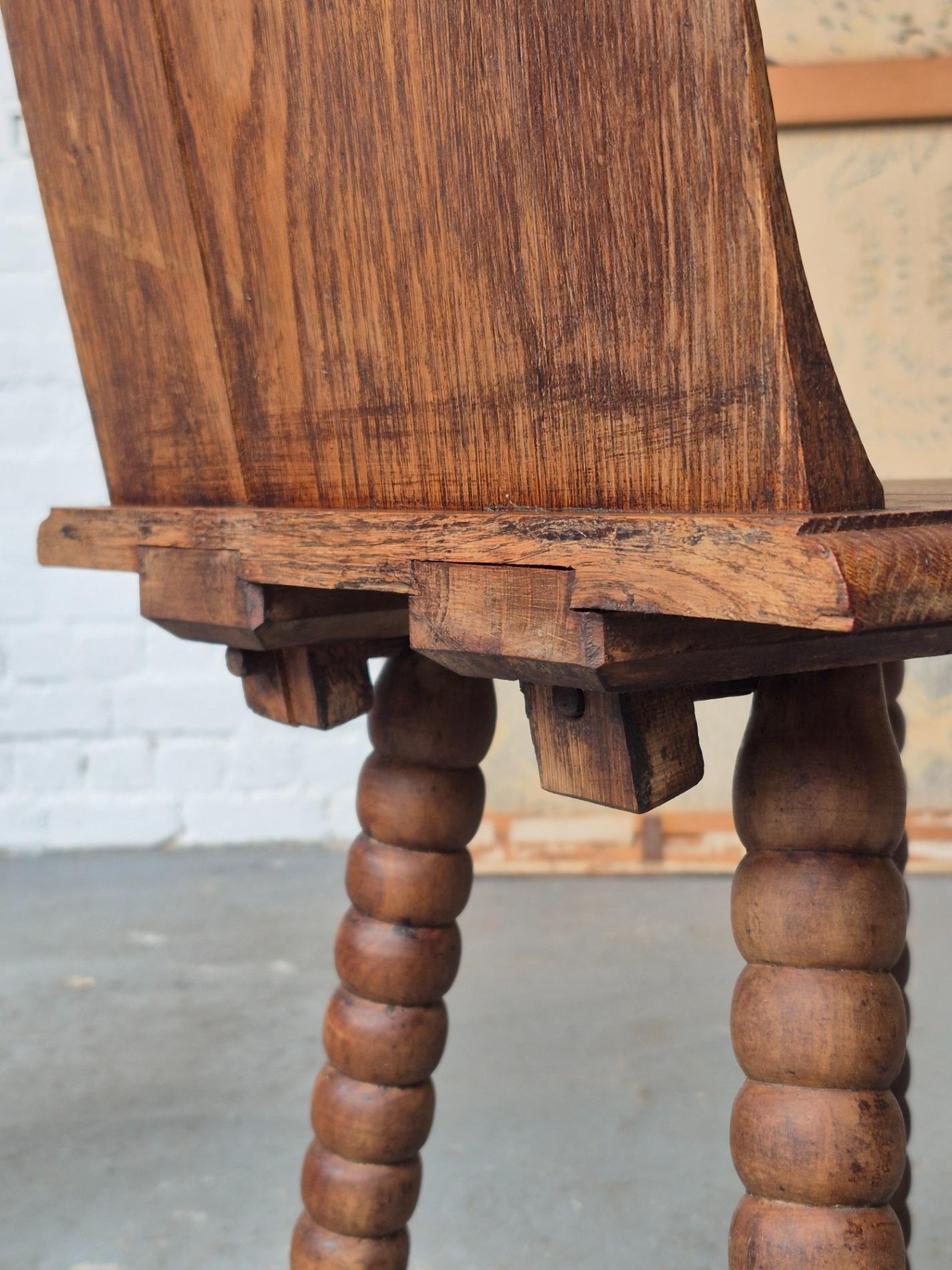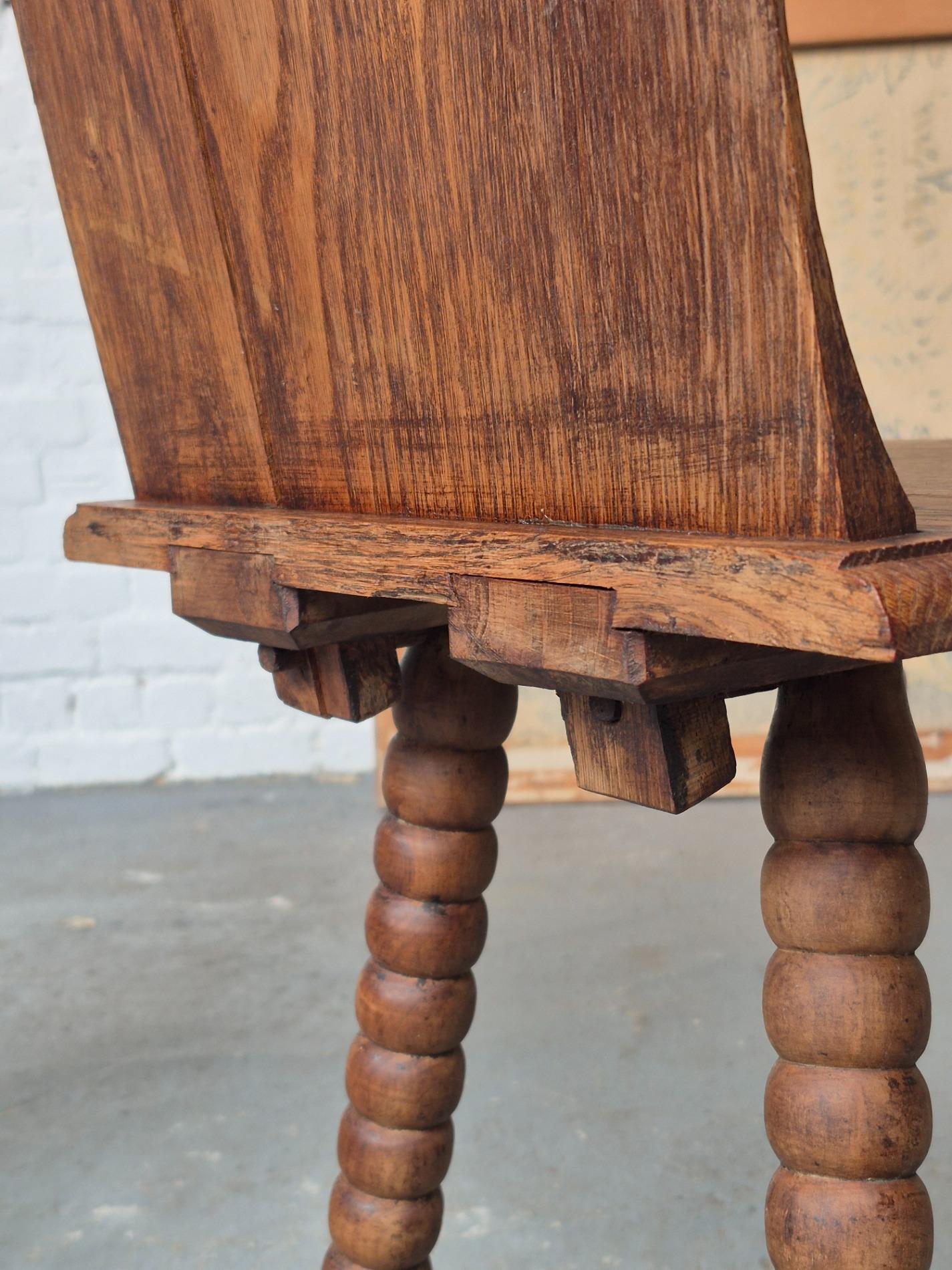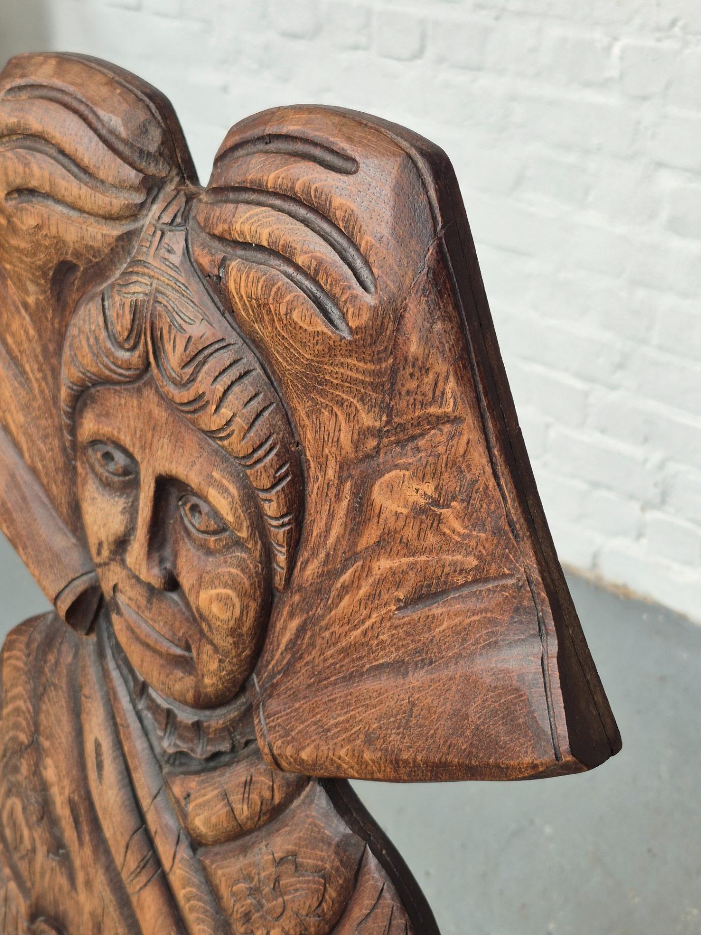 Pair of 19th century French folk art woman chairs, these chairs were made as a gift when someone was leaving the parents house, because of marriage or to live alone. This pair is very rare to find because it depicts two women, probably sisters. These chairs were a typical tradition in the Alsace region. Made of oakwood with nice primitive details and patina.