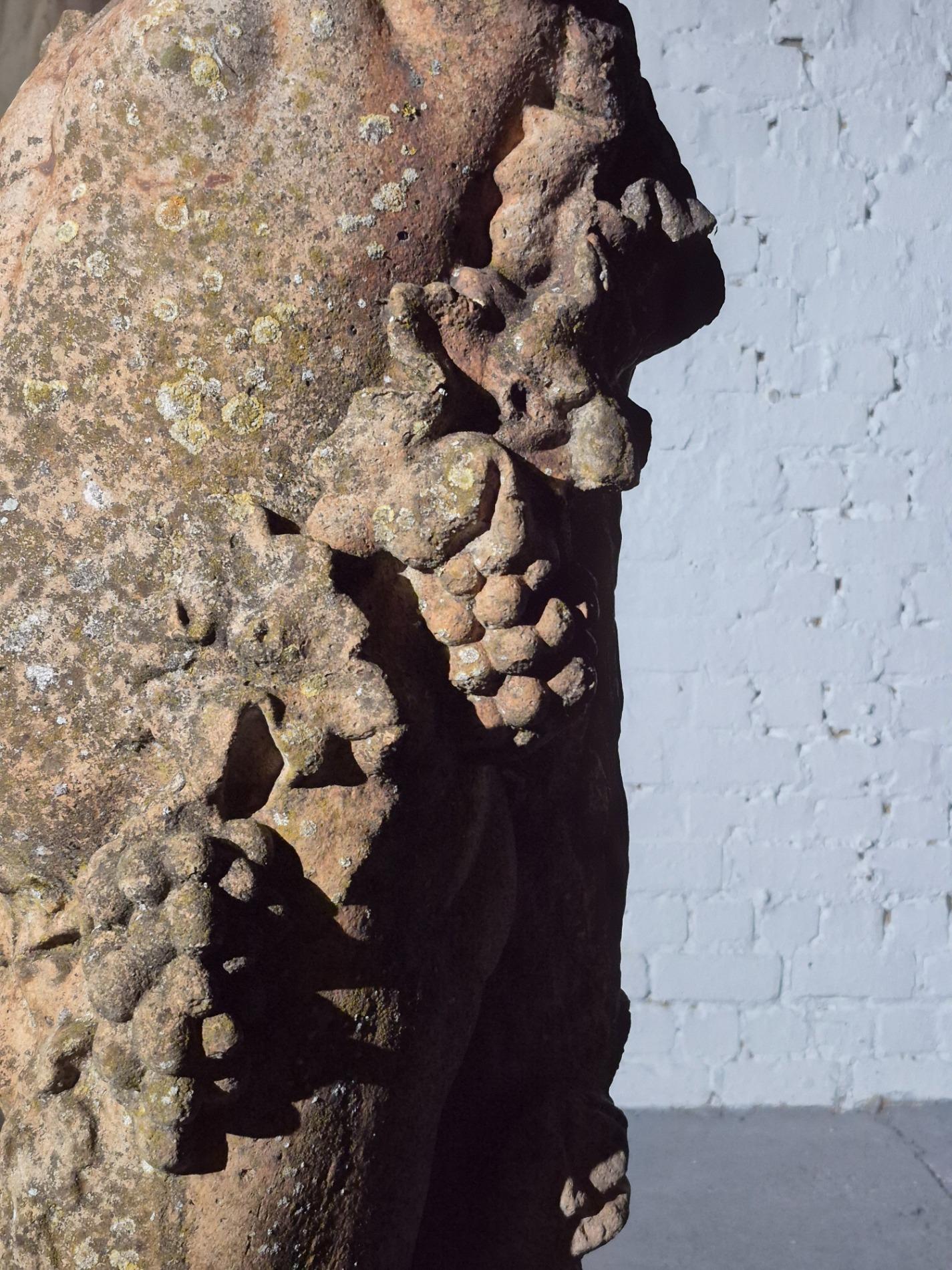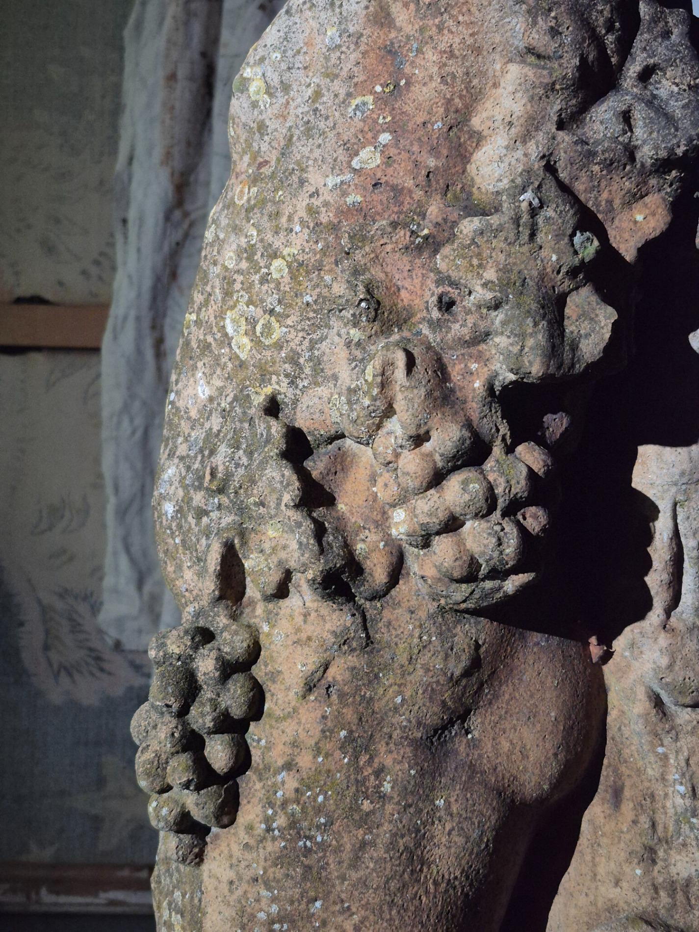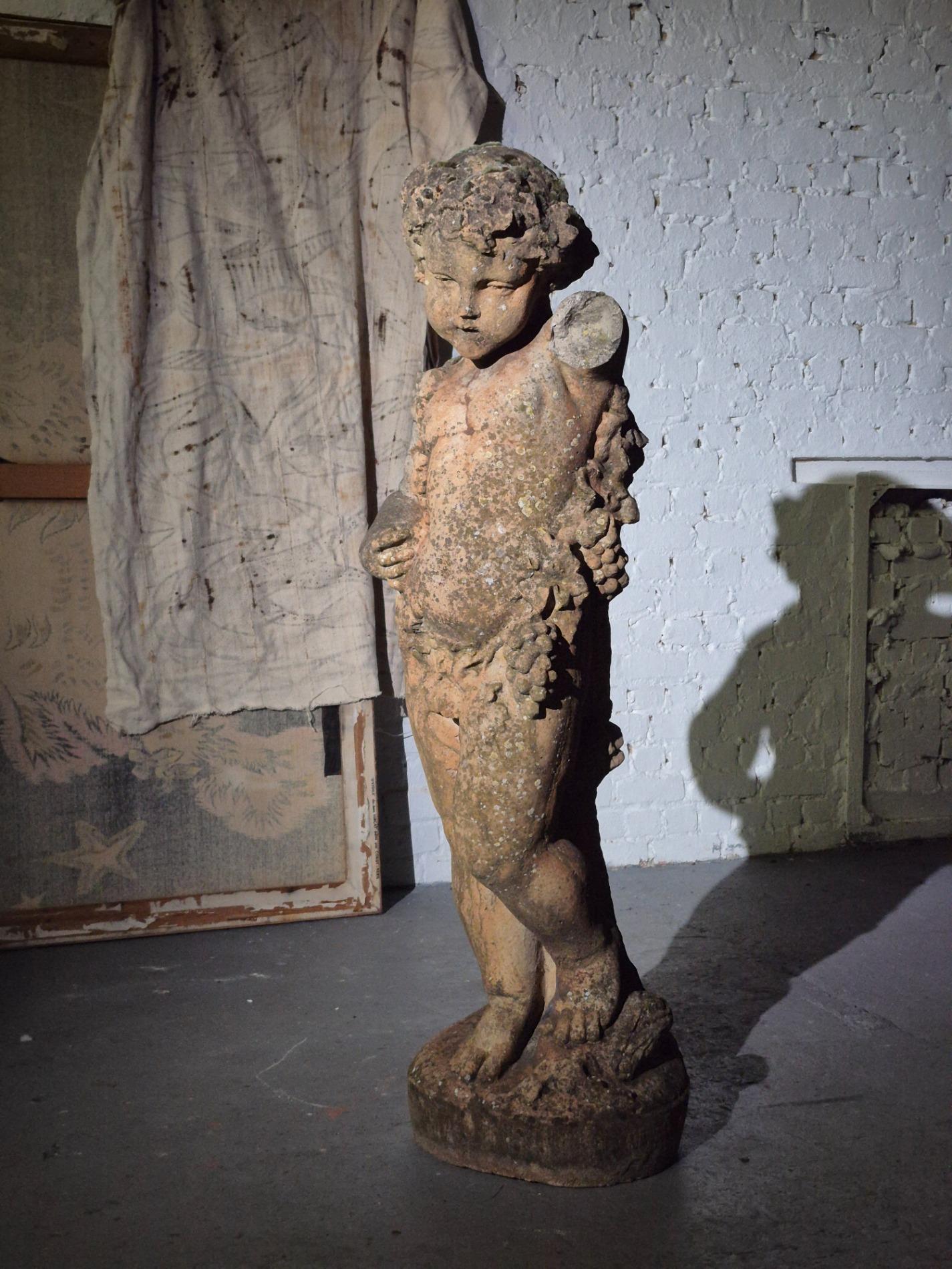 19th-century exceptionally large (136 cm) stone Putti. Made in Italy, and it has stood in a garden for many years, which has created a beautiful patina with moss. The sculpture is full of beautiful and refined details, such as the grapevine that gracefully winds around the body of the Putti, the tree trunk with leaves at the back of the sculpture, as well as the detailed anatomy of the figure and its serene expression.