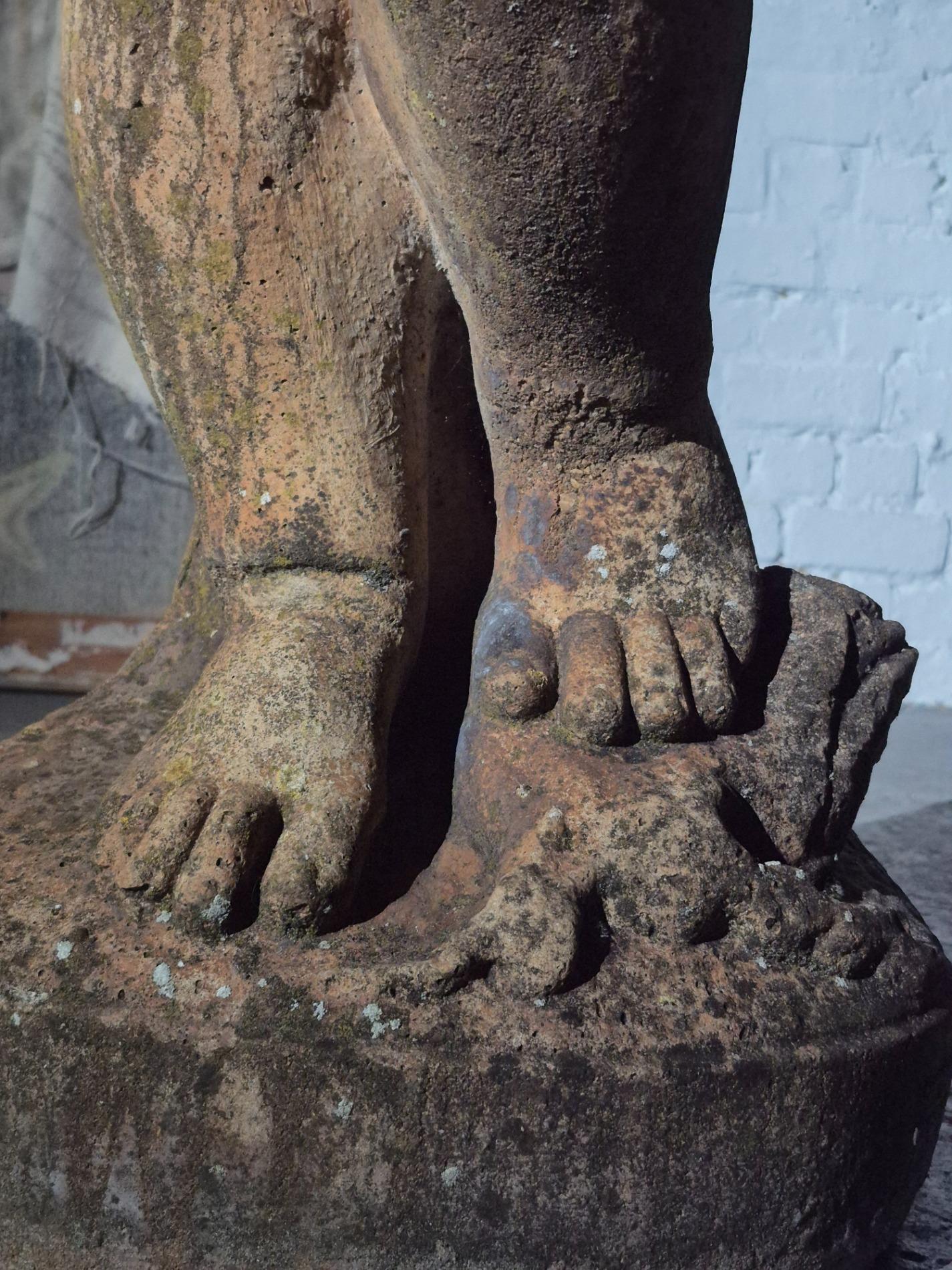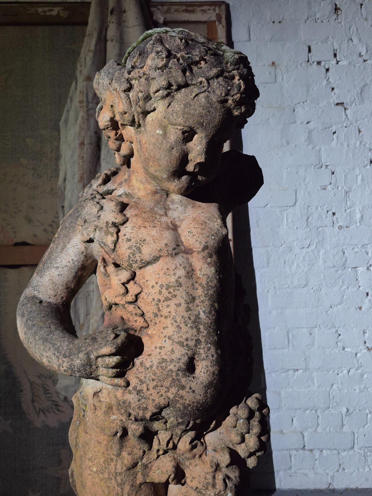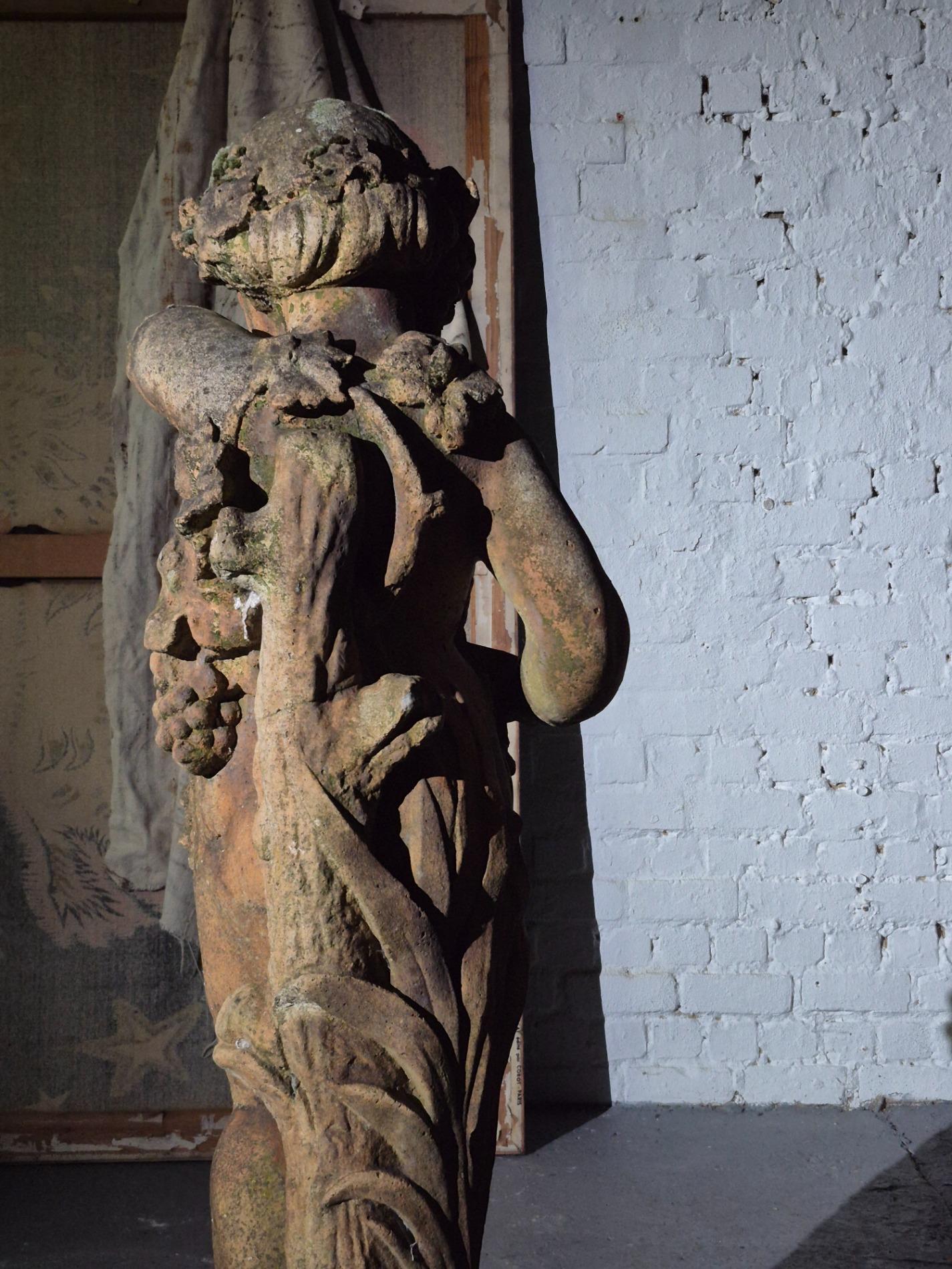 19th-century exceptionally large (136 cm) stone Putti. Made in Italy, and it has stood in a garden for many years, which has created a beautiful patina with moss. The sculpture is full of beautiful and refined details, such as the grapevine that gracefully winds around the body of the Putti, the tree trunk with leaves at the back of the sculpture, as well as the detailed anatomy of the figure and its serene expression.