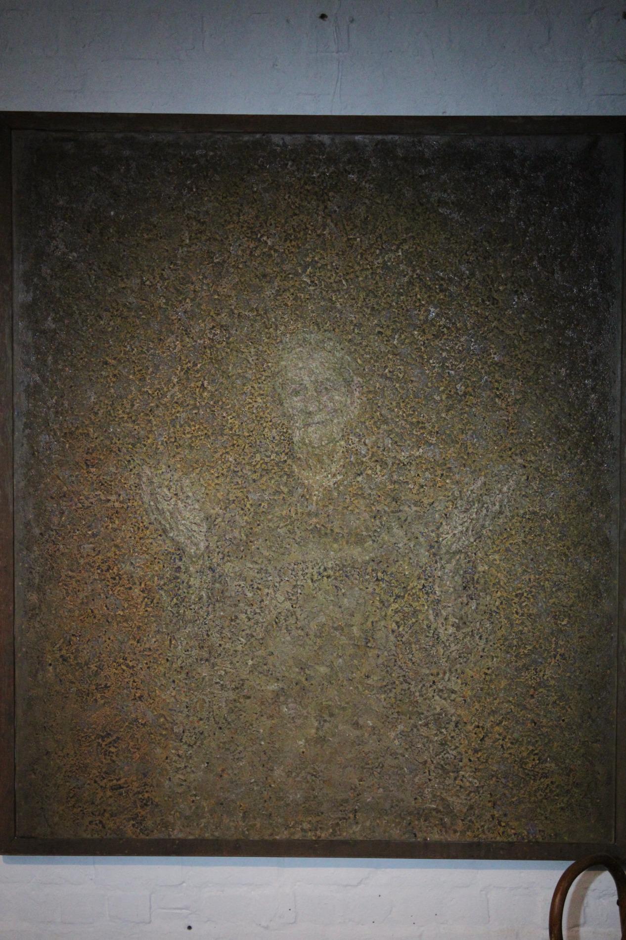 Monumental thick layered abstract painting titled 'The after'. Signed Louis De Maeyer 9 september 1937. Thick layered dots of oil paint on canvas which gives a very special brutal atmosphere. In the back of the painting you can see the appearance of a person. Louis De Maeyer was a Belgian artist born in Berchem near Antwerp in 1903 and died in 1981 in Terneuzen, the Netherlands. He was a painter who trained at the Academy and the Higher Institute in Antwerp under the direction of Is. Opsomer (1920 - 1926). Soon, light and matter will be the great poles around which his art will evolve.