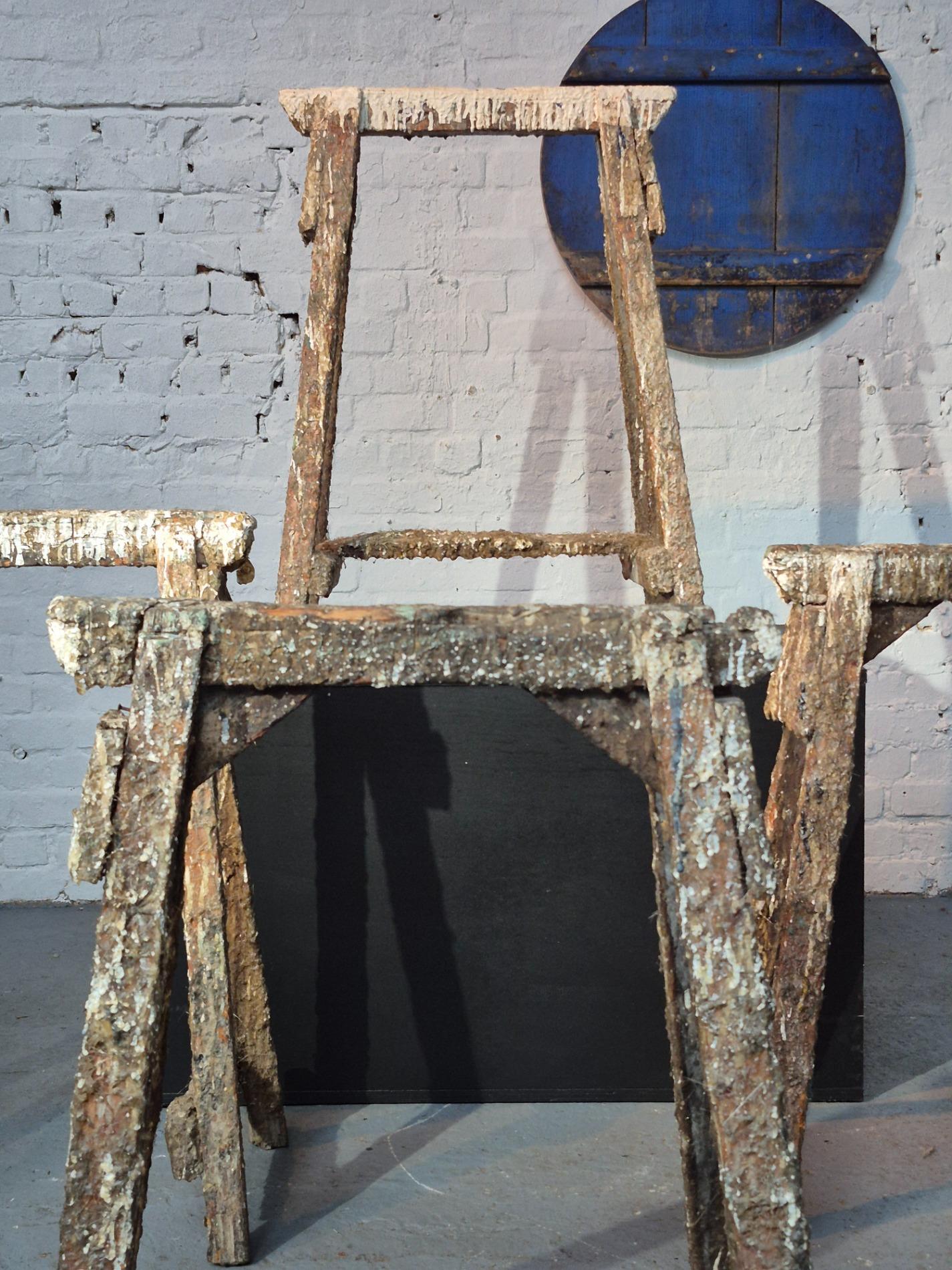 Set of 4 old artist workshop trestles. Made of wood with a thick layer of paint and polyester. Found in an old artist atelier in Belgium. These trestles went pieces of art through time and use.