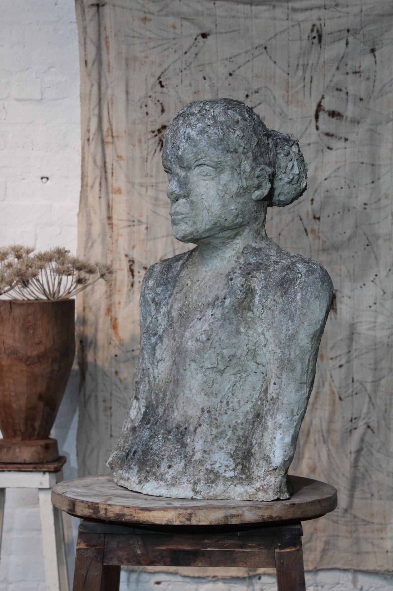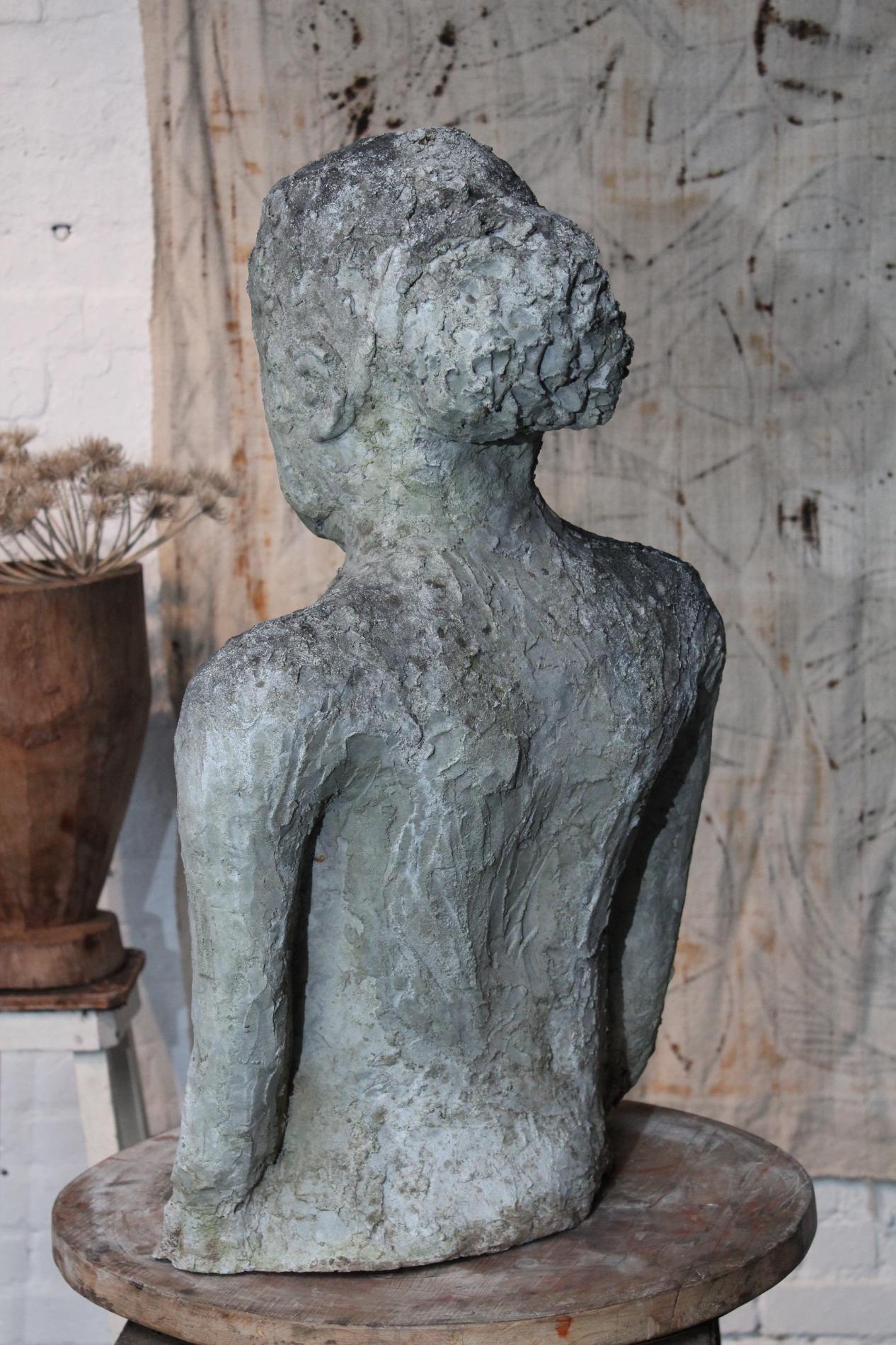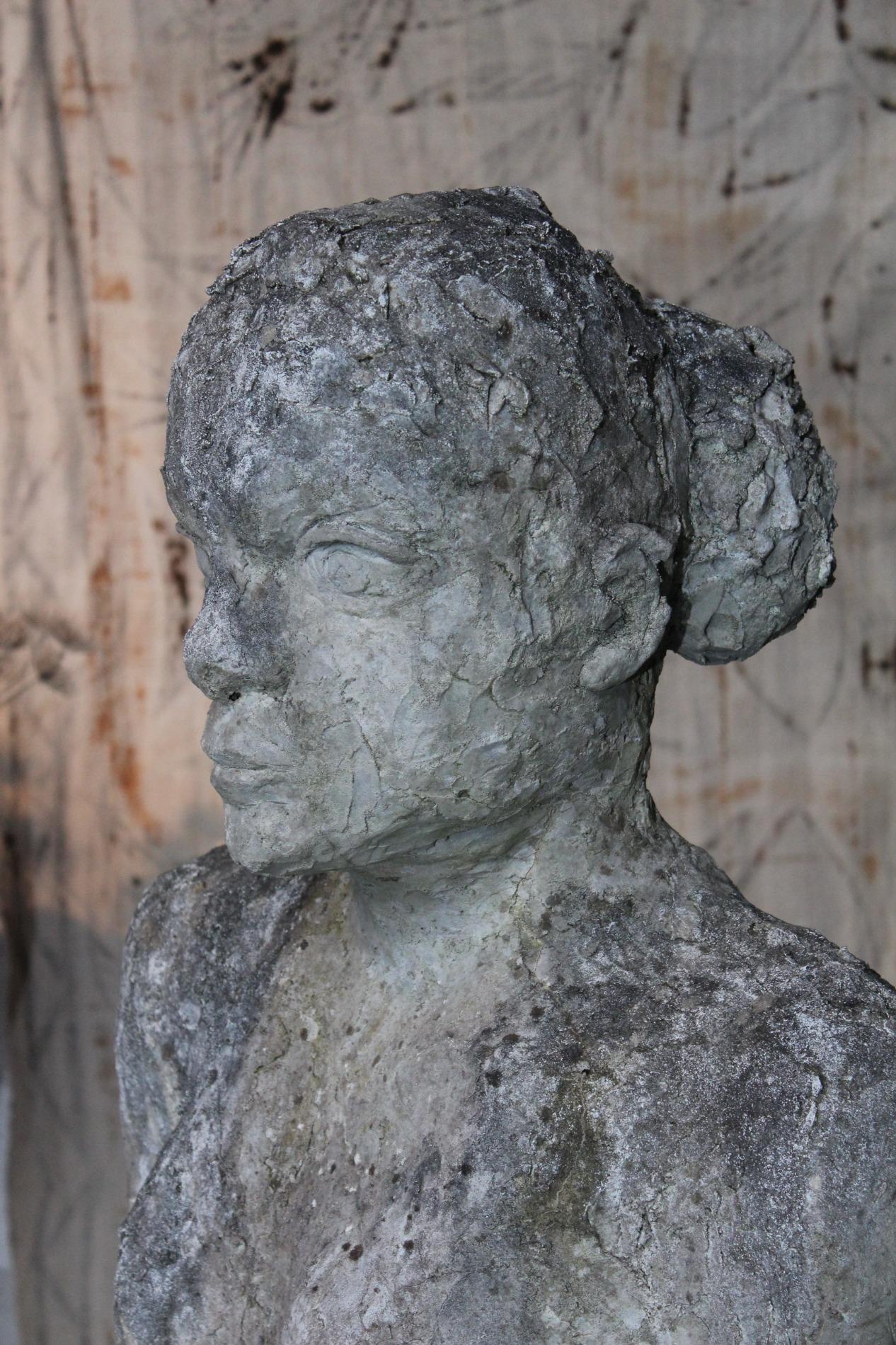 Artistic primitive study of a woman, made of terracotta on a metal base. Origin 1970s Belgium, and has been standing in a garden for years, the weather influences gives the sculpture a unique and amazing patina. The sculpture was hand sculpted and thick layered, which gives a lot of structure.