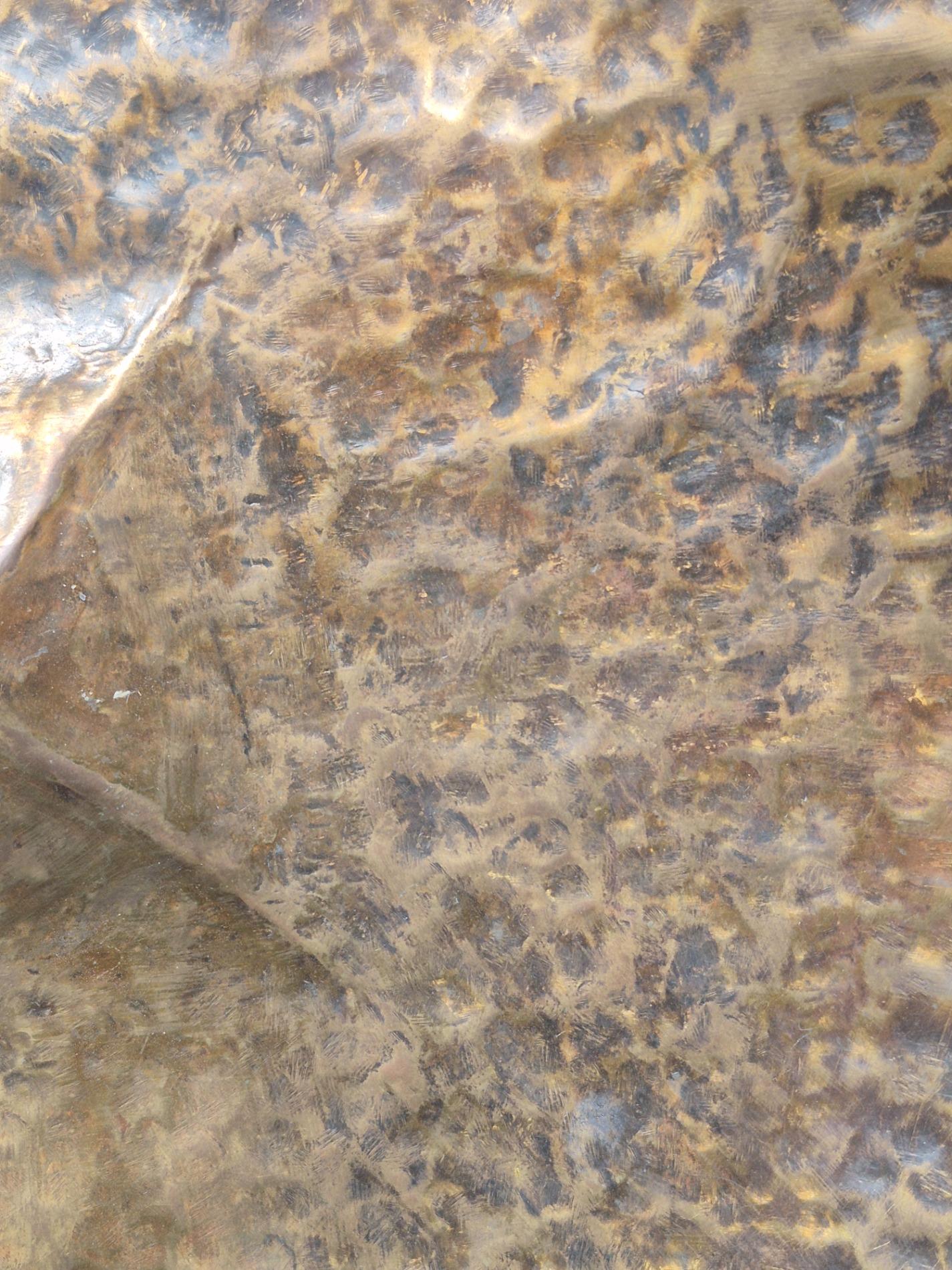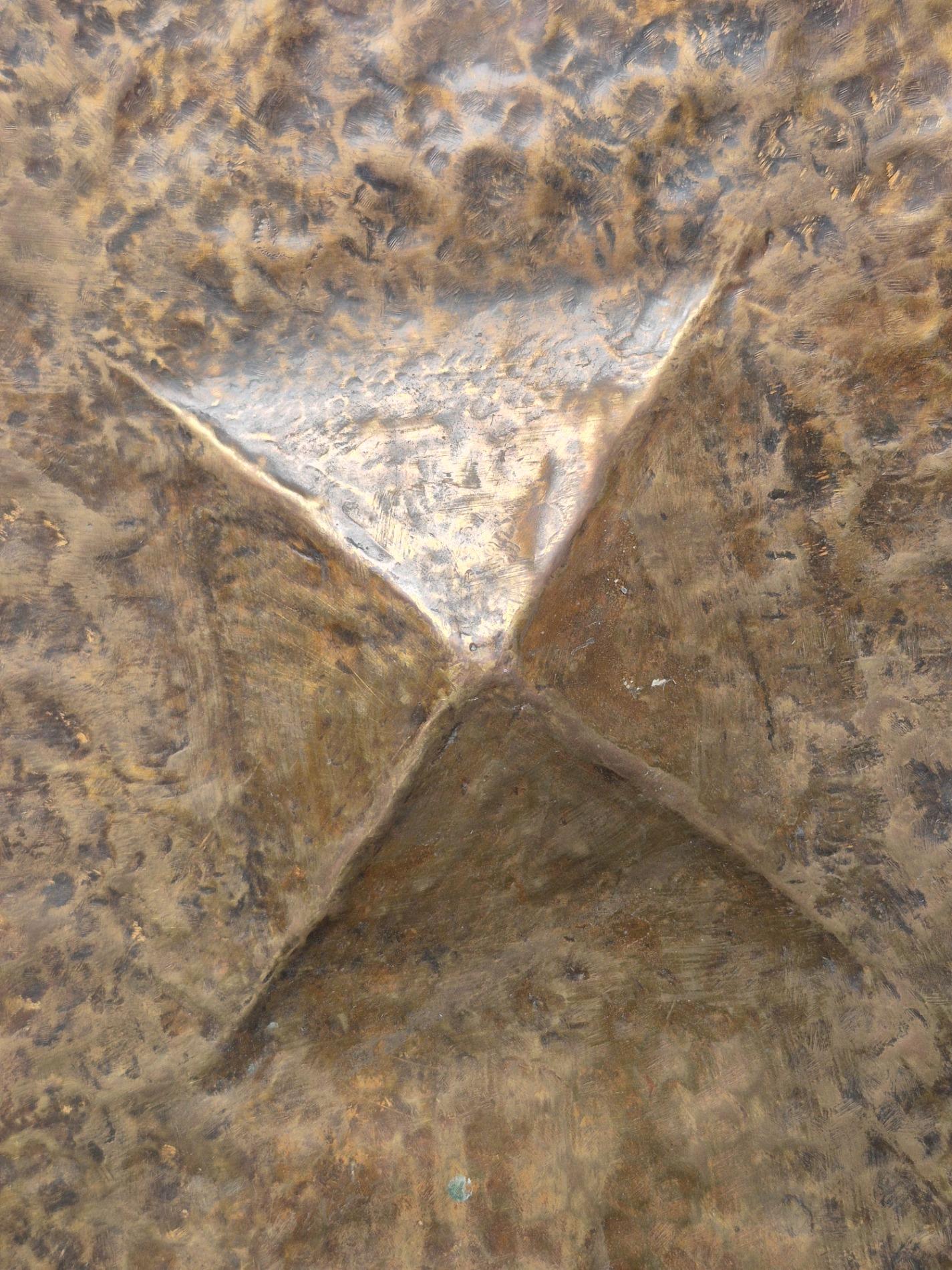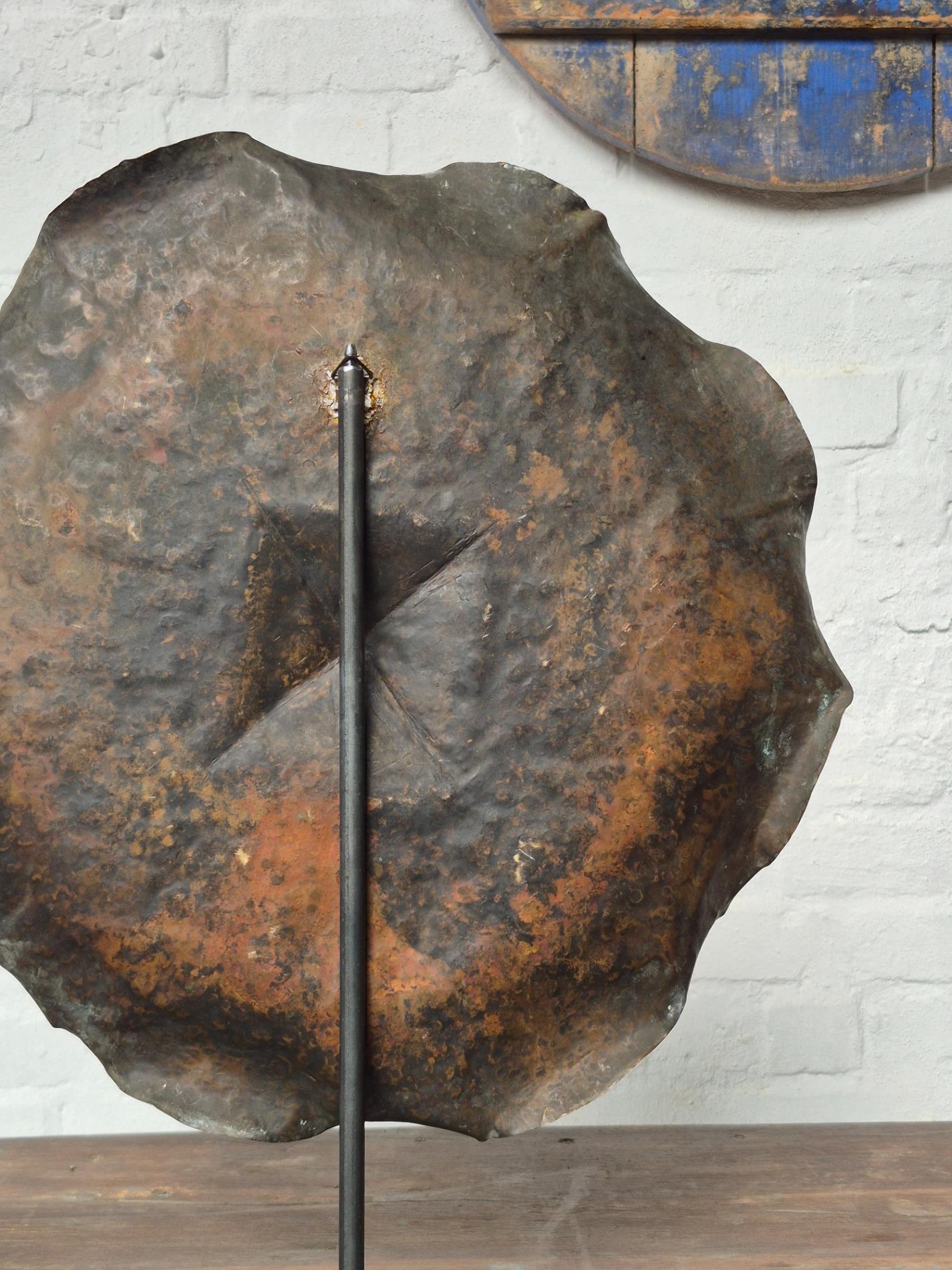 A brutalist sculpture made of hammered copper depicting a flower. A beautiful combination of raw hammered structures, old patina and solid design with curled edges. Belgium 1970s, comes with custom made metal display.