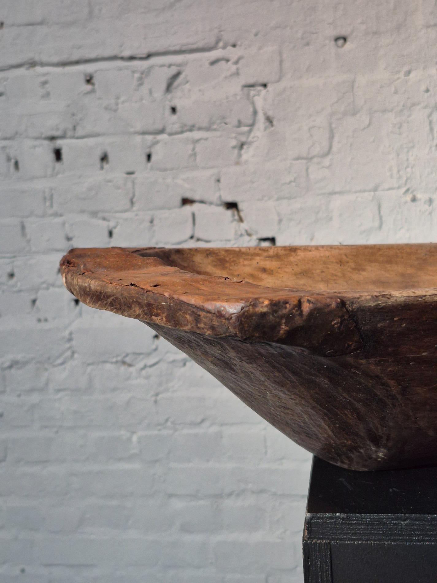 Large wooden trough, used by farmers in the 19th C. Nicely worn condition, with metal covered handles and carvings still visible.