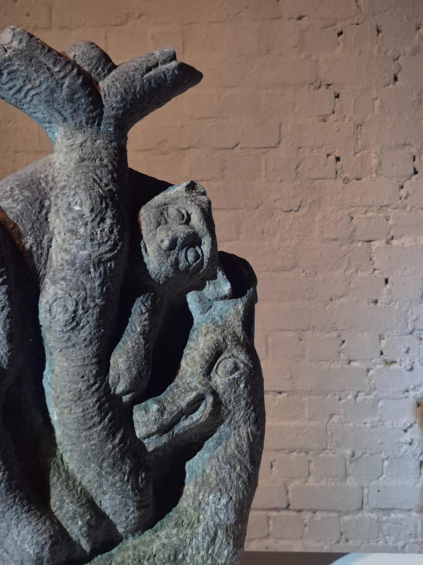 Late 17th C stone fragment of a mythical creature fighting with a deer, horse or unicorn around the tree.