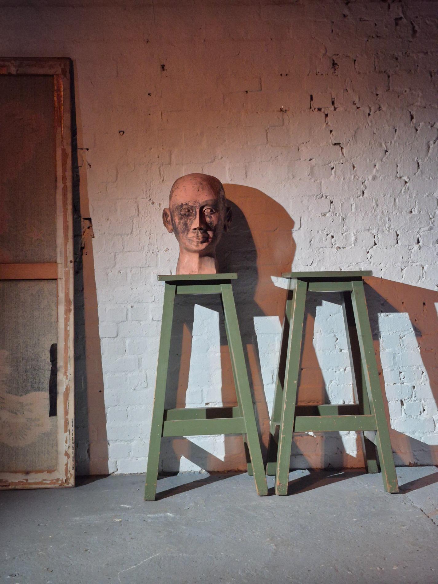 Green paint with nicely weathered patina. Asymetric design which gives the option to place them next to a wall.