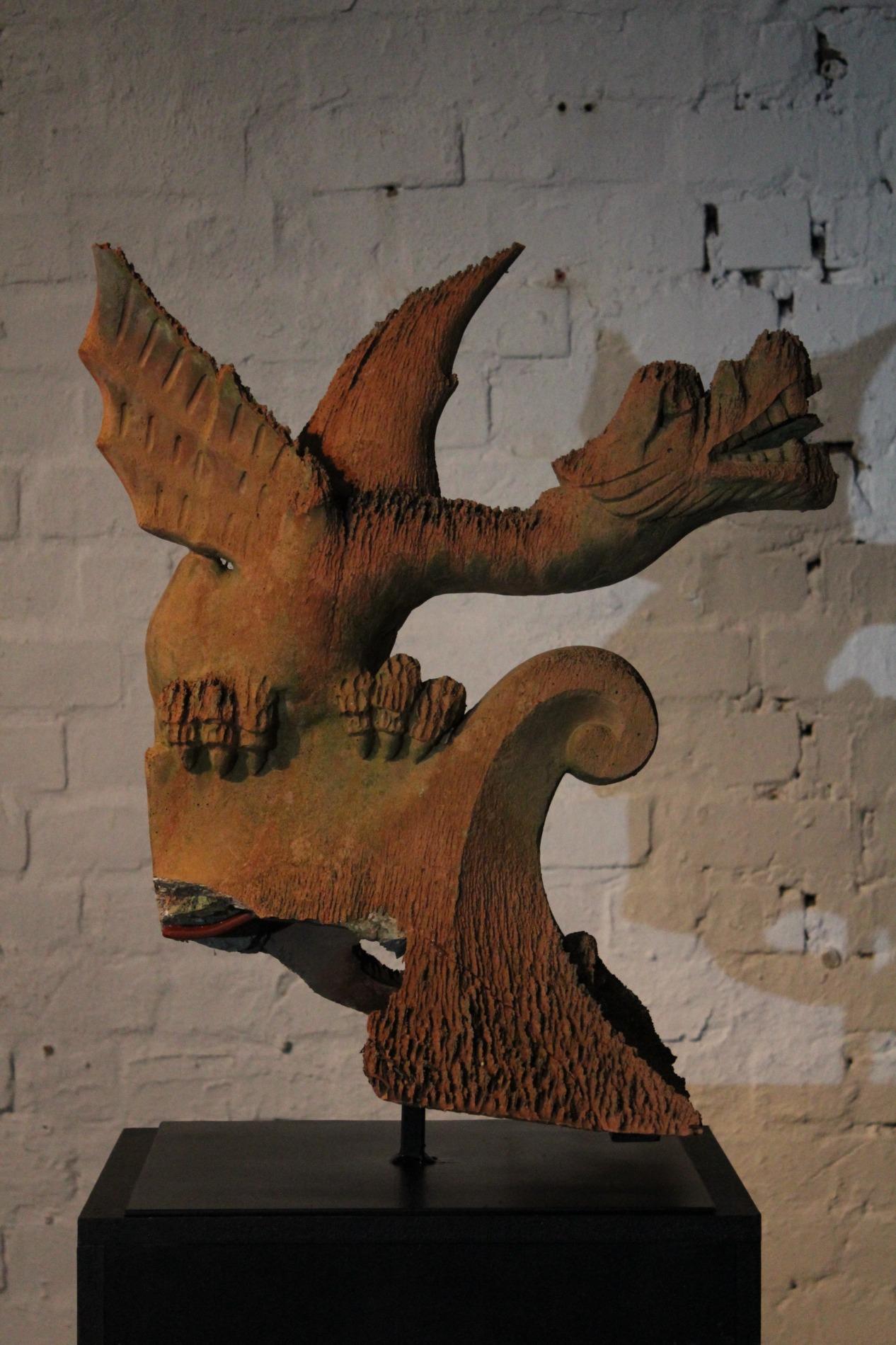 Old English terracotta dragon finial, in nicely weathered condition and shown on a custom made metal display. The decoration of the ridge of the roof and gables revived in the Victorian times. Before 1870's, in the gothic revival period the dragon and other figures were preferred to keep the evil spirits away. This custom probably originated in the Chinese belief.