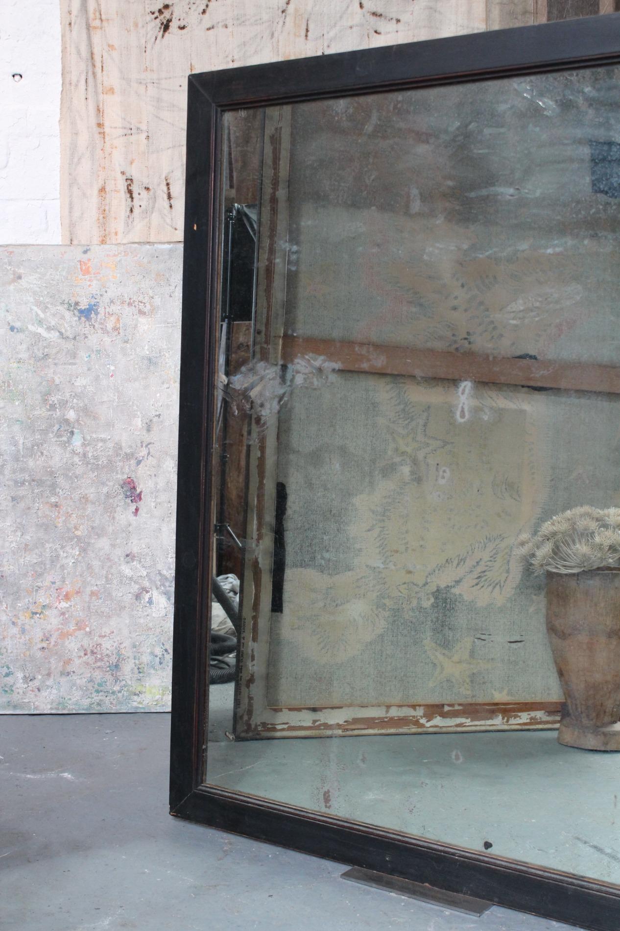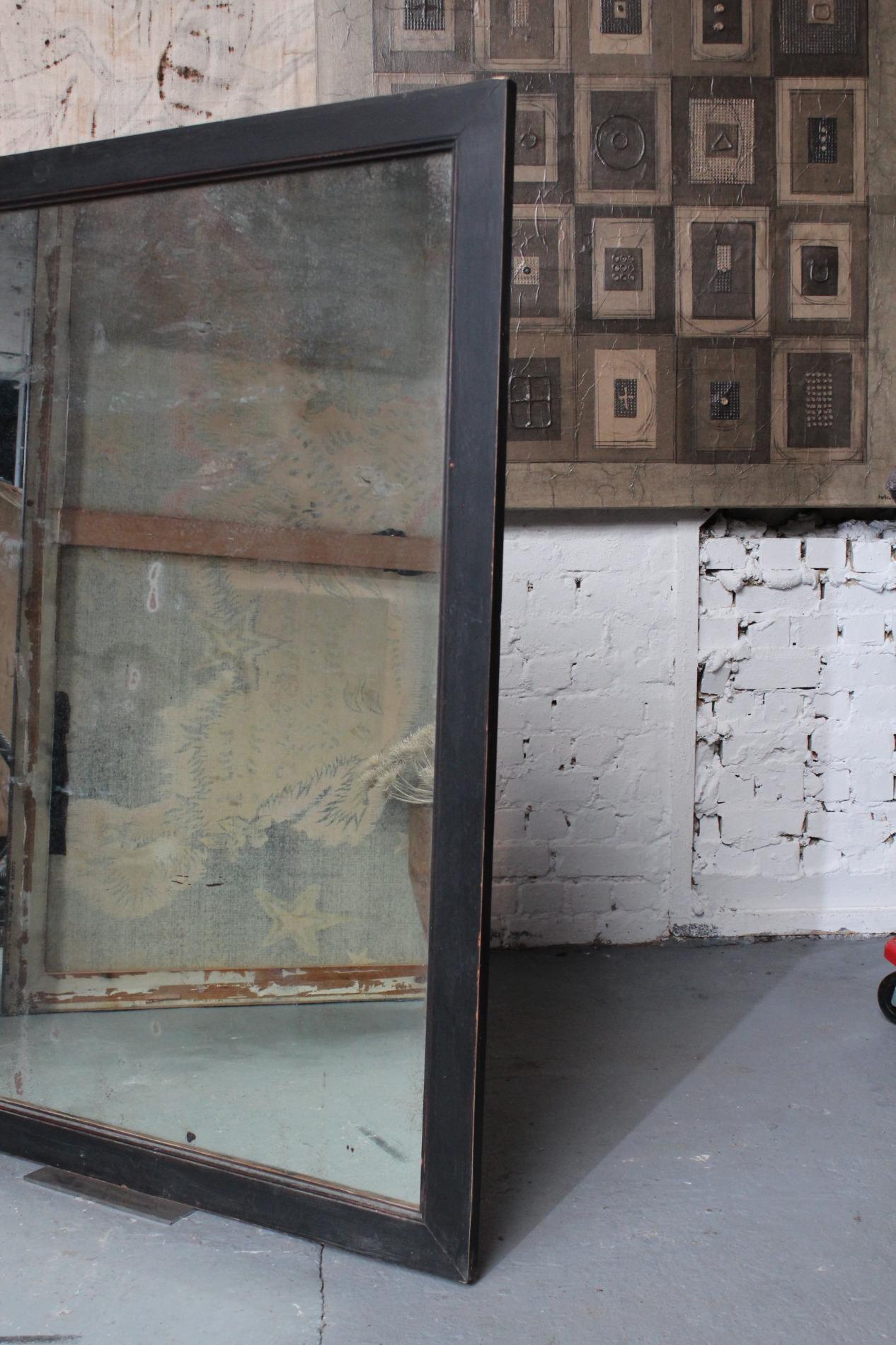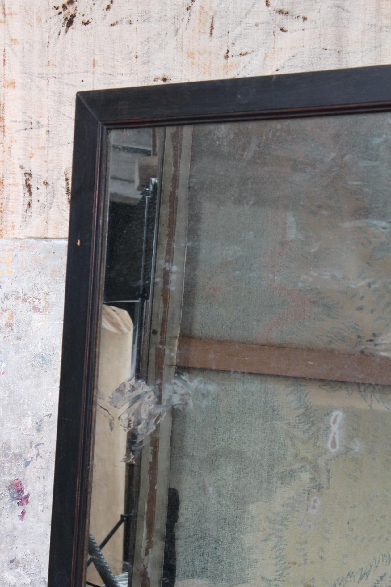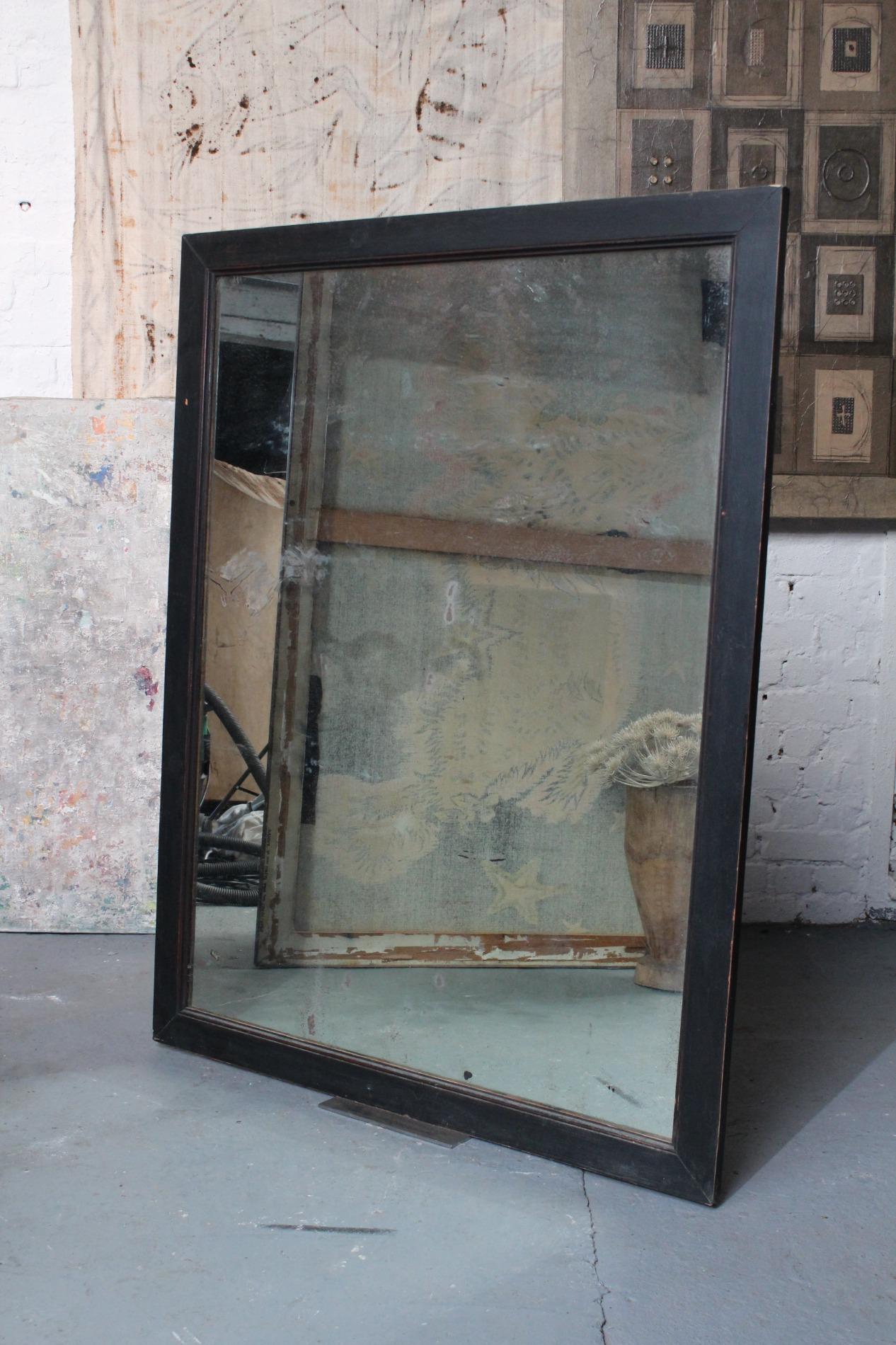 Old large bistro mirror, origin Paris France 1950s. Ebonised black classic frame with nicely worn end subtile patina. Original mirror glass in very good condition with nice patina on the glass. A mirror with lots of character.