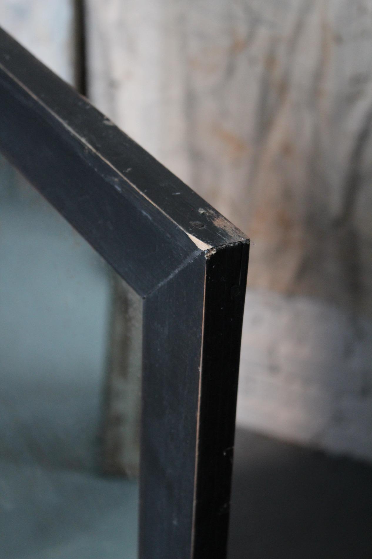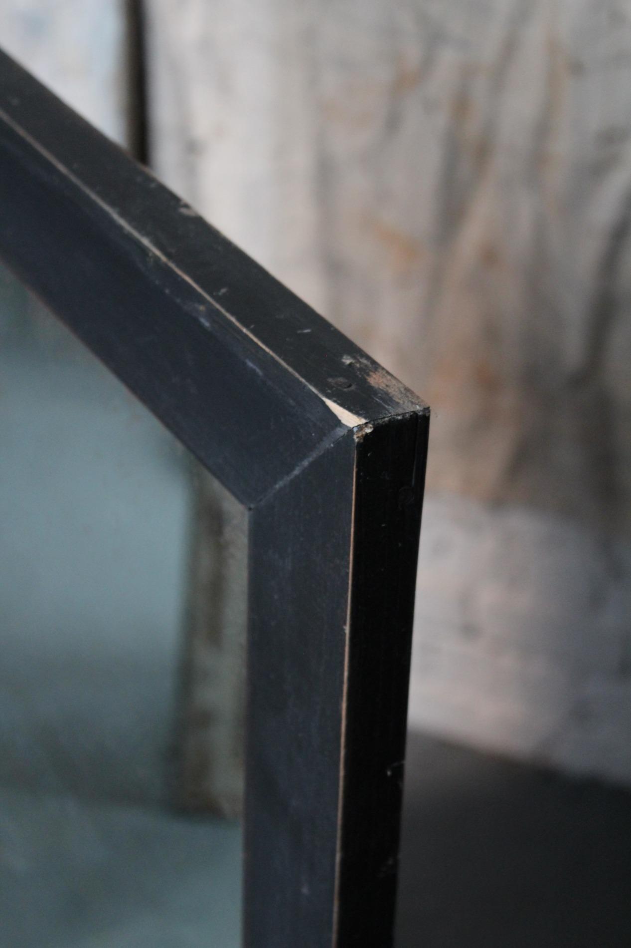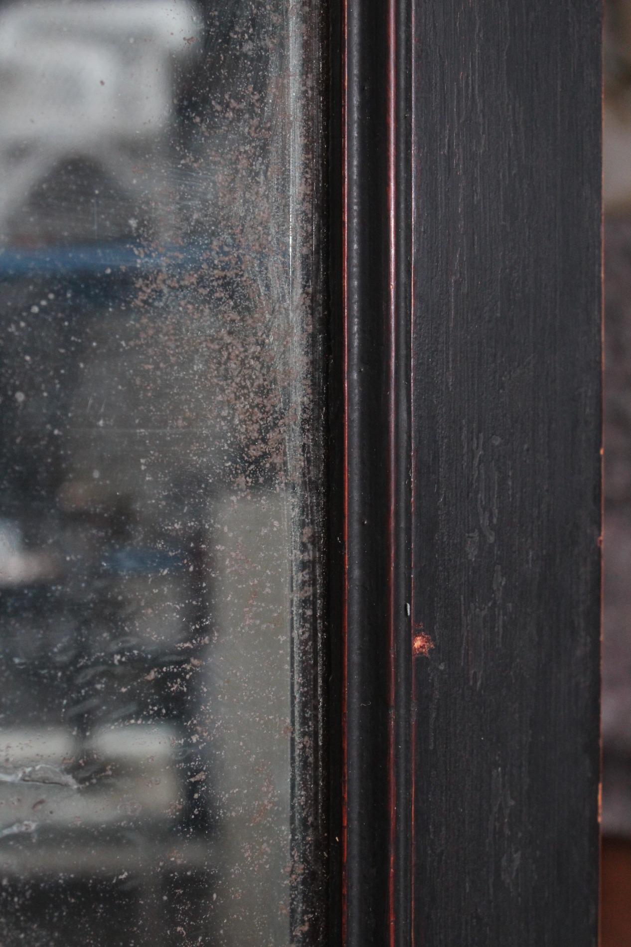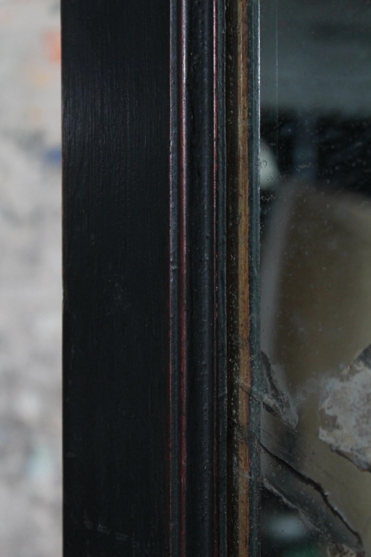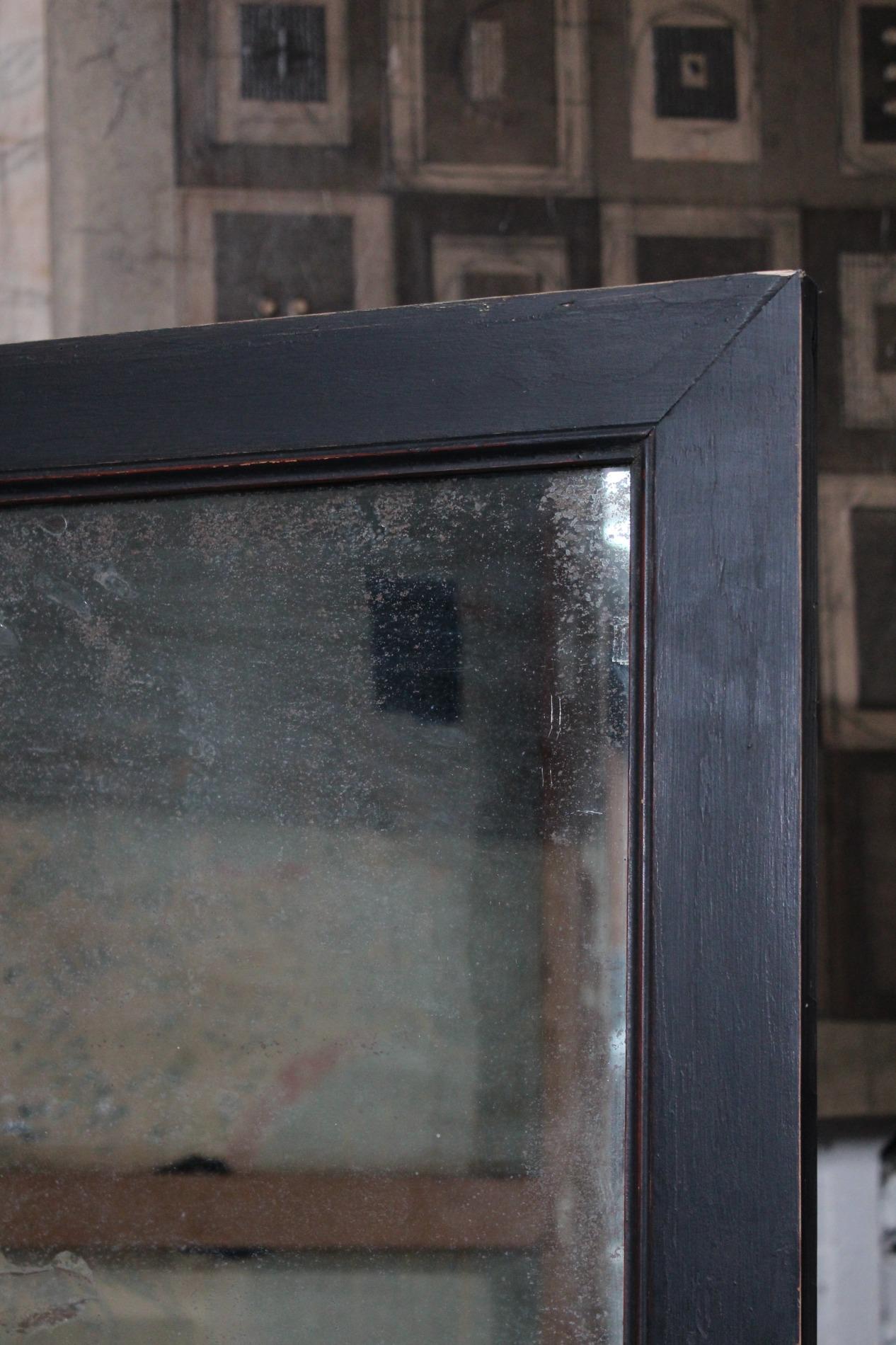Old large bistro mirror, origin Paris France 1950s. Ebonised black classic frame with nicely worn end subtile patina. Original mirror glass in very good condition with nice patina on the glass. A mirror with lots of character.