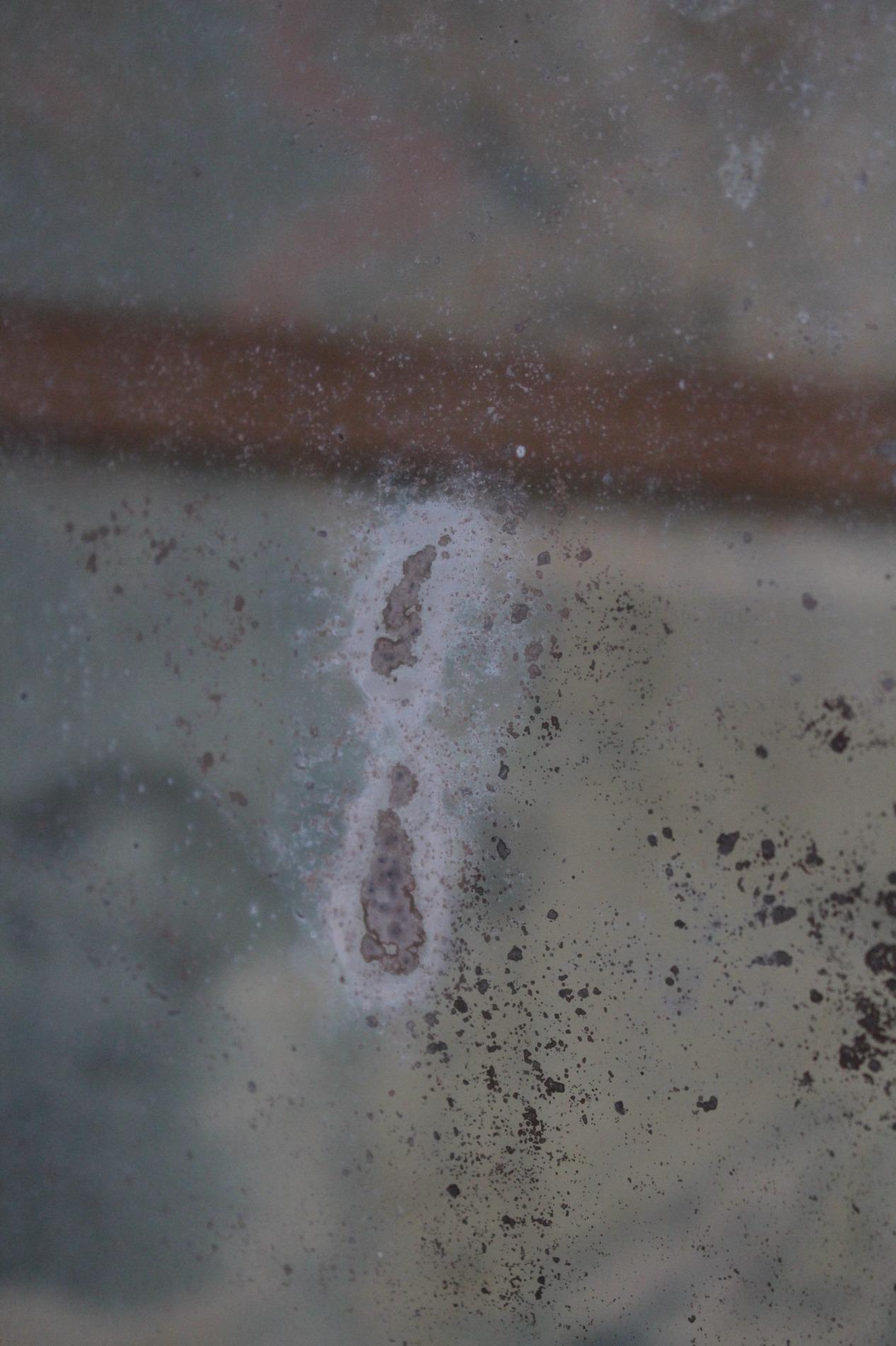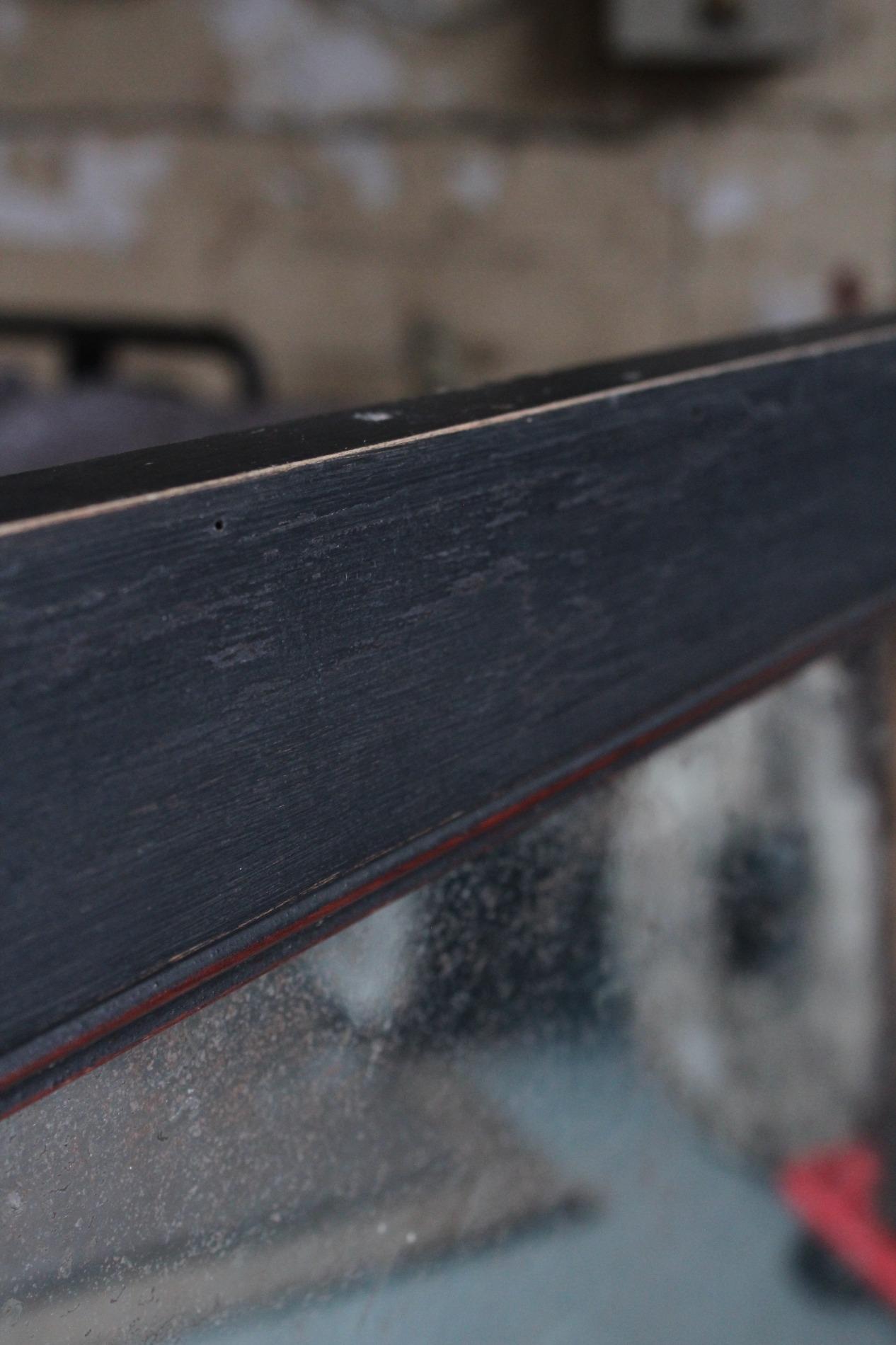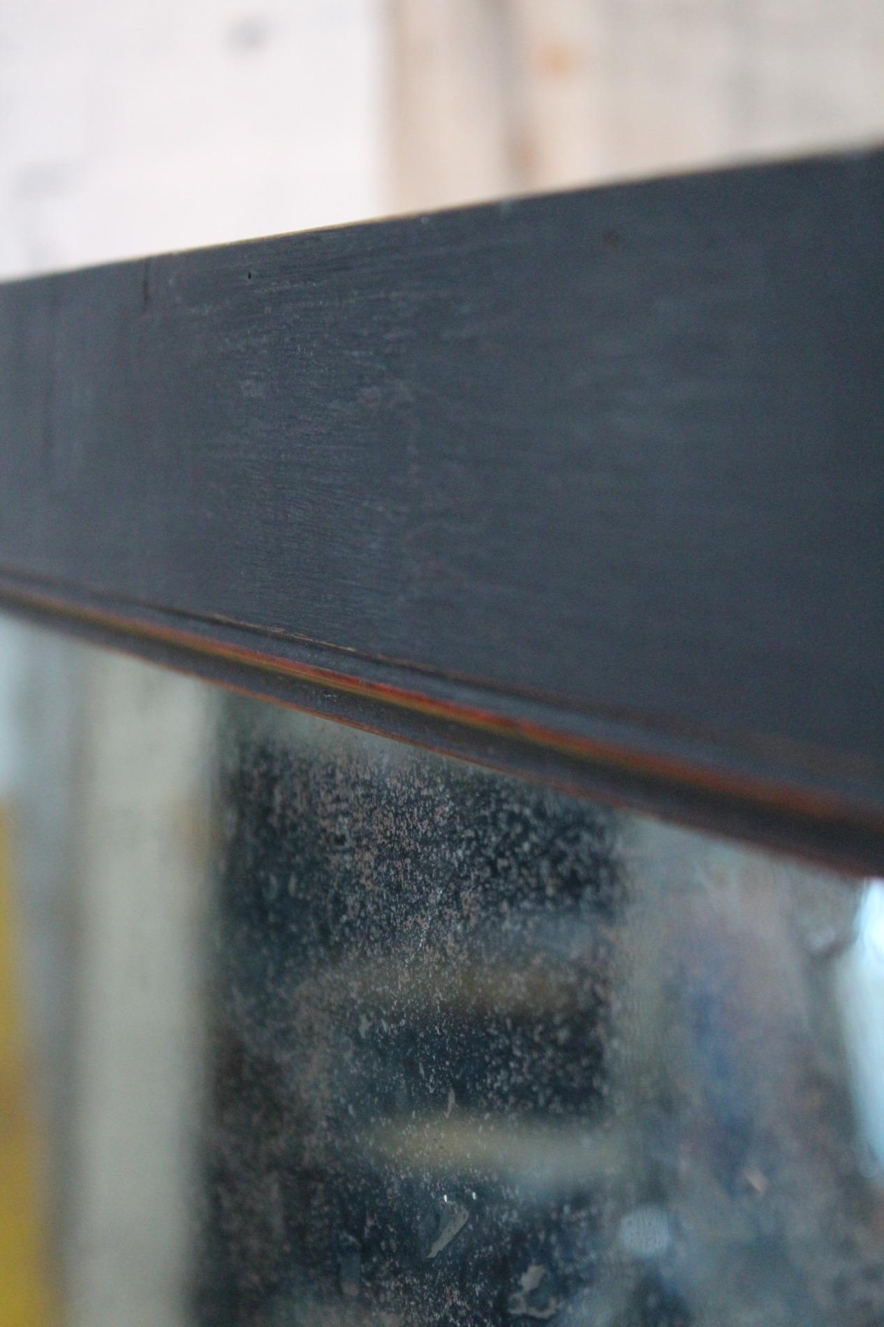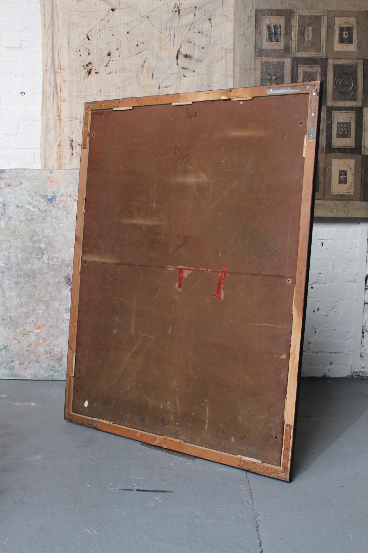 Old large bistro mirror, origin Paris France 1950s. Ebonised black classic frame with nicely worn end subtile patina. Original mirror glass in very good condition with nice patina on the glass. A mirror with lots of character.