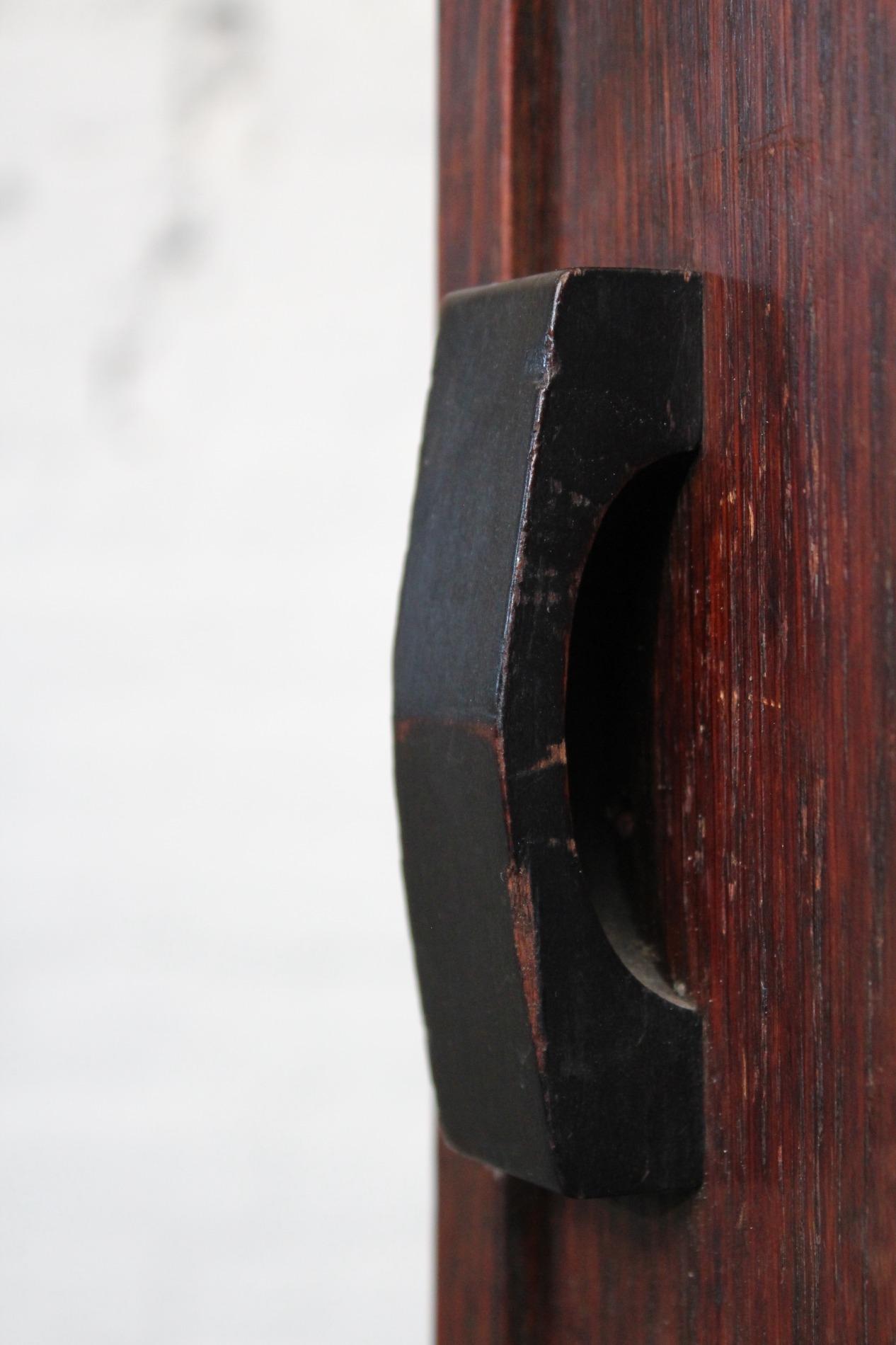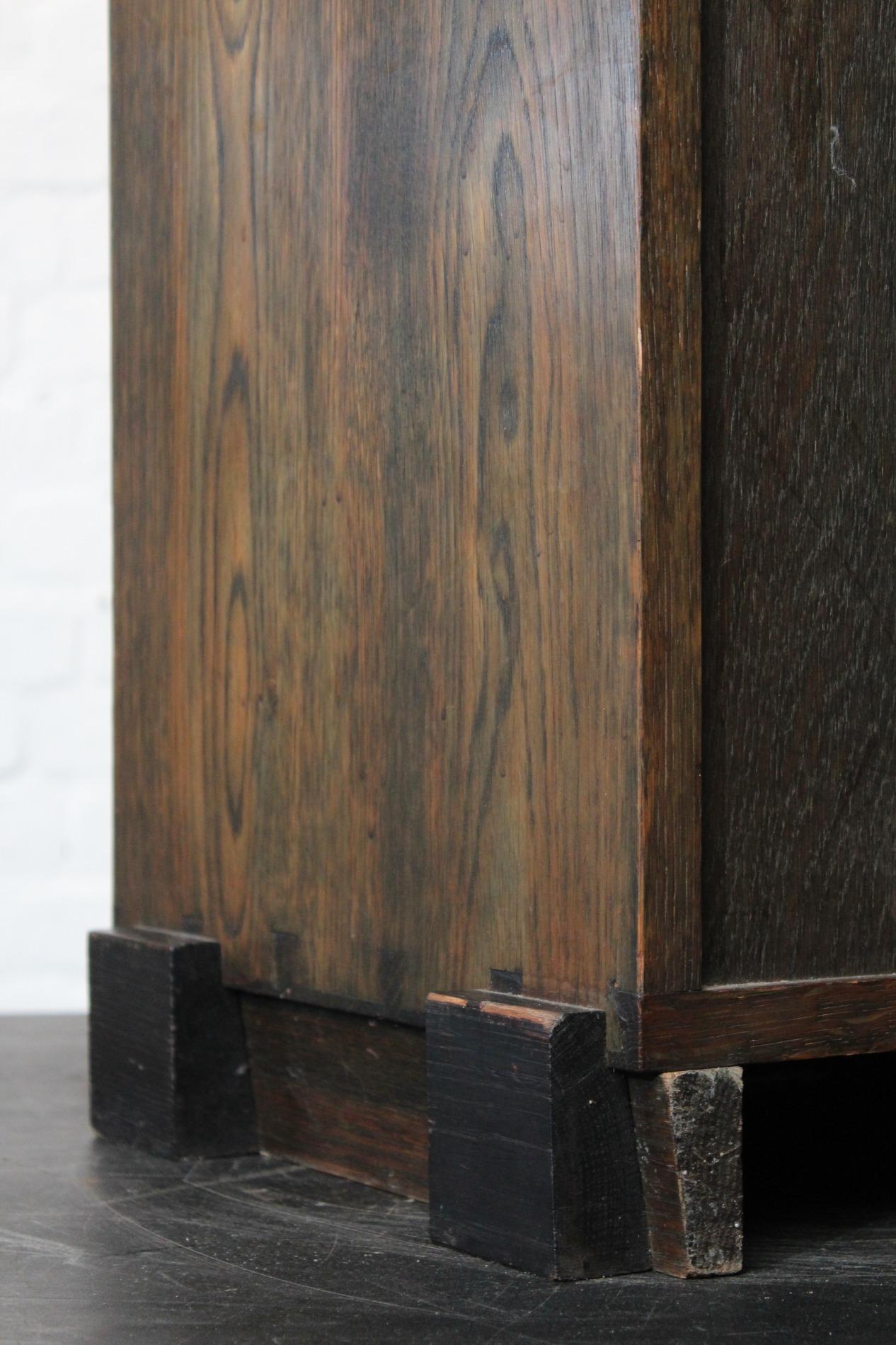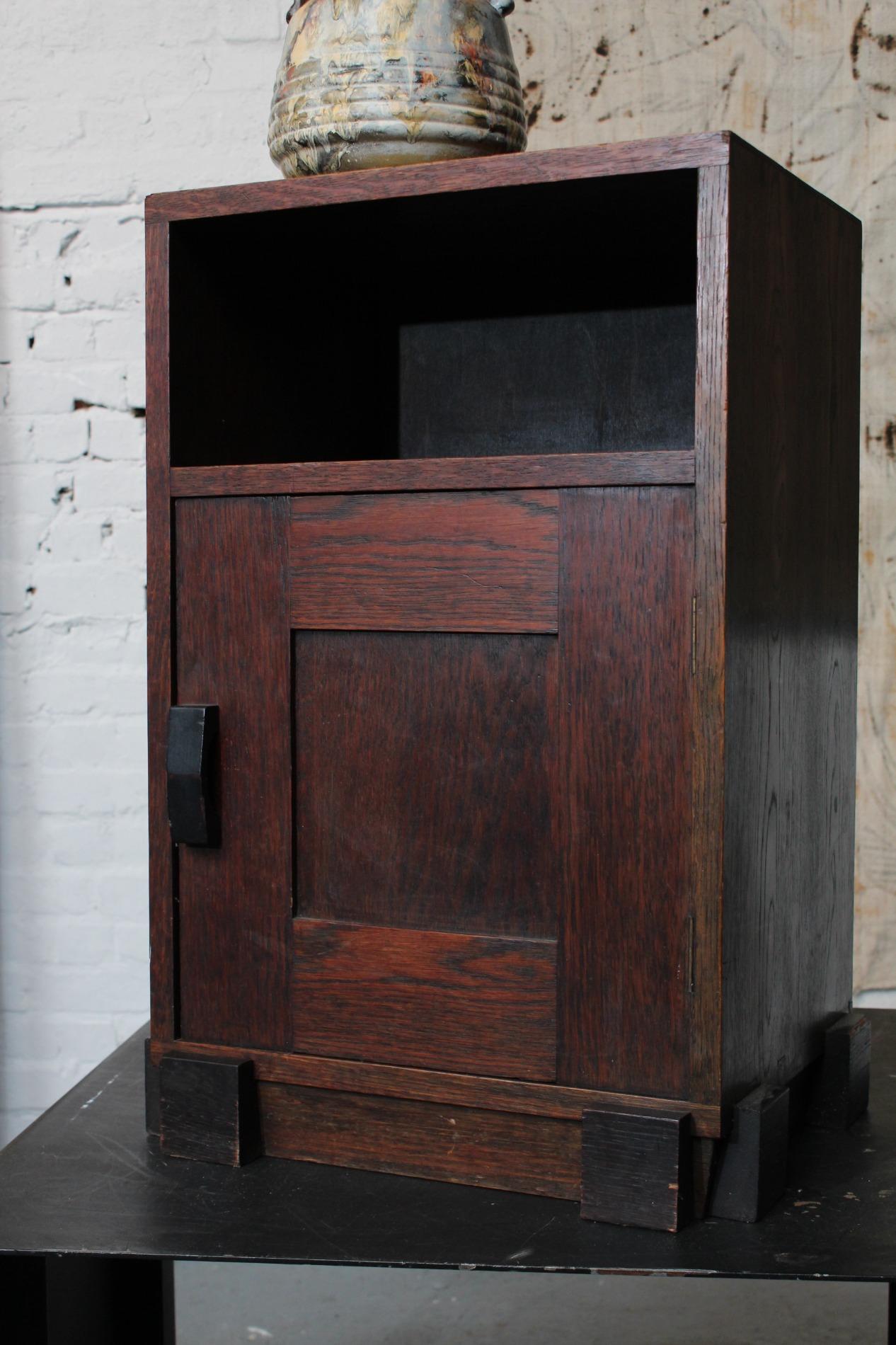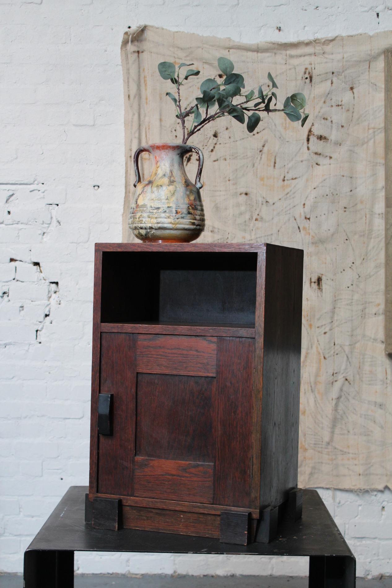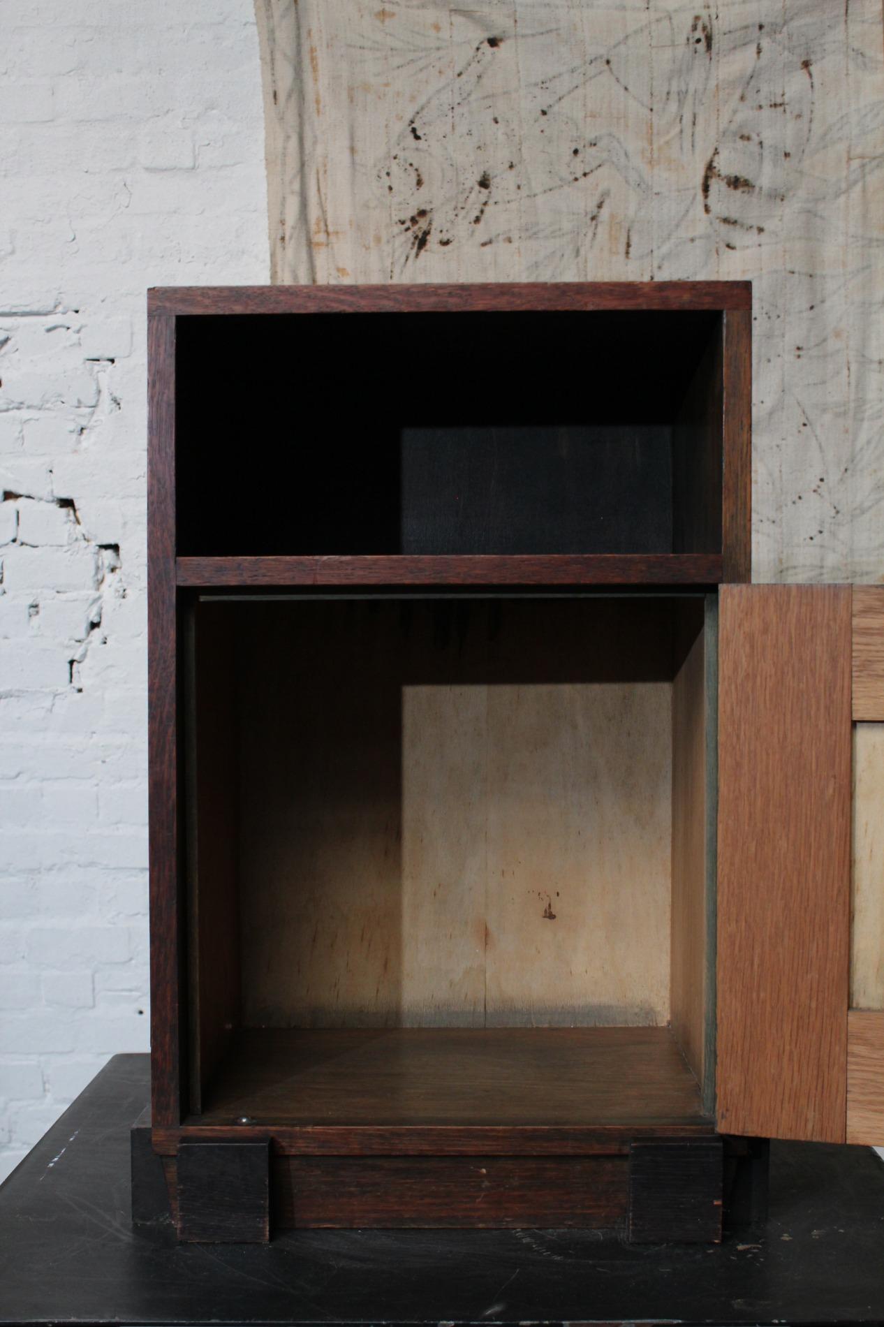 Original cabinet made by the 'Amsterdamse school'. In beautiful used condition with its typical strong straight lined design and cubic elements such as the 'cube' feet and the cubic door handle. Origin Holland 1920s