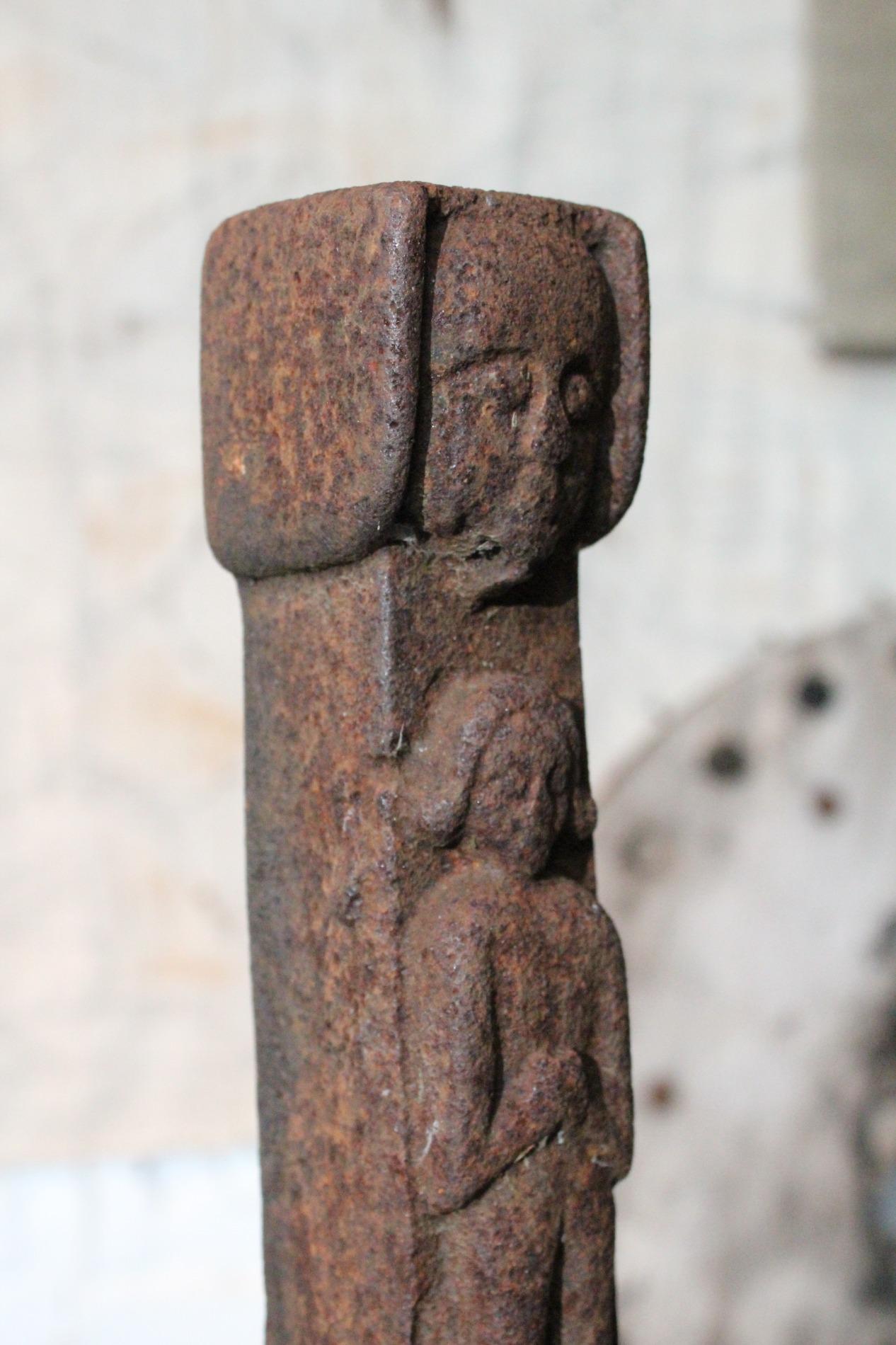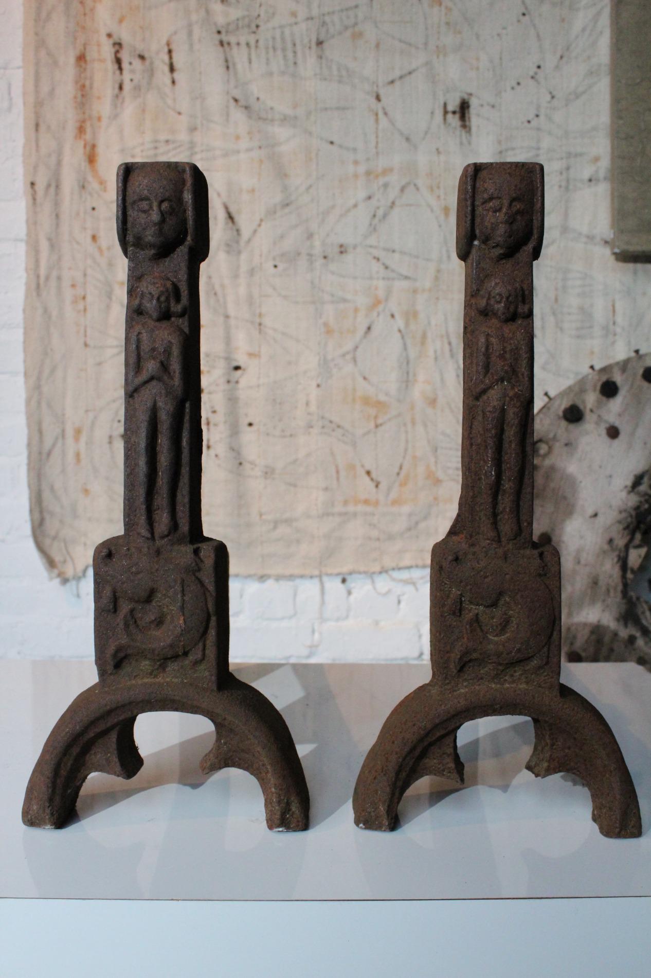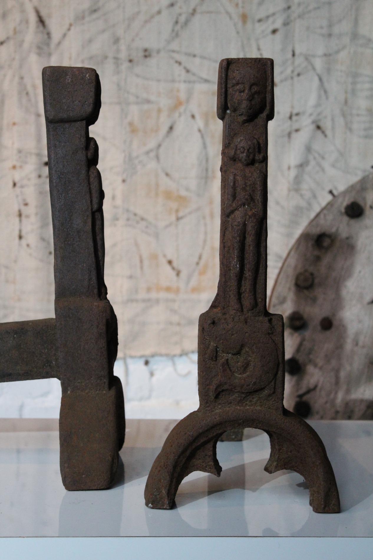Pair of atypical forged iron andirons. Depicting a face, a figure and a mythical creature. Origin France 18th C, shaped with gothic elements.