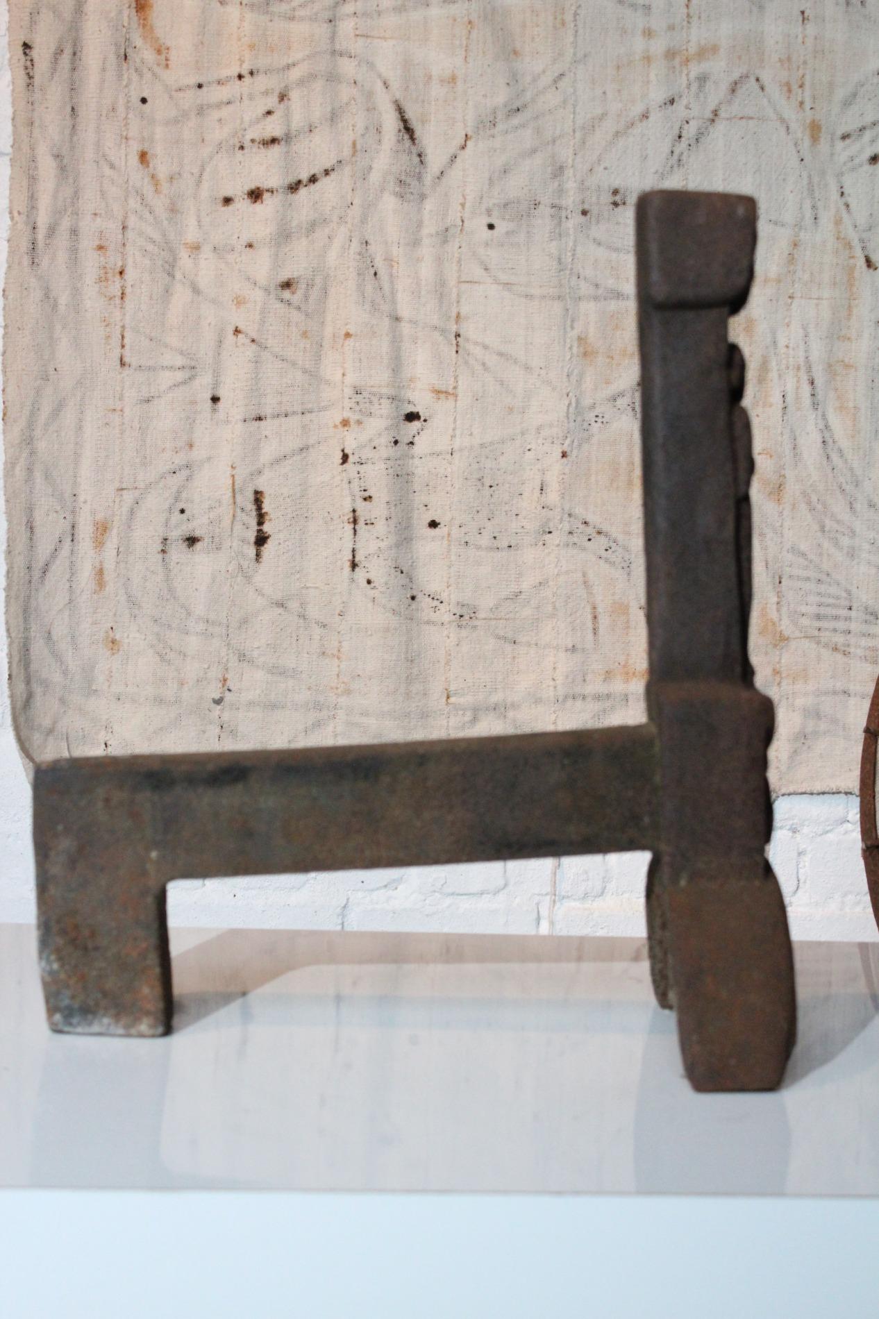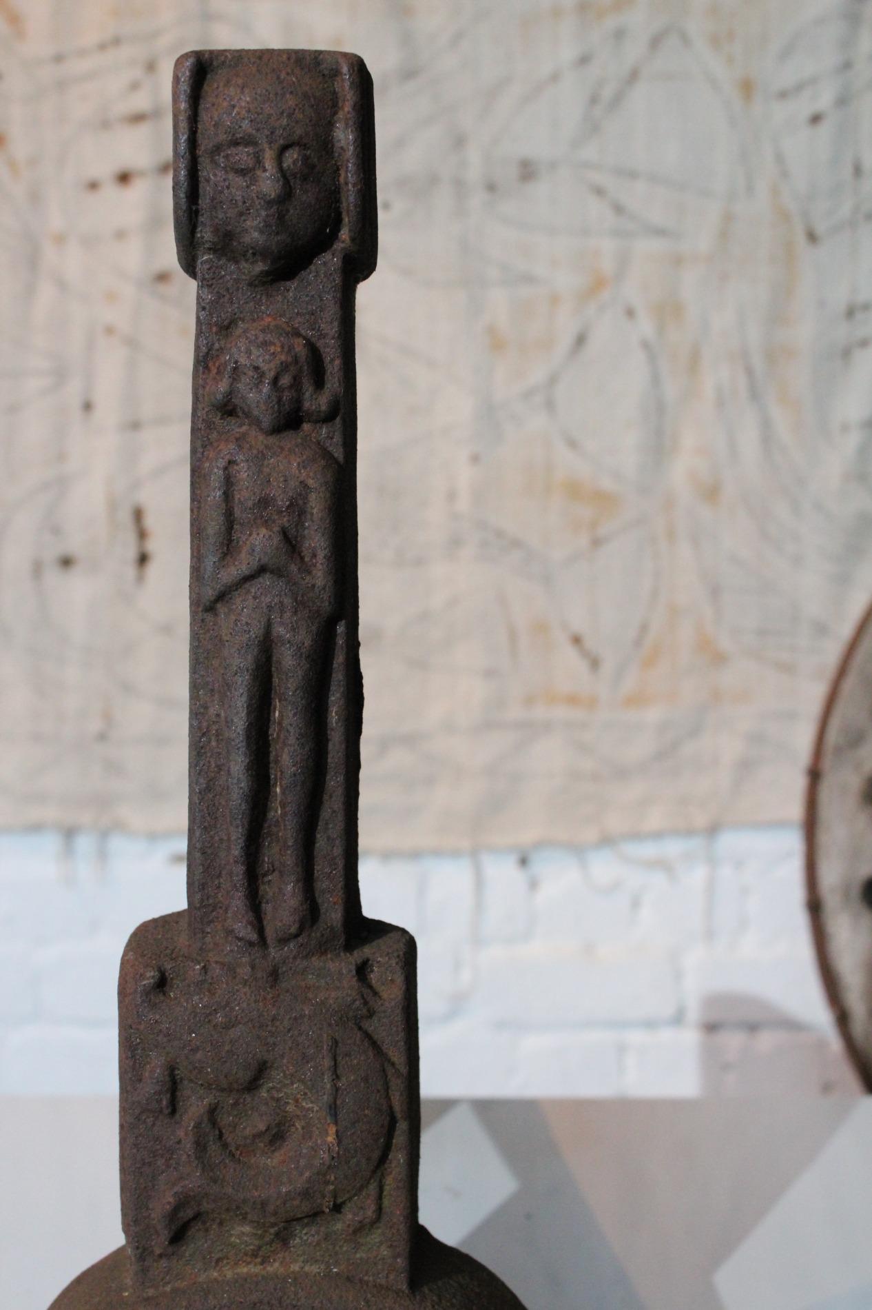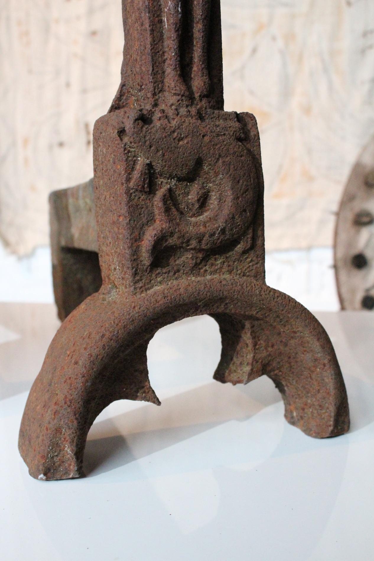 Pair of atypical forged iron andirons. Depicting a face, a figure and a mythical creature. Origin France 18th C, shaped with gothic elements.