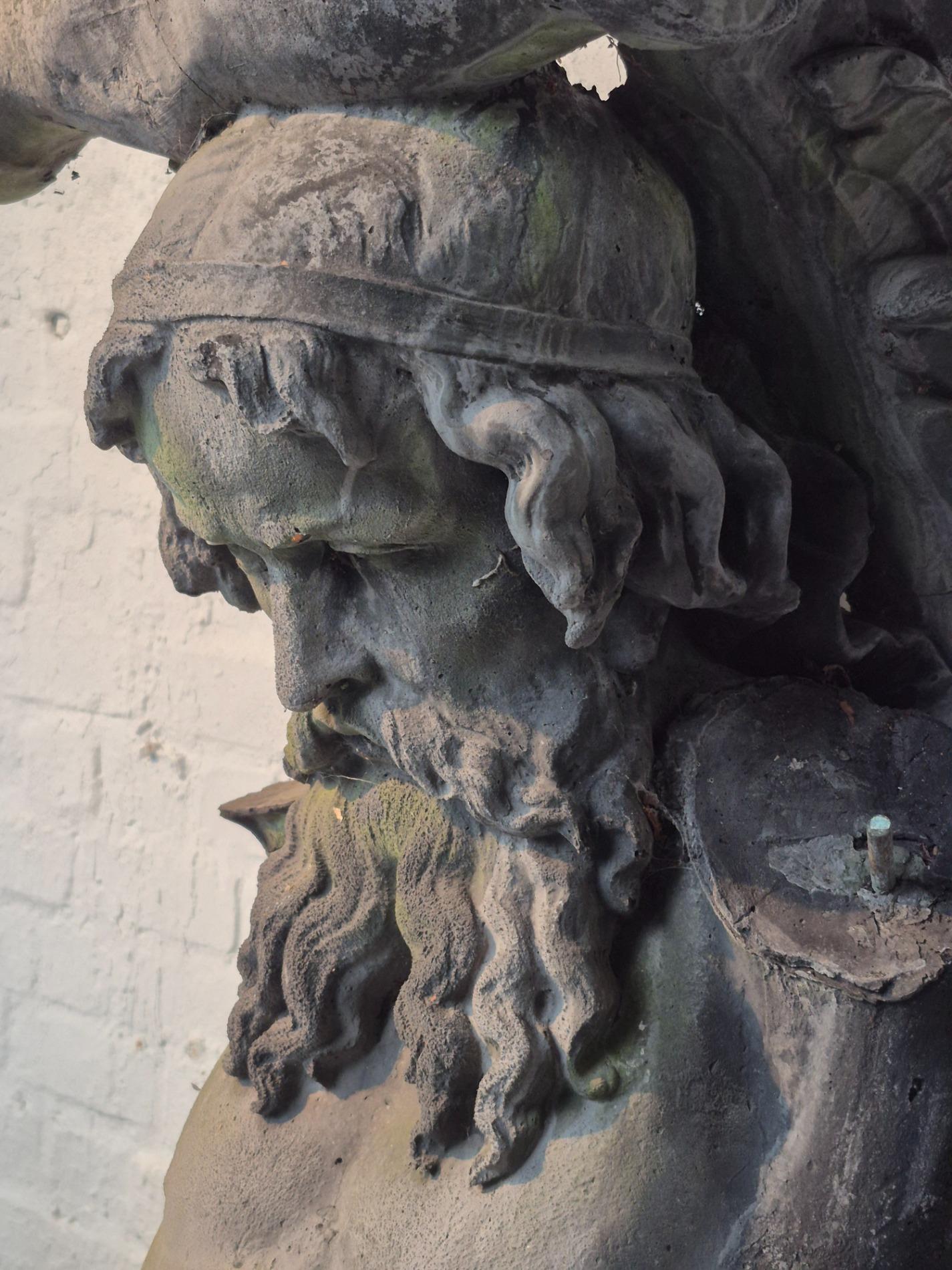 Pair of old cariatides depicting two mythological figures. Made in the 1960s as theatre props. Material is a mix of cement and plaster and with a metal structure inside. Weathered patina from hanging outside.