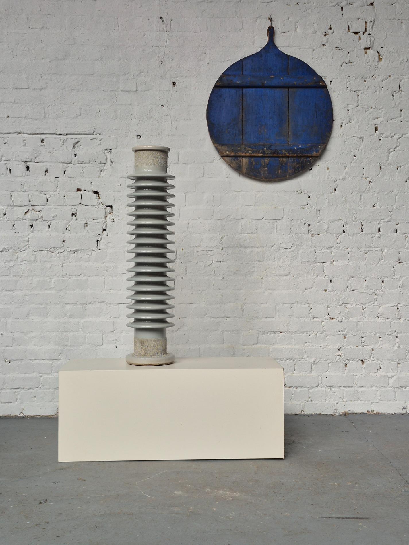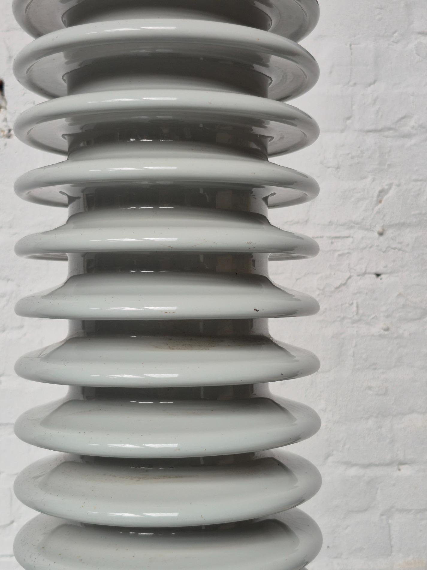 Old industrial sculpture made of porcelaine. This piece of industrial art has been used for many years as a high voltage isolator. A very decorative and geometric designed piece.