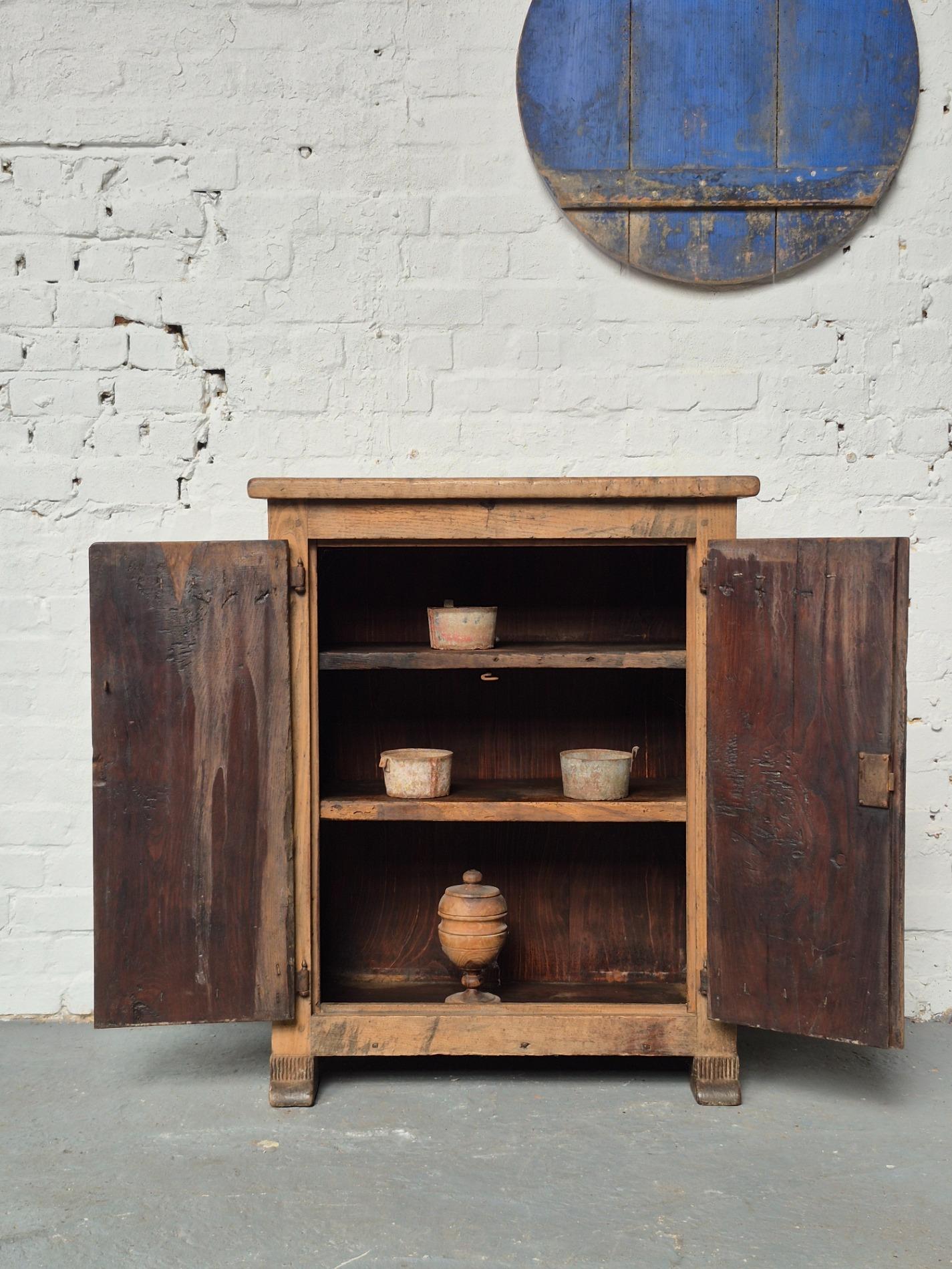 Primitive antique French folk art wooden cabinet, depicting 2 funny birds in the doors. Nicely weathered condition.