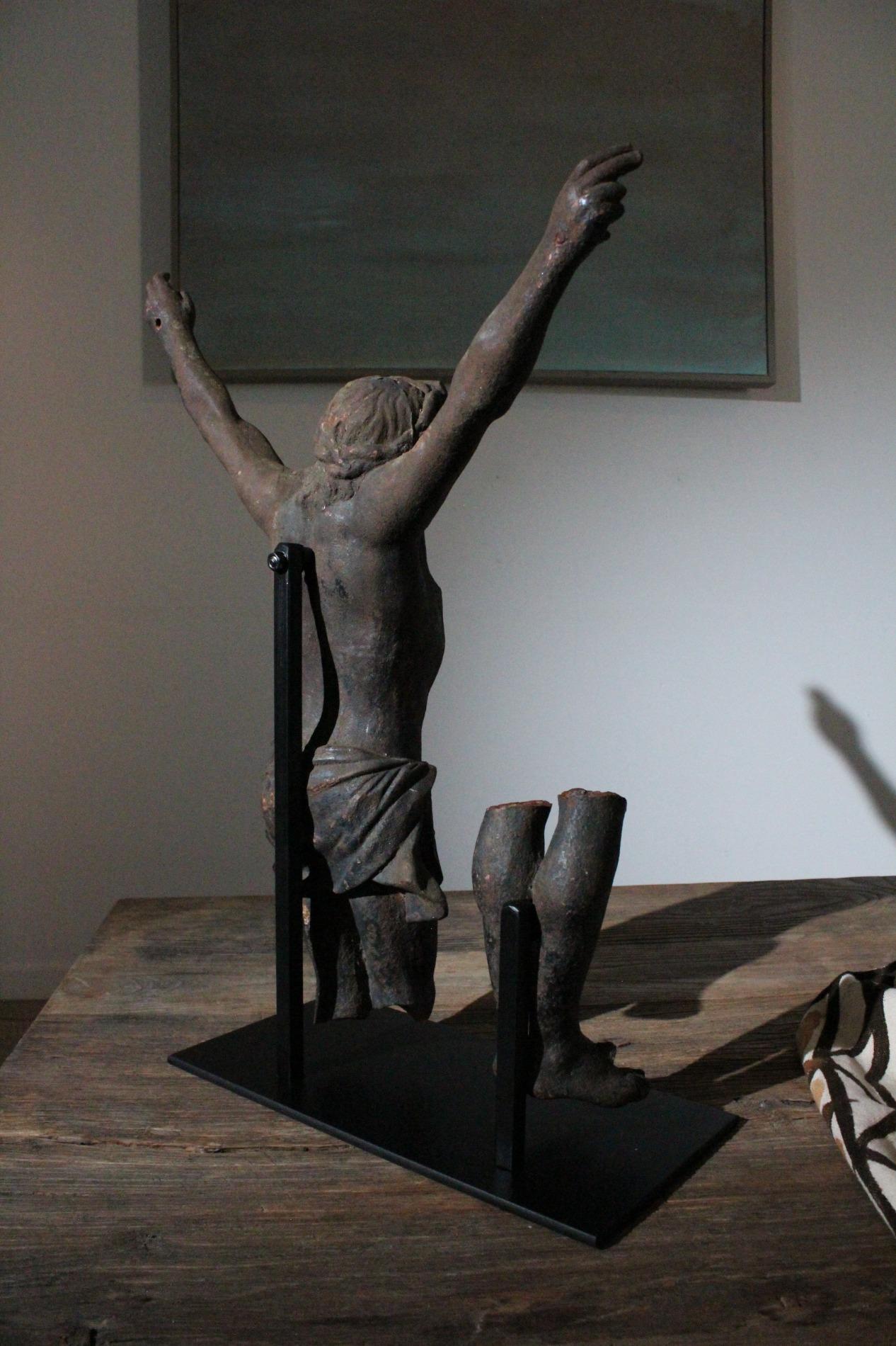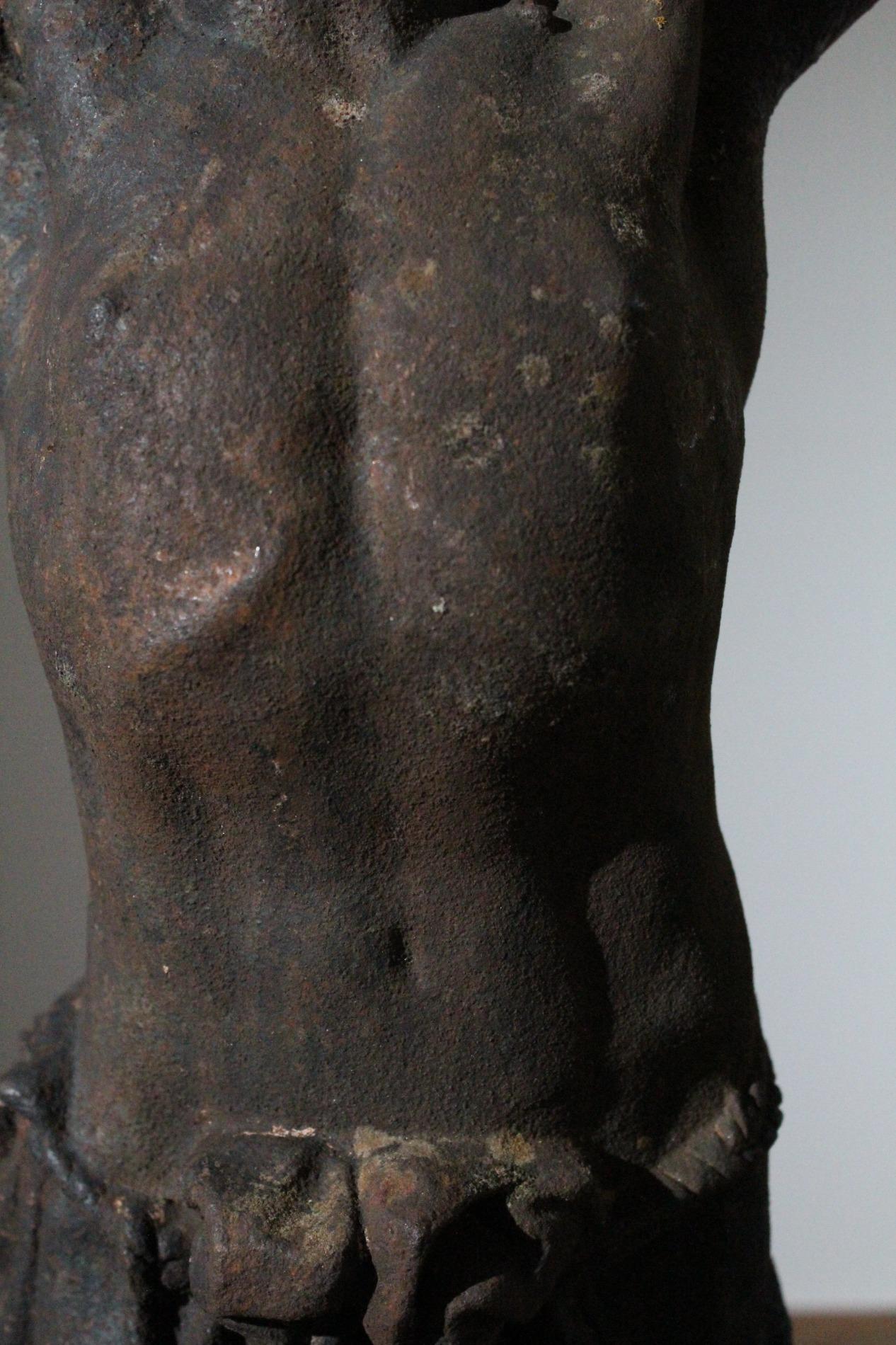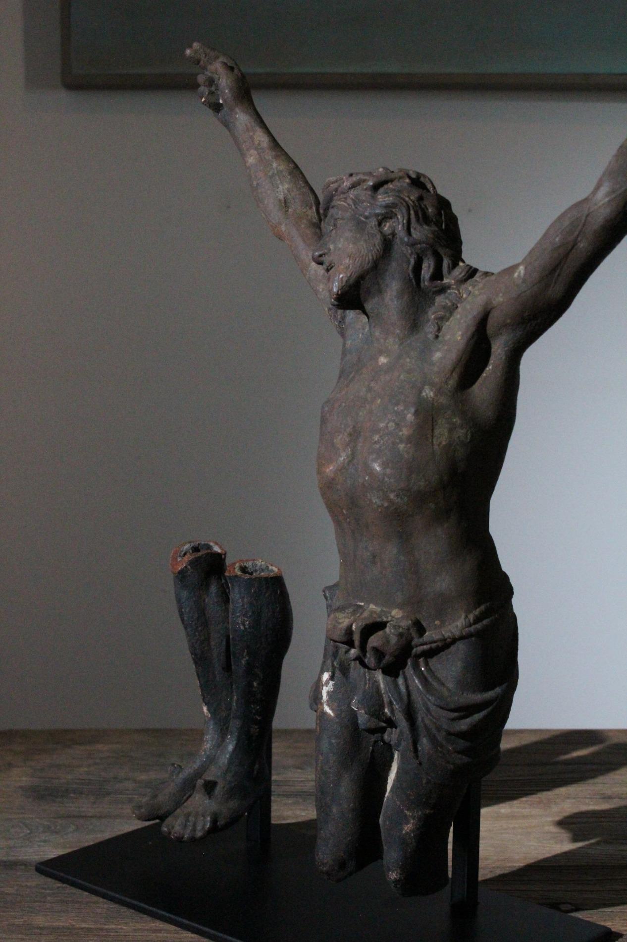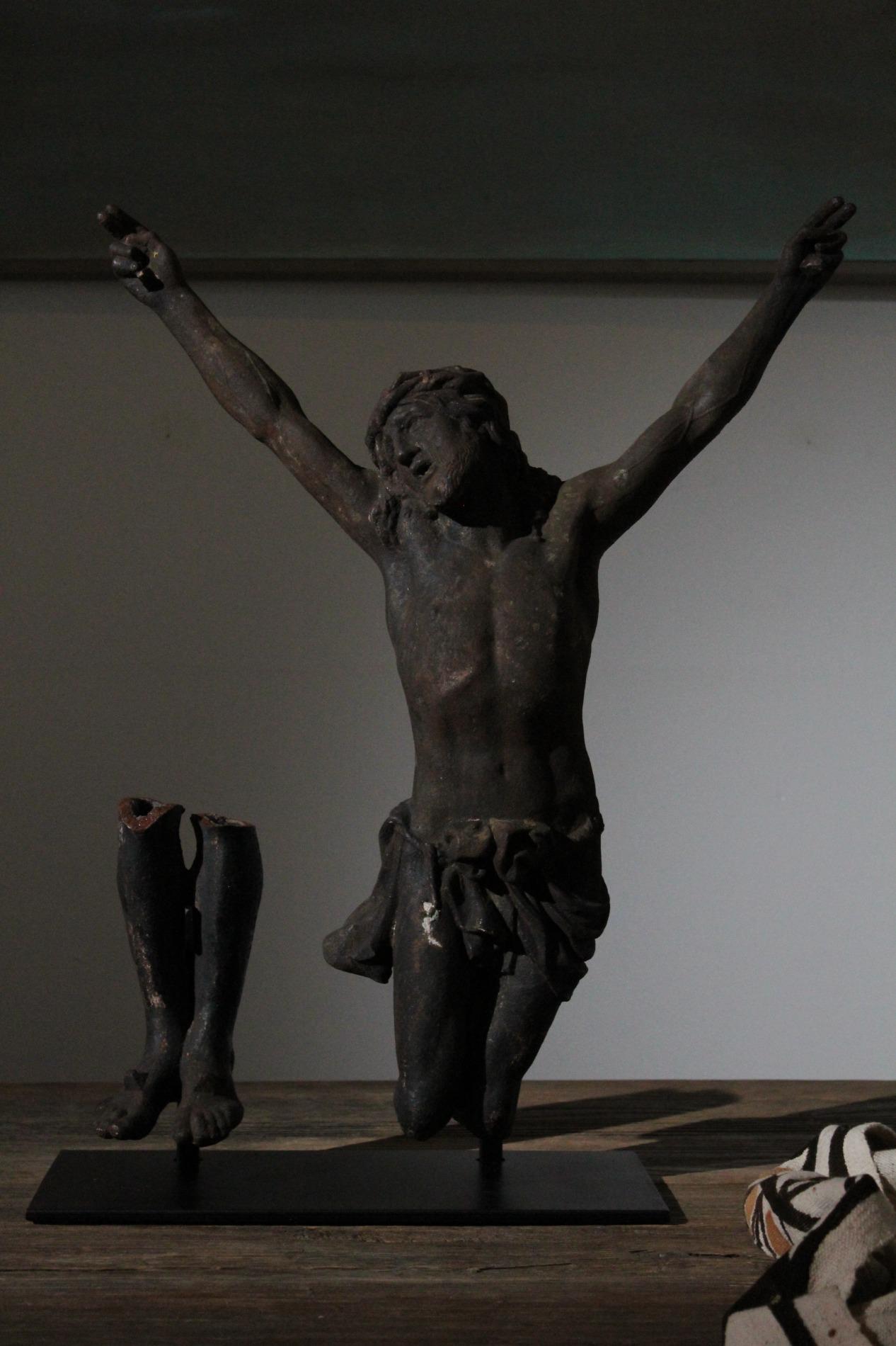 19th century cast iron corpus christ, very detailed expression with anatomical elements such as the ribs, toes, tendons, knees and vanes clearly visible. The corpus has lost his feet during the years of hanging outside, we saw an oppurtunity to make a special creation with the two parts presented on a custom made metal display. Beautiful weathered patine and traces of time. Origin Northern France.