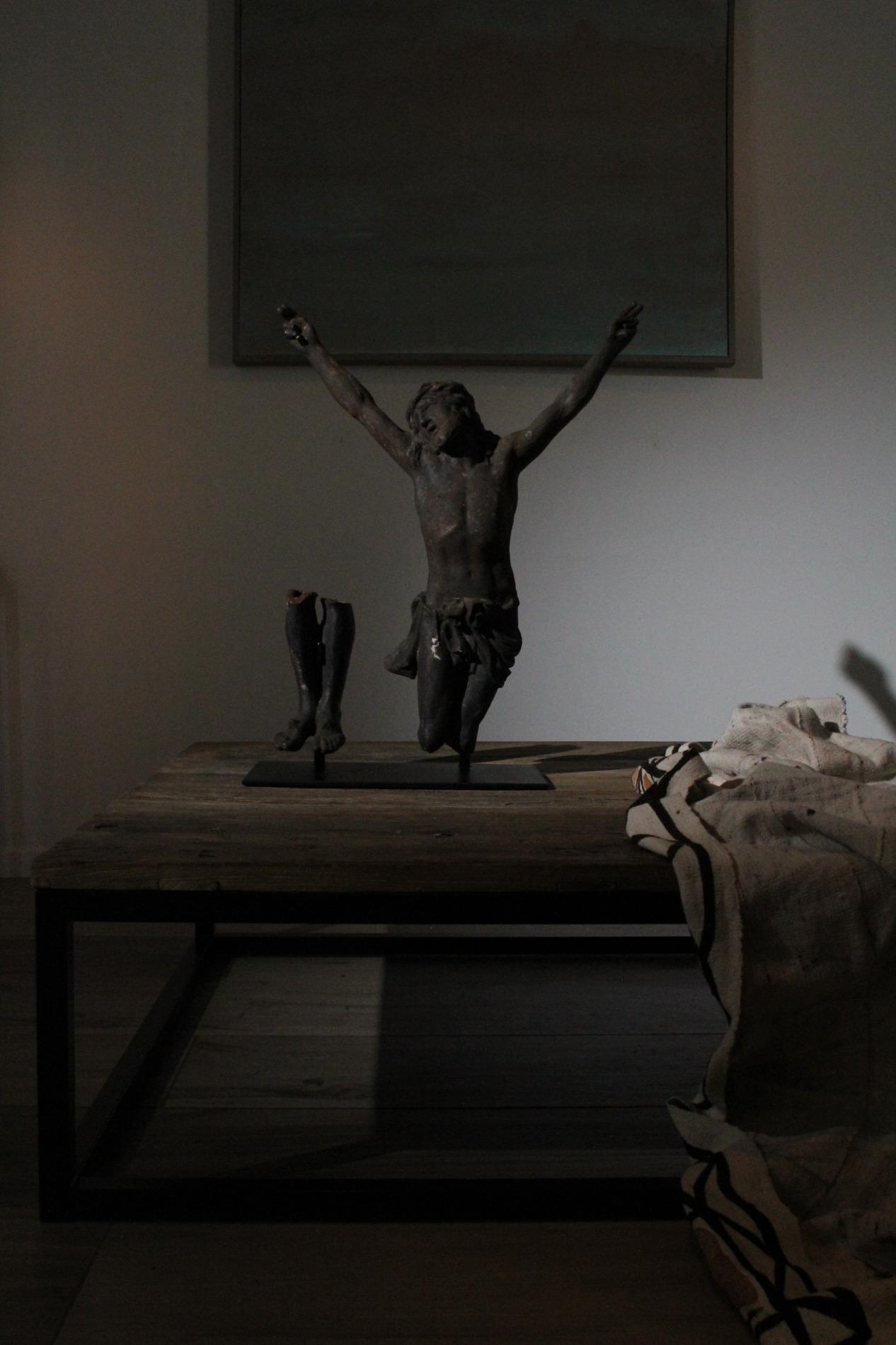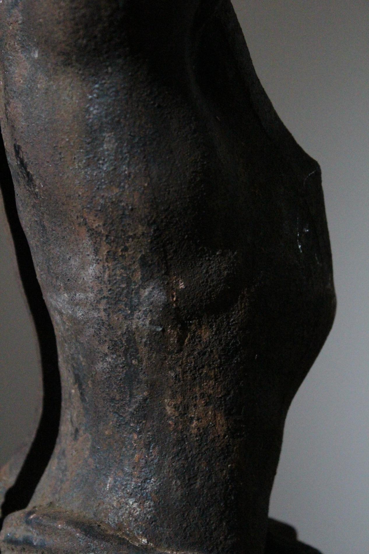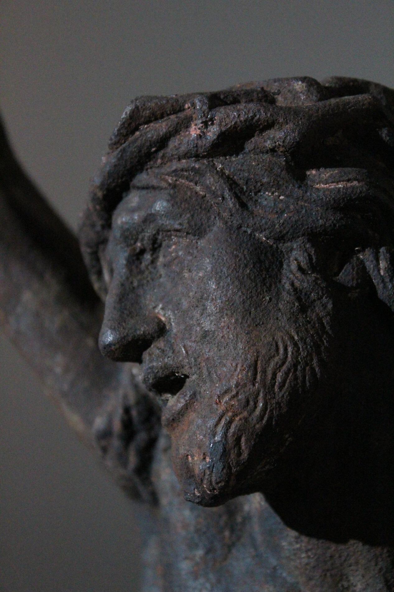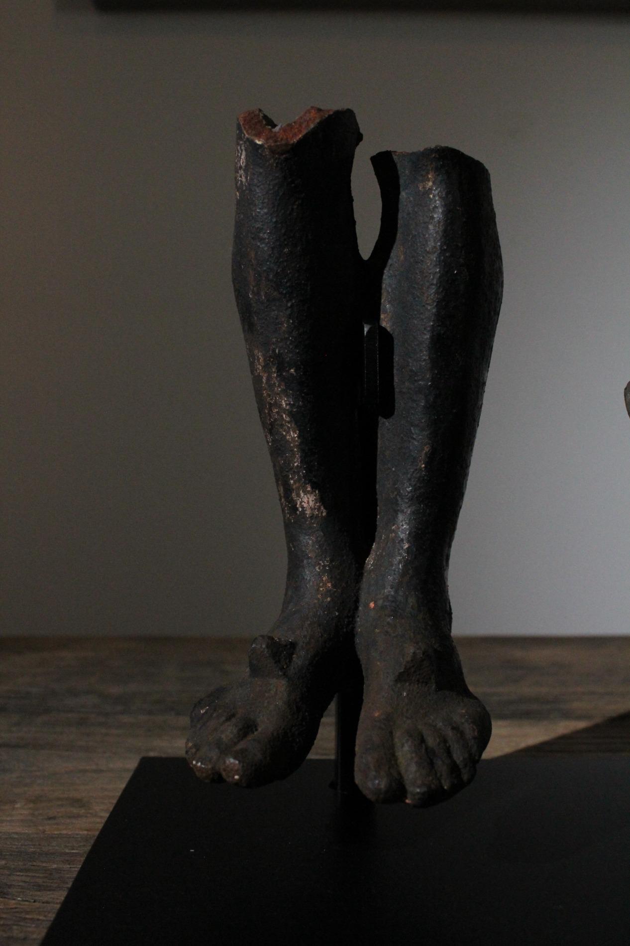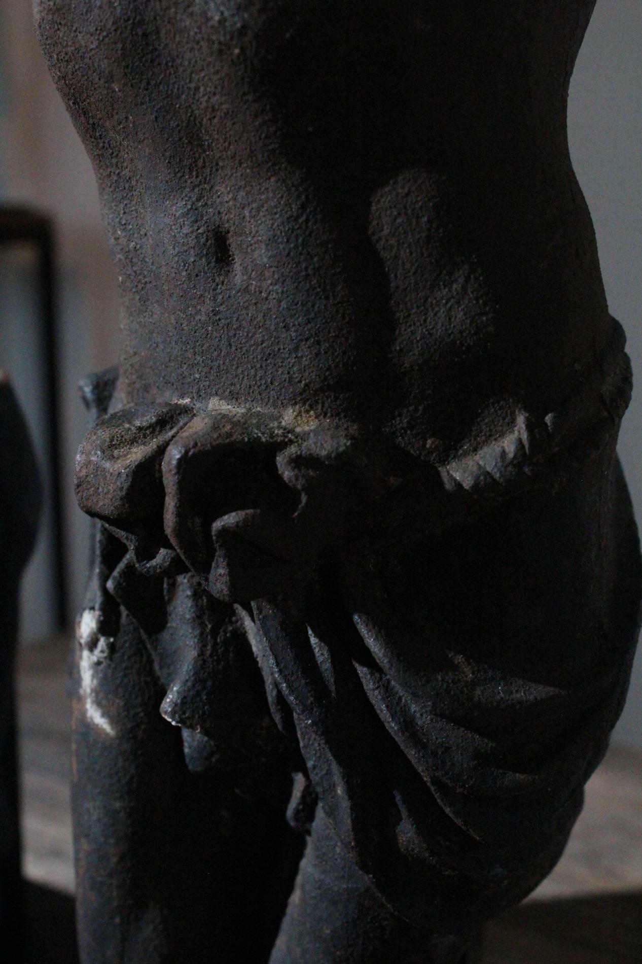19th century cast iron corpus christ, very detailed expression with anatomical elements such as the ribs, toes, tendons, knees and vanes clearly visible. The corpus has lost his feet during the years of hanging outside, we saw an oppurtunity to make a special creation with the two parts presented on a custom made metal display. Beautiful weathered patine and traces of time. Origin Northern France.