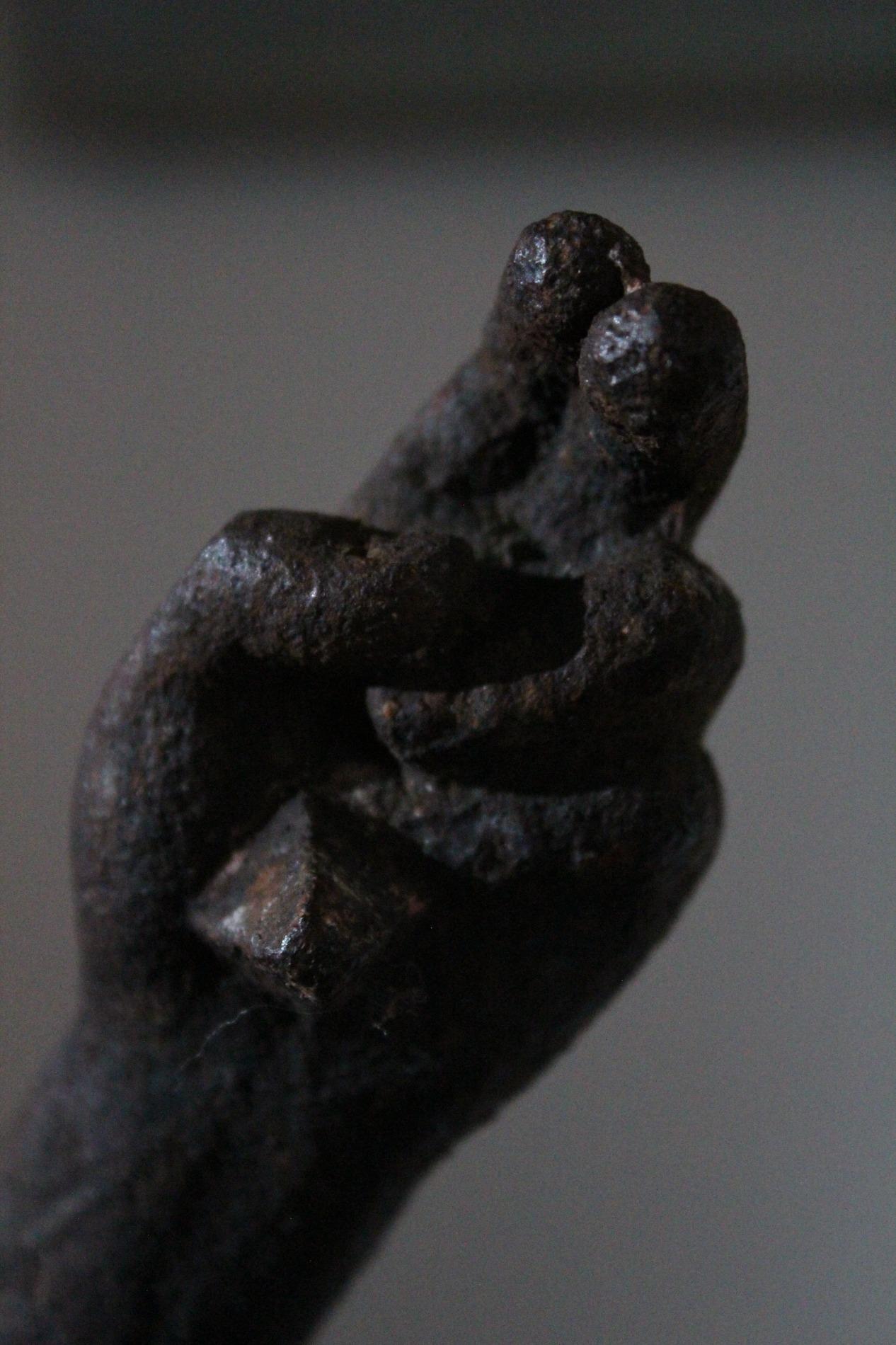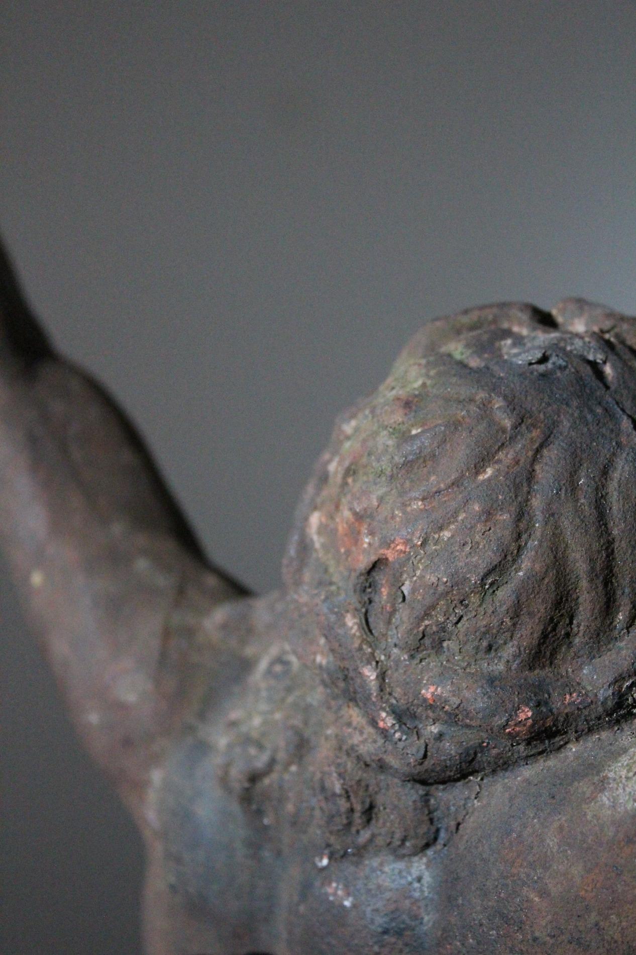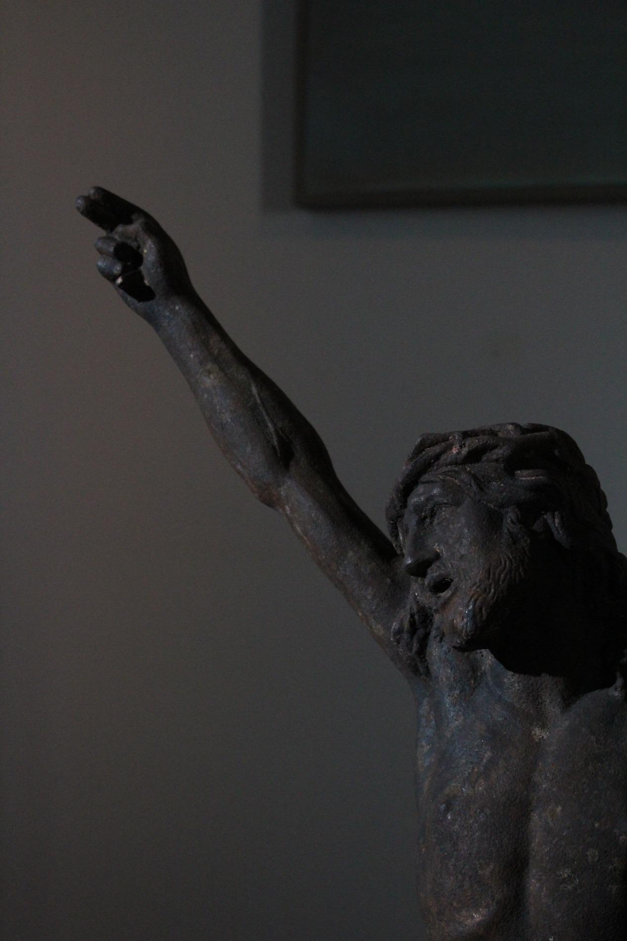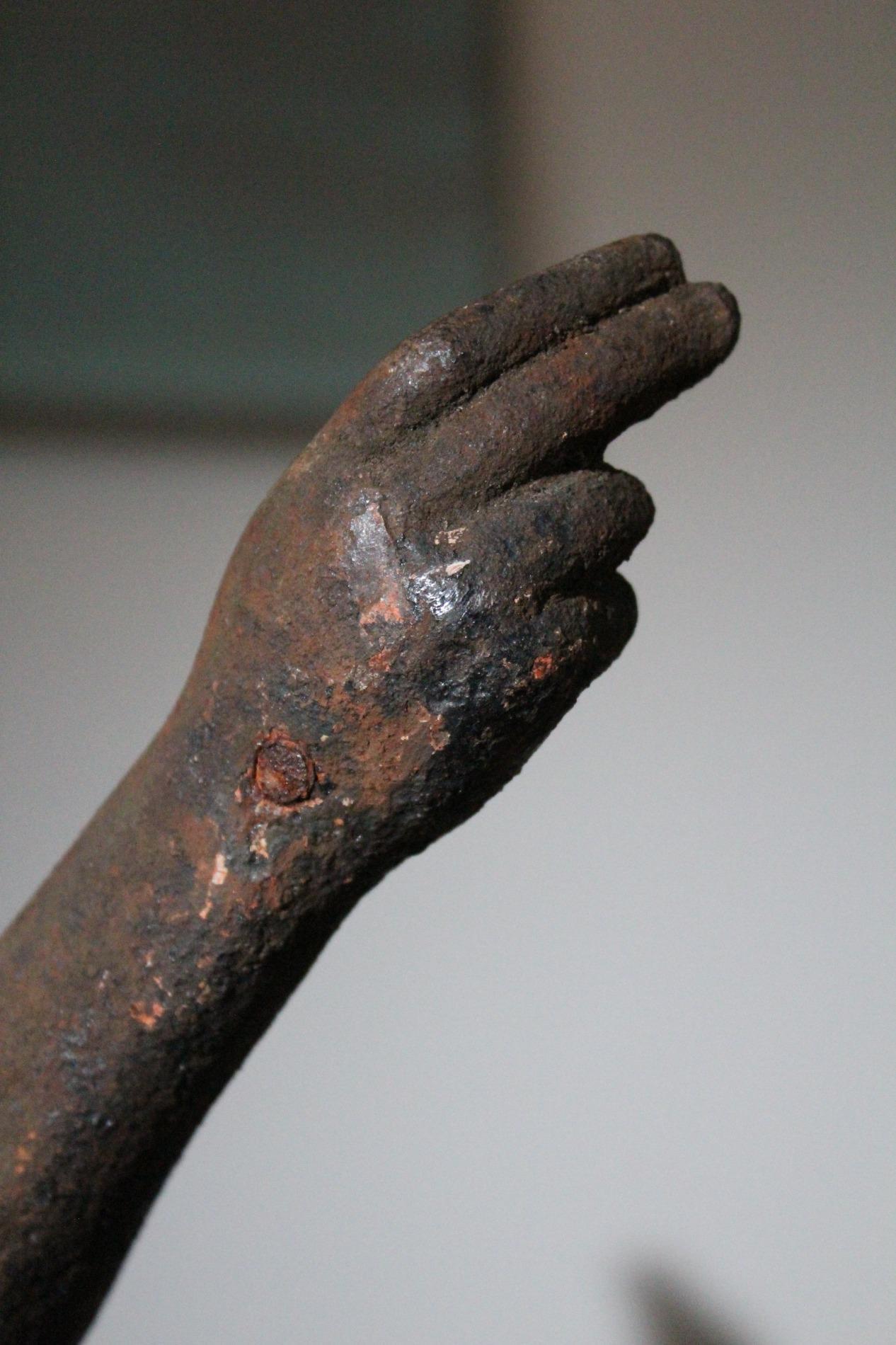 19th century cast iron corpus christ, very detailed expression with anatomical elements such as the ribs, toes, tendons, knees and vanes clearly visible. The corpus has lost his feet during the years of hanging outside, we saw an oppurtunity to make a special creation with the two parts presented on a custom made metal display. Beautiful weathered patine and traces of time. Origin Northern France.