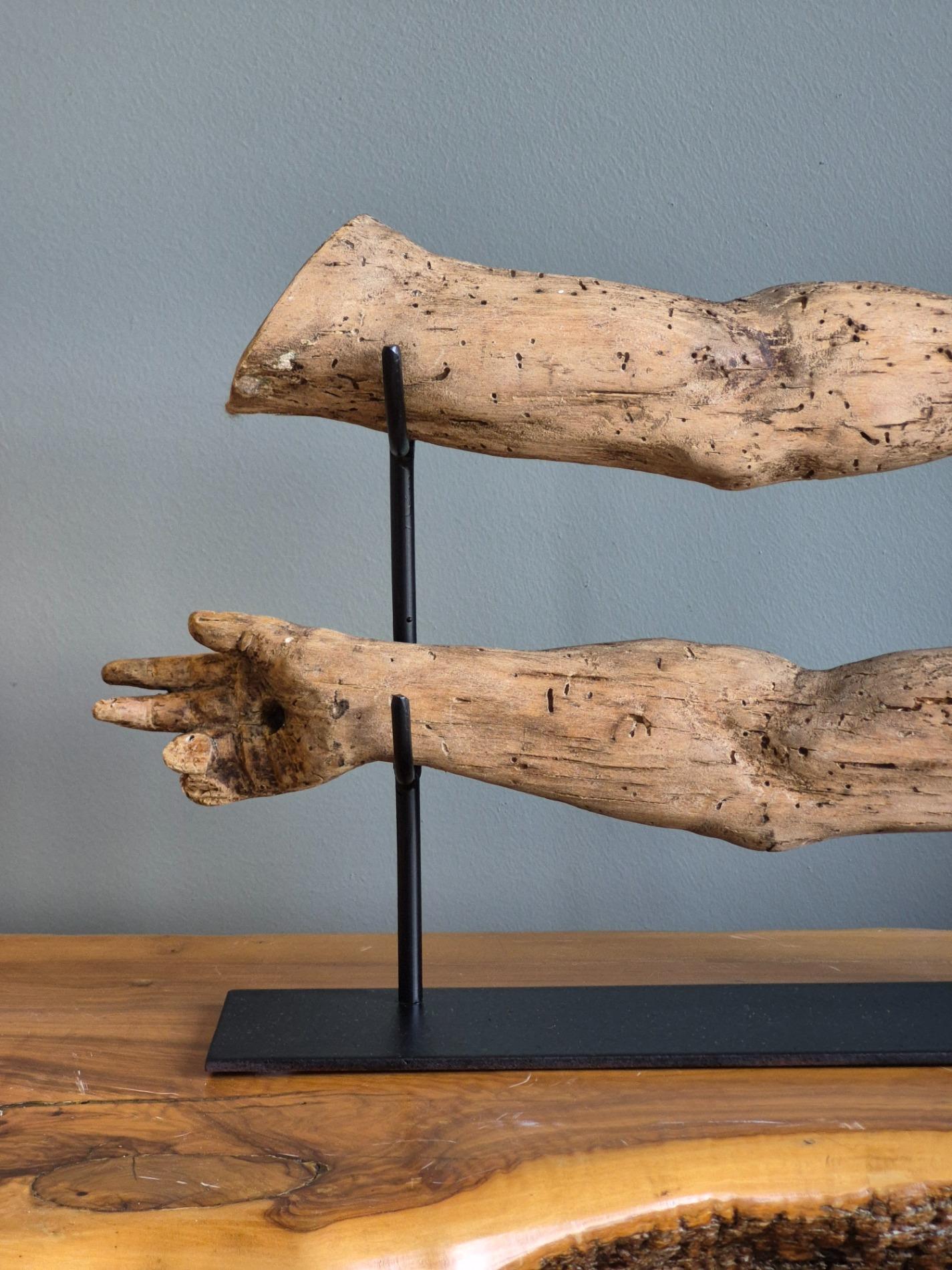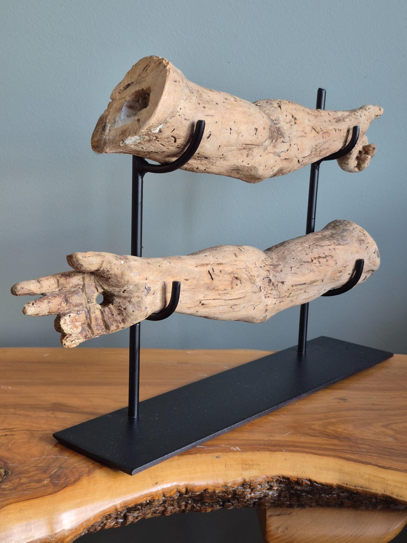 Pair of 17th C arms of a corpus christ. Made of limewood with nice patina and traces of time. Mounted on a custom made metal display.