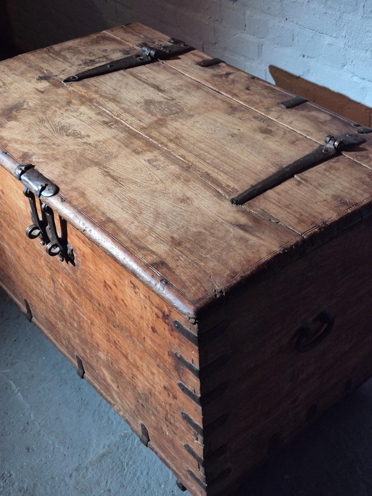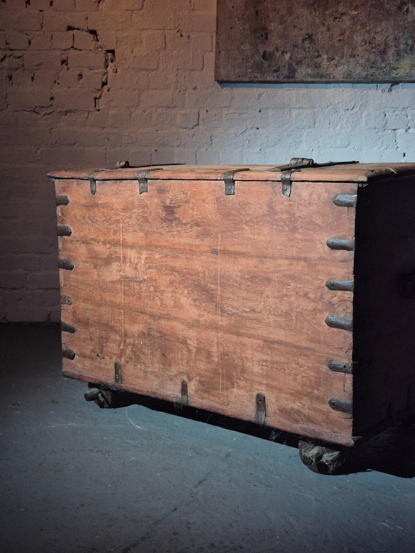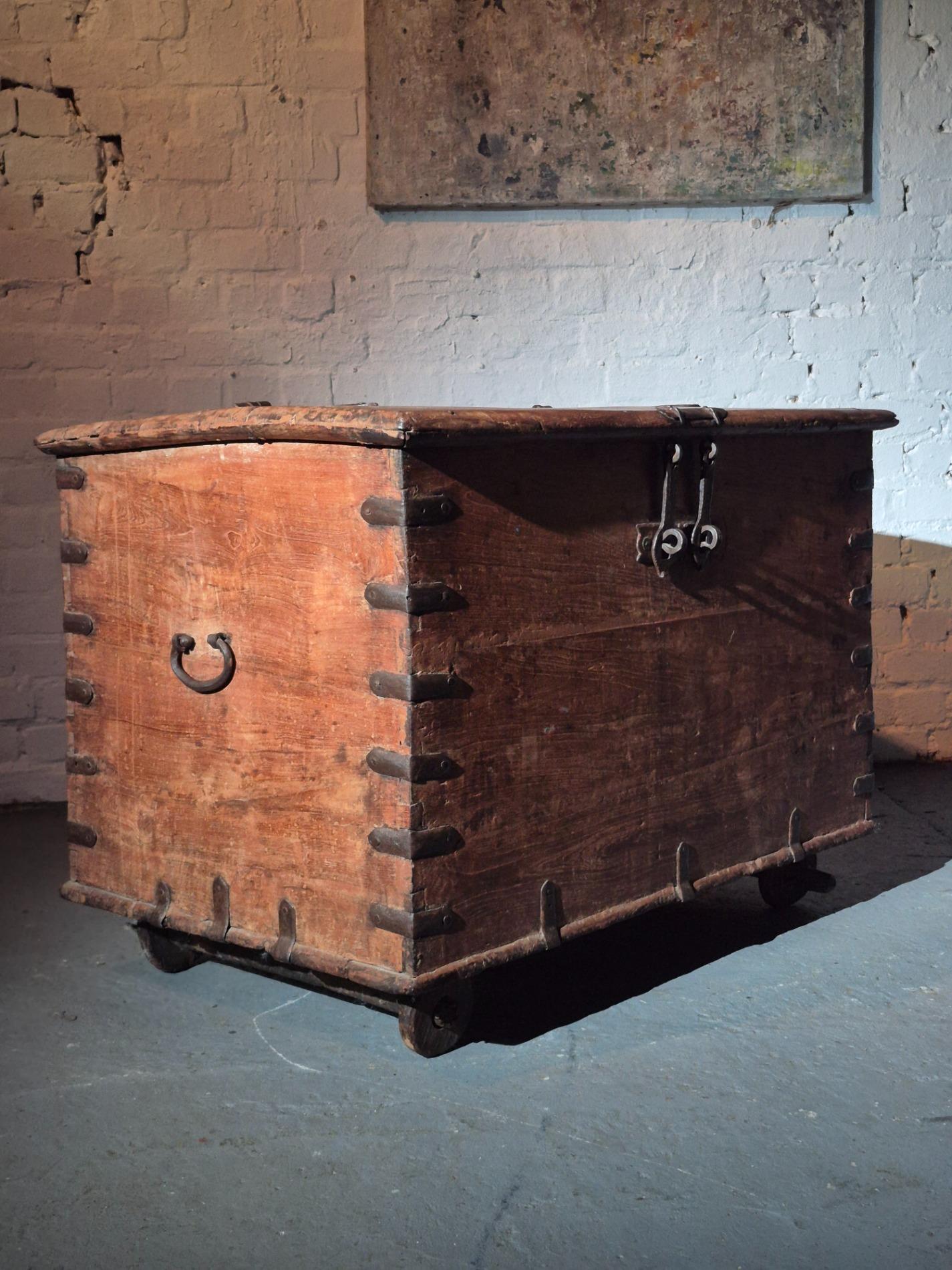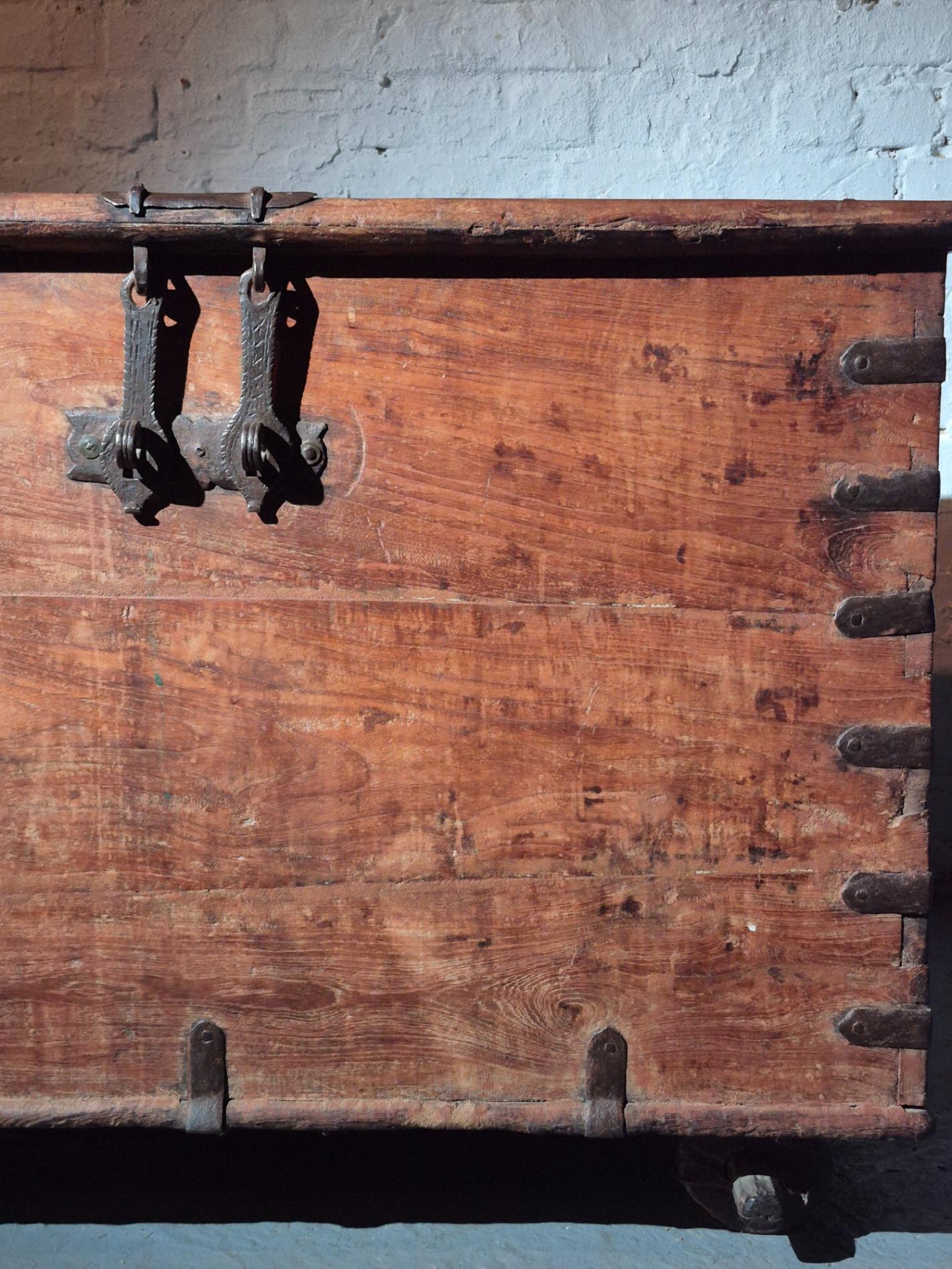18thC teak iron bound chest. Originally this merchant chest was made to be used as a very secure chest for transporting valuables on the arduous journeys around the East. The lid opens to reveal a mainly open storage space, and a section to store small valuables and money.
