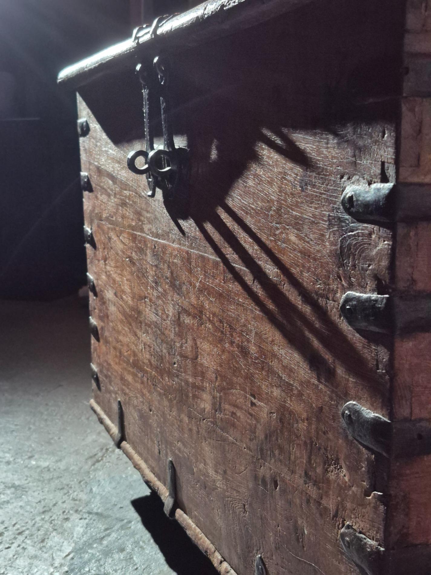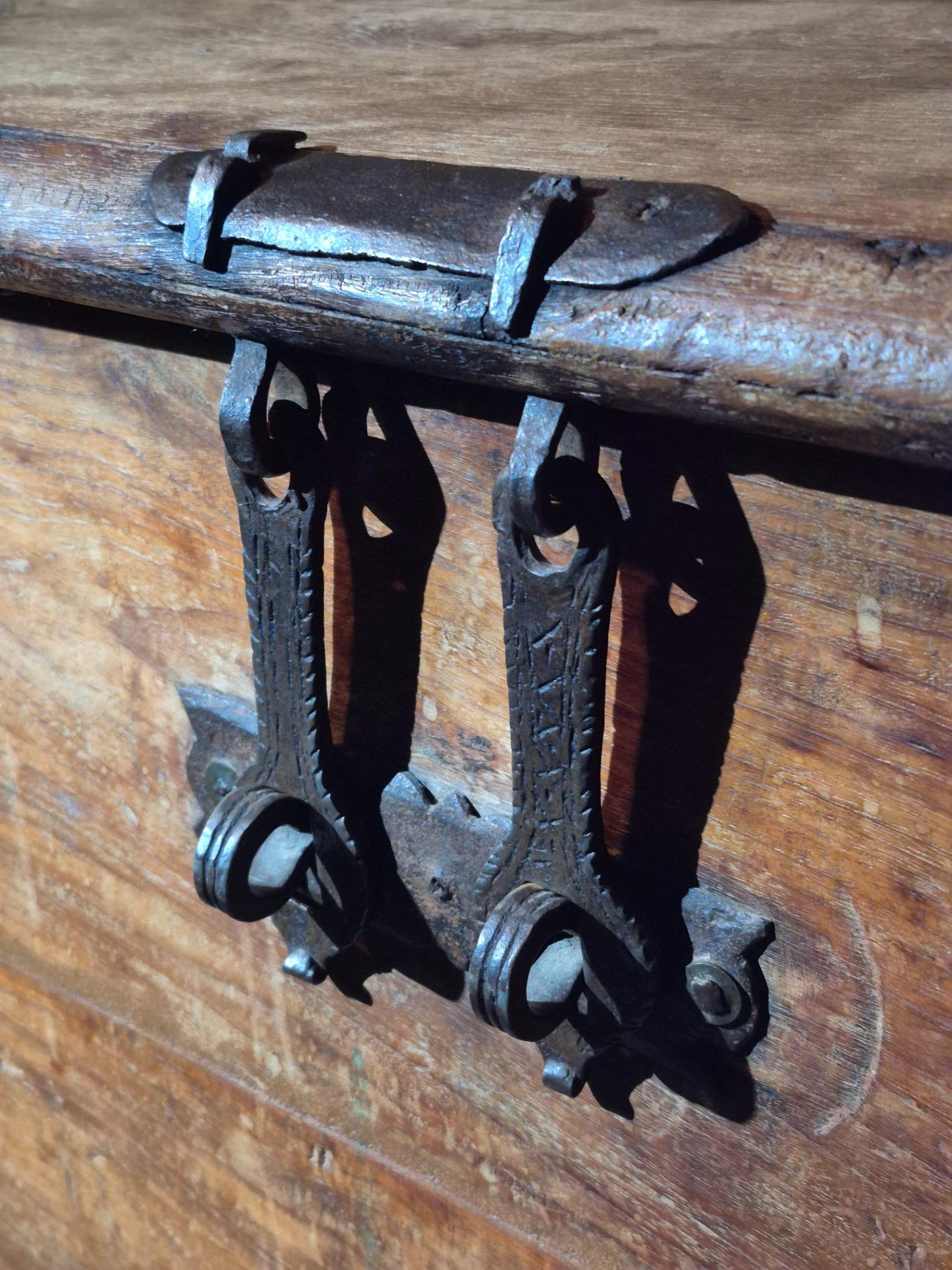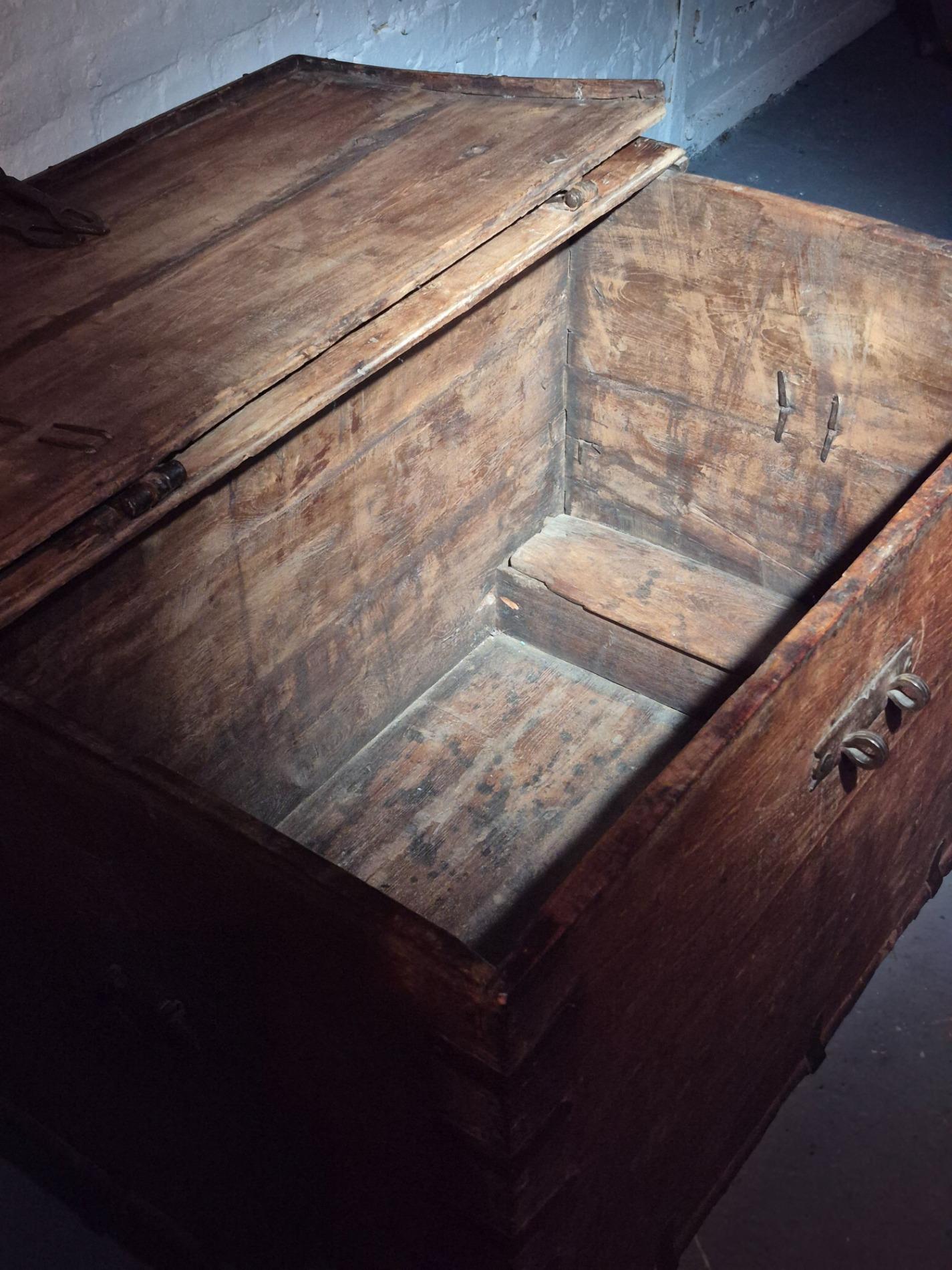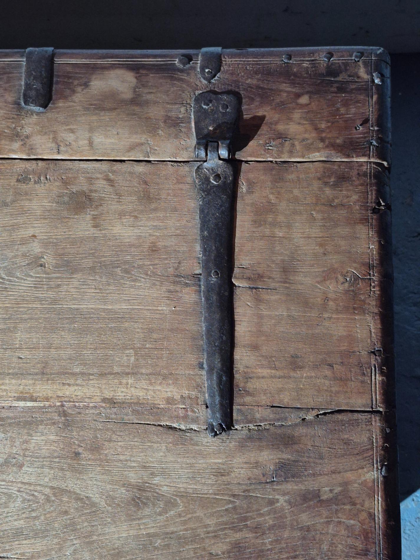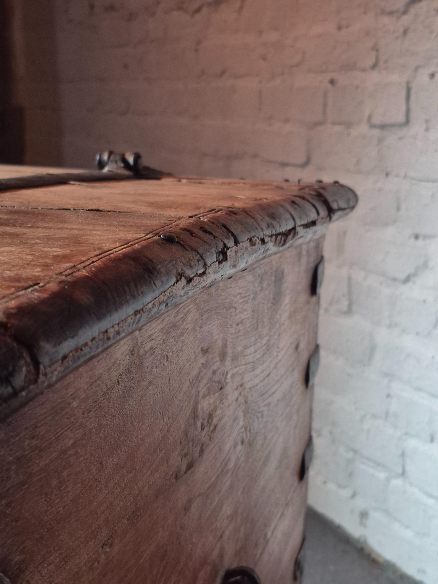 18thC teak iron bound chest. Originally this merchant chest was made to be used as a very secure chest for transporting valuables on the arduous journeys around the East. The lid opens to reveal a mainly open storage space, and a section to store small valuables and money.