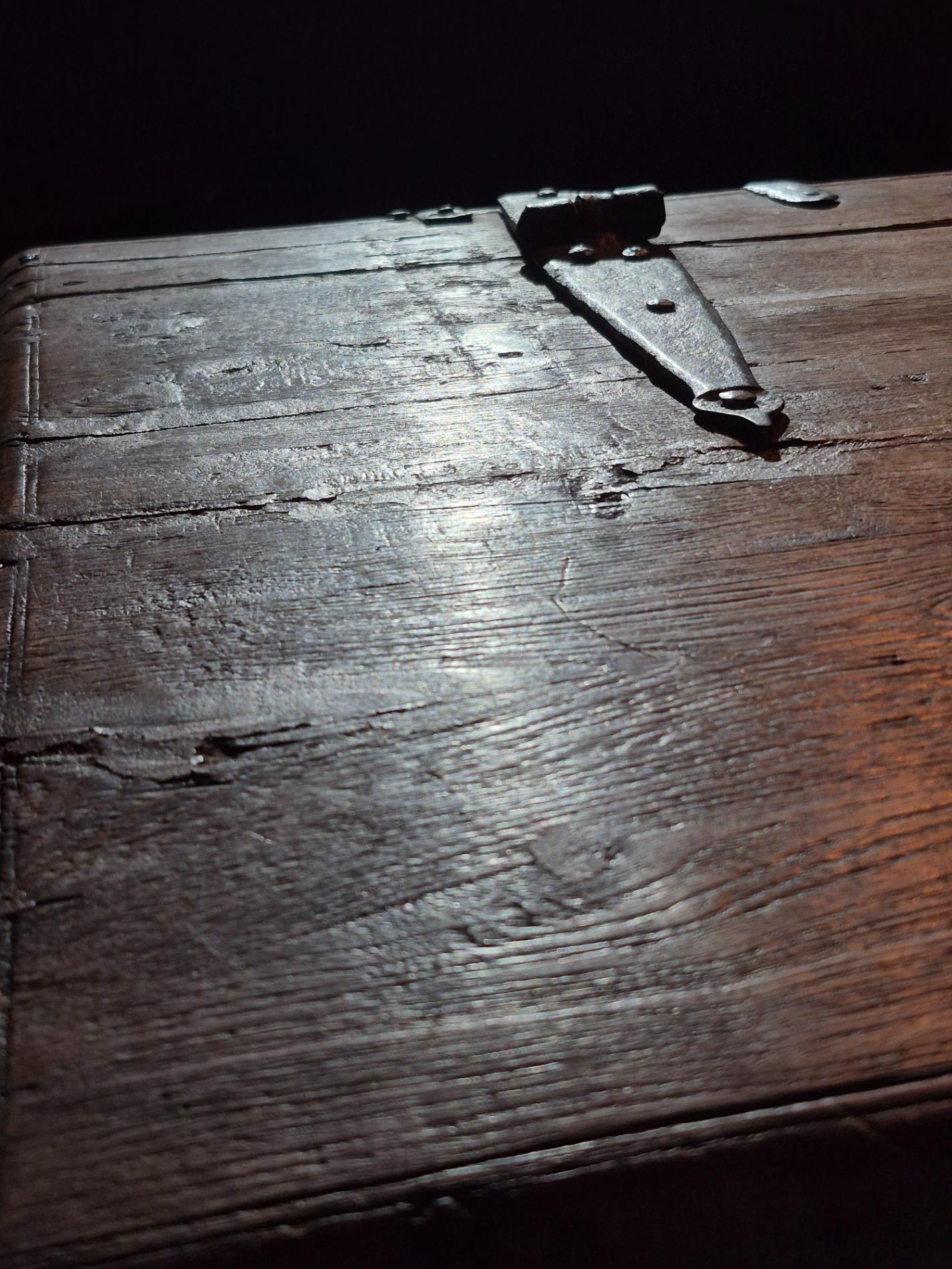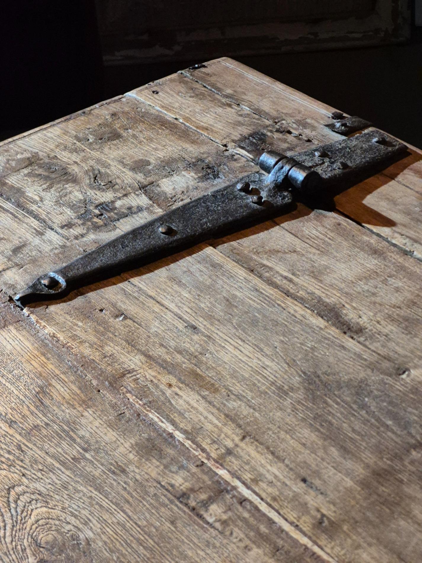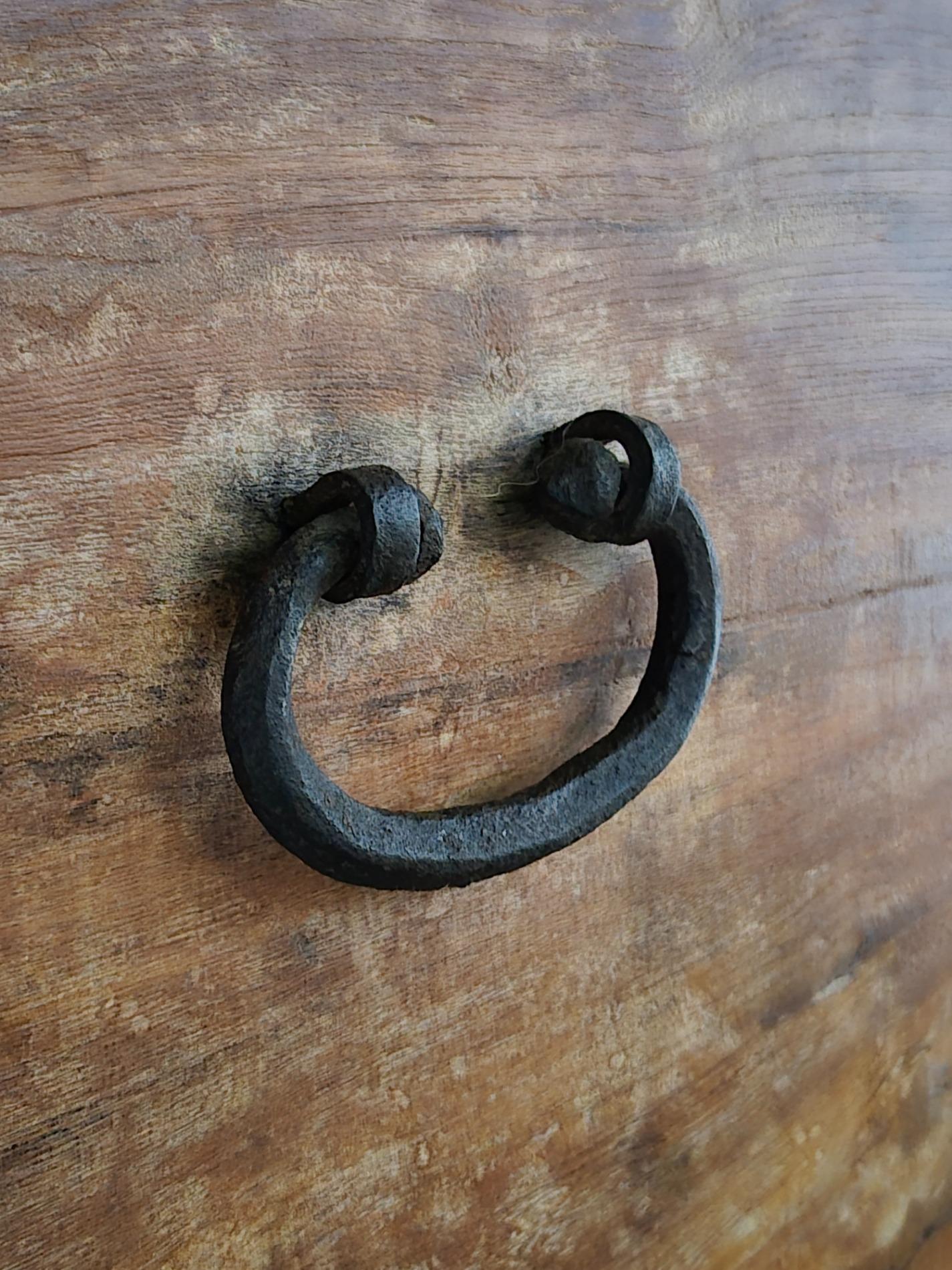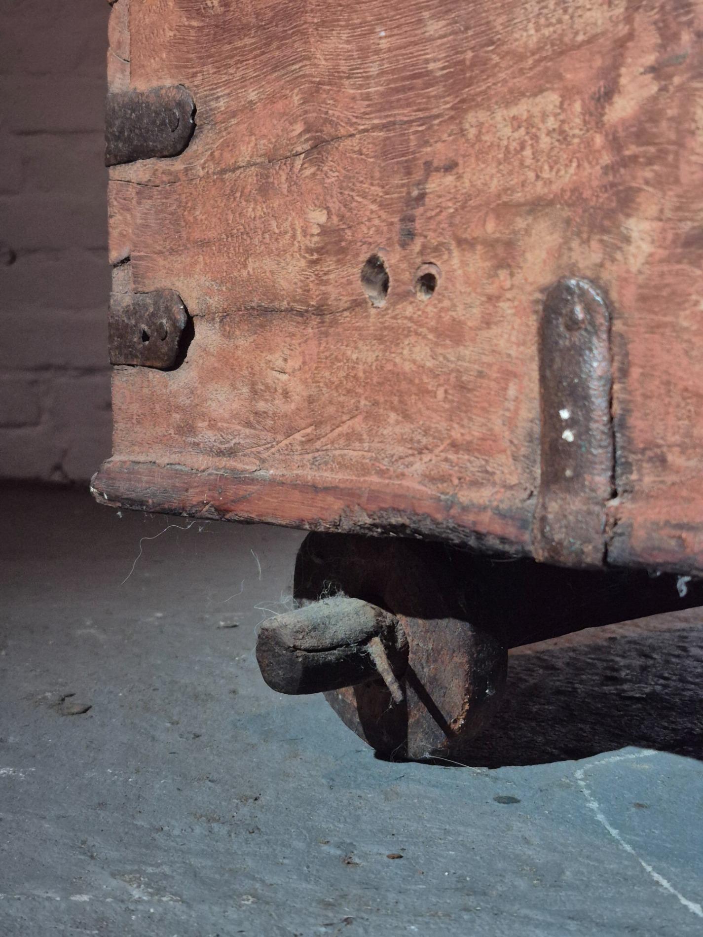 18thC teak iron bound chest. Originally this merchant chest was made to be used as a very secure chest for transporting valuables on the arduous journeys around the East. The lid opens to reveal a mainly open storage space, and a section to store small valuables and money.