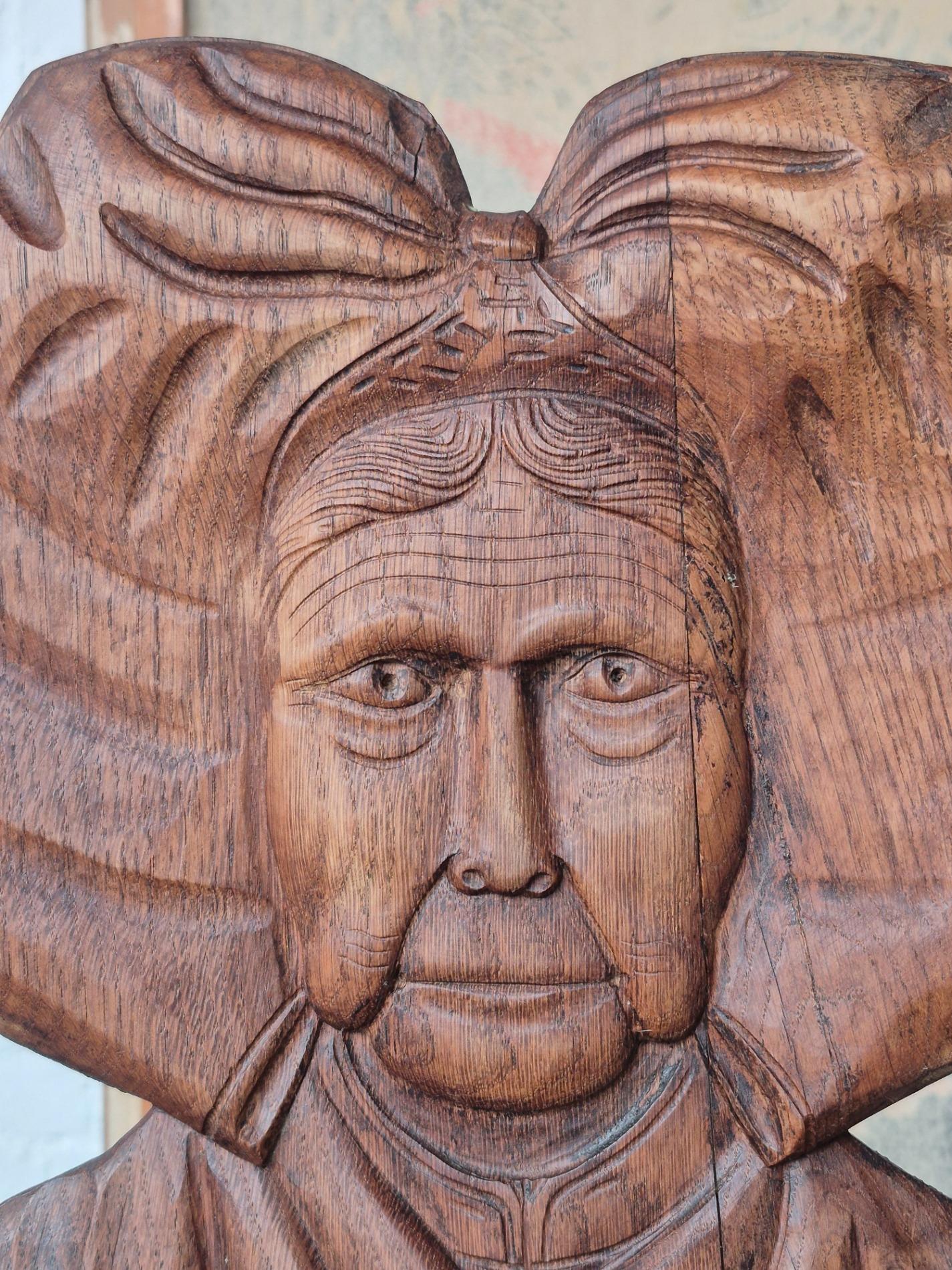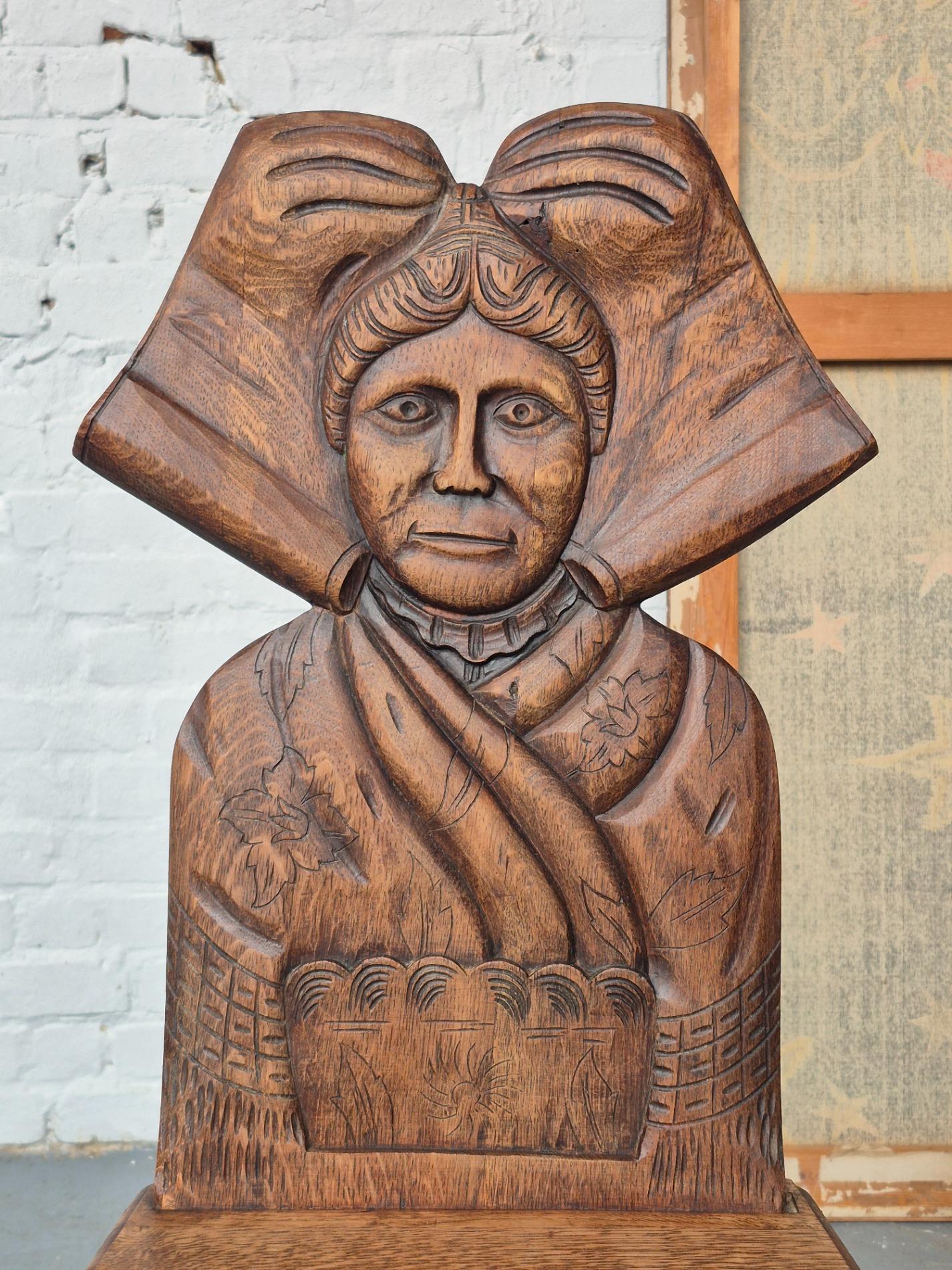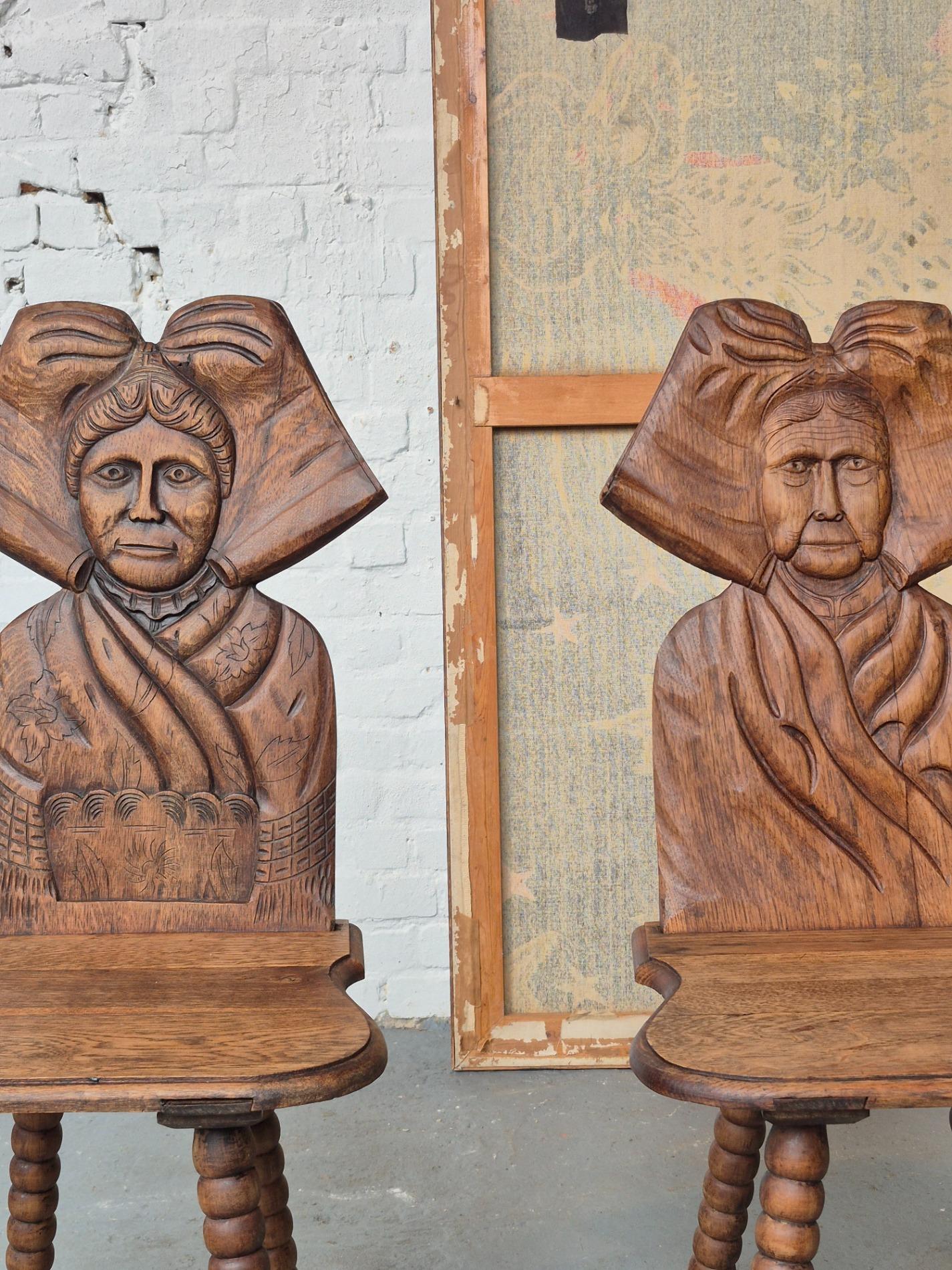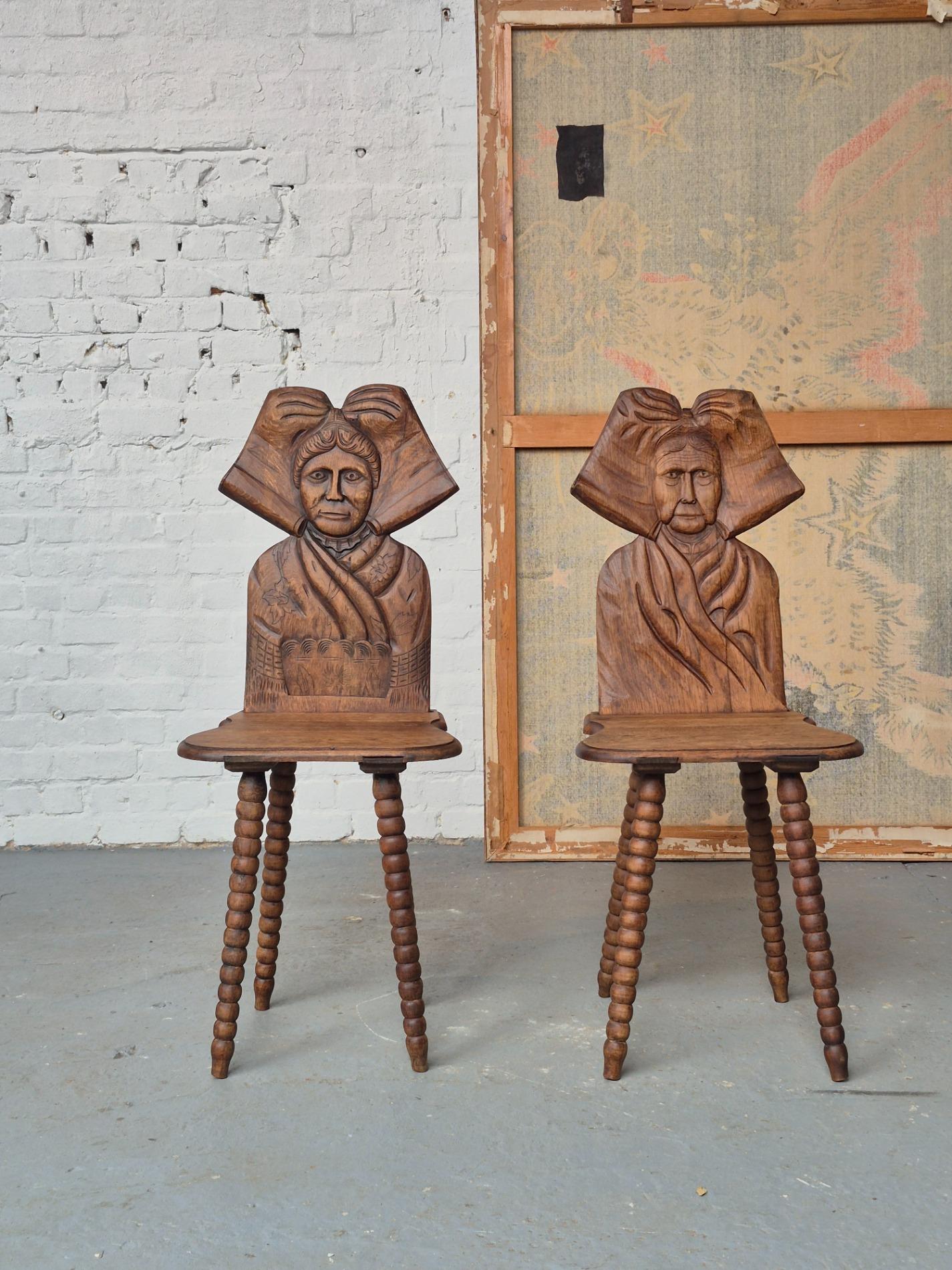 Pair of 19th century French folk art woman chairs, these chairs were made as a gift when someone was leaving the parents house, because of marriage or to live alone. This pair is very rare to find because it depicts two women, probably sisters. These chairs were a typical tradition in the Alsace region. Made of oakwood with nice primitive details and patina.