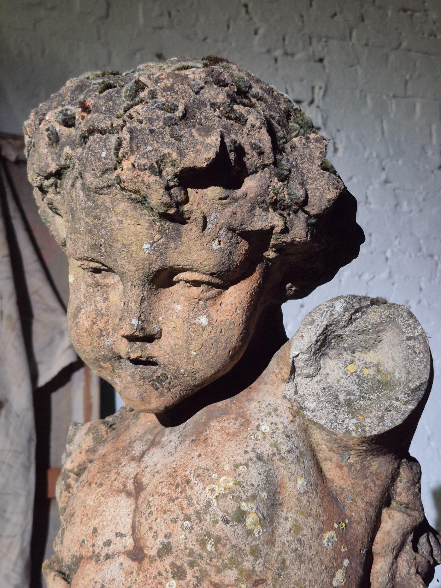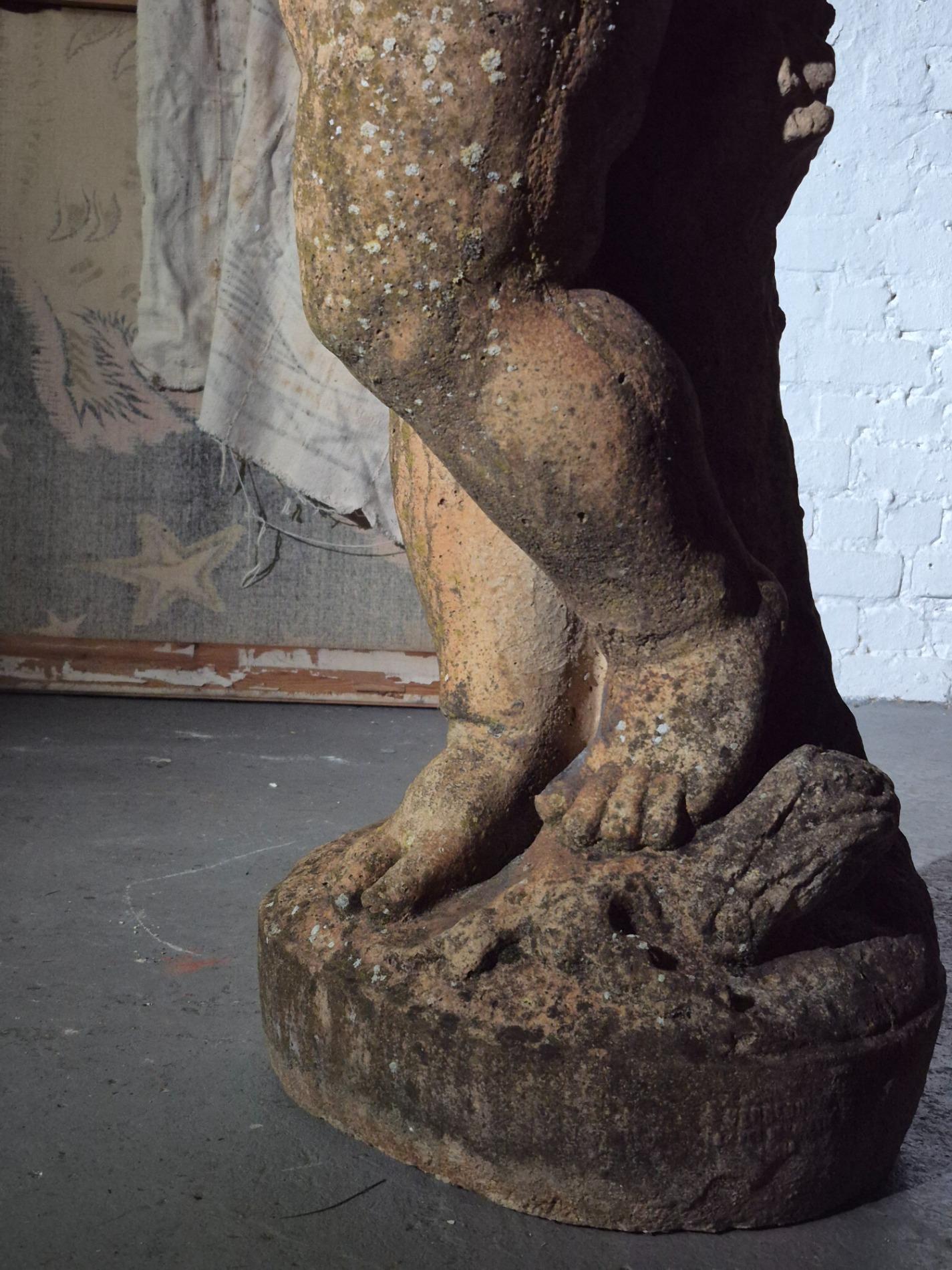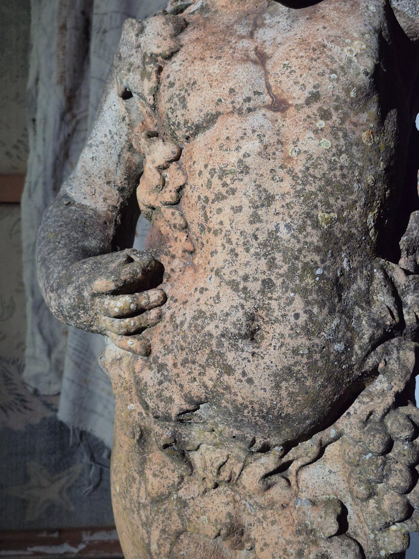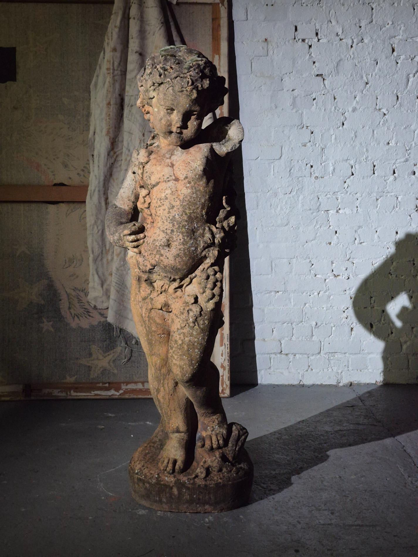 19th-century exceptionally large (136 cm) stone Putti. Made in Italy, and it has stood in a garden for many years, which has created a beautiful patina with moss. The sculpture is full of beautiful and refined details, such as the grapevine that gracefully winds around the body of the Putti, the tree trunk with leaves at the back of the sculpture, as well as the detailed anatomy of the figure and its serene expression.