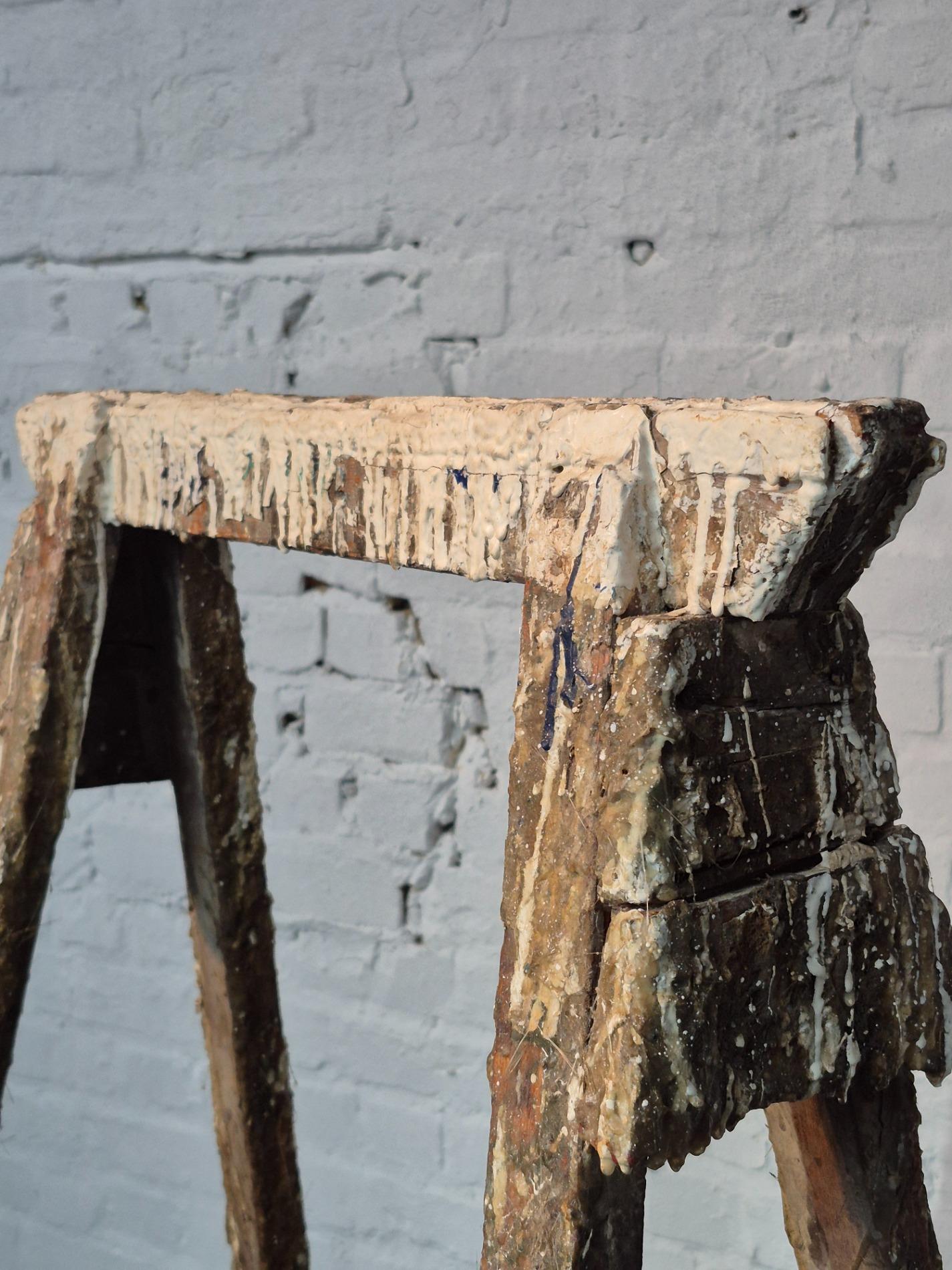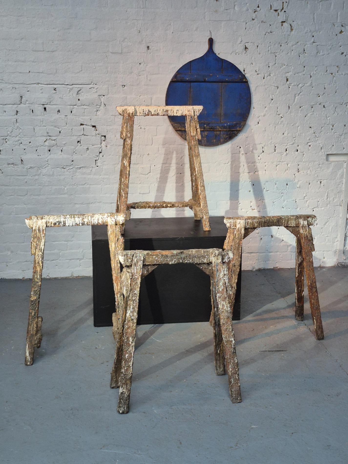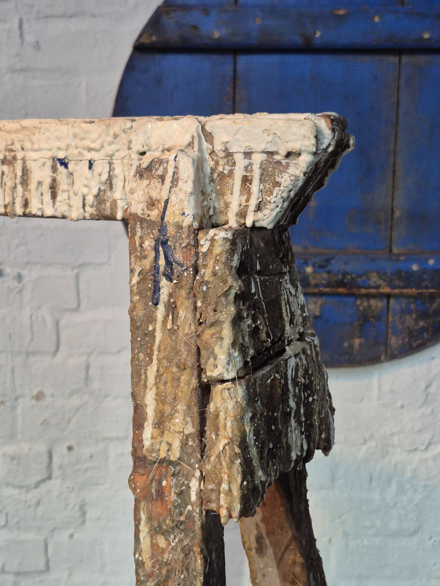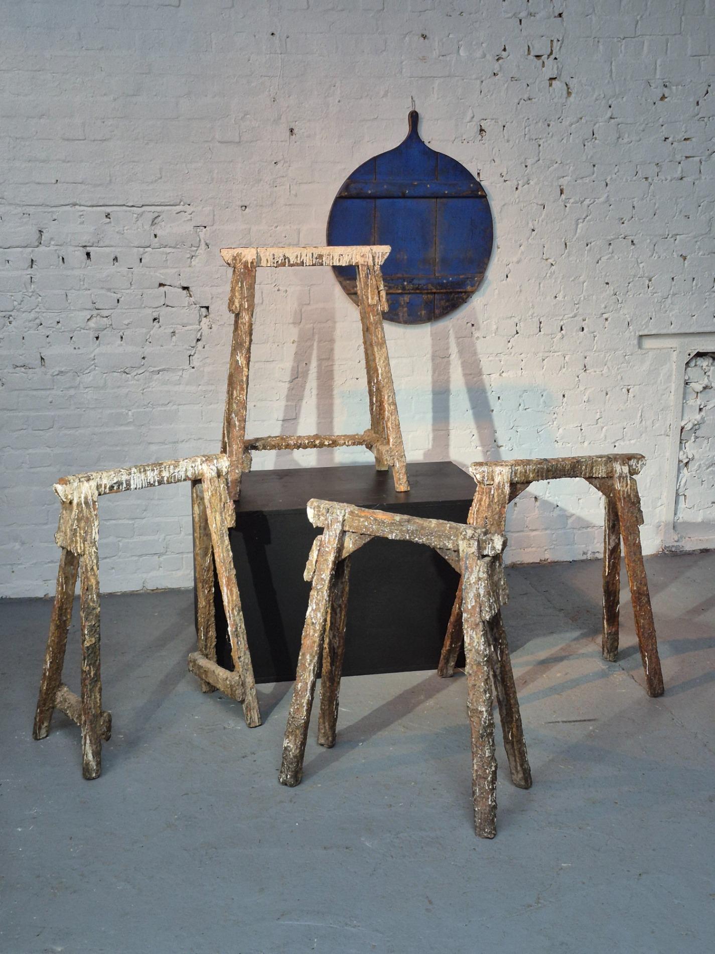Set of 4 old artist workshop trestles. Made of wood with a thick layer of paint and polyester. Found in an old artist atelier in Belgium. These trestles went pieces of art through time and use.