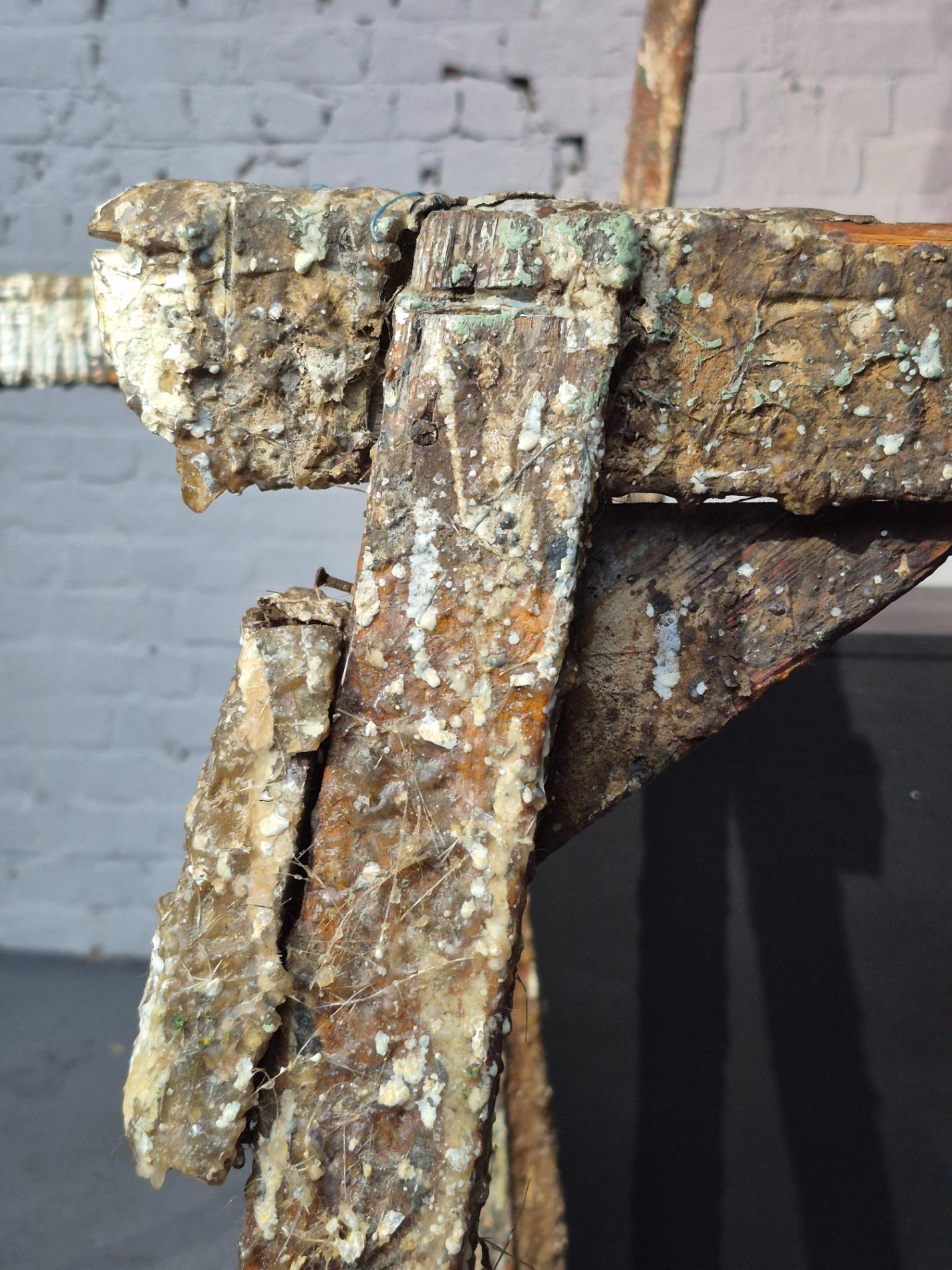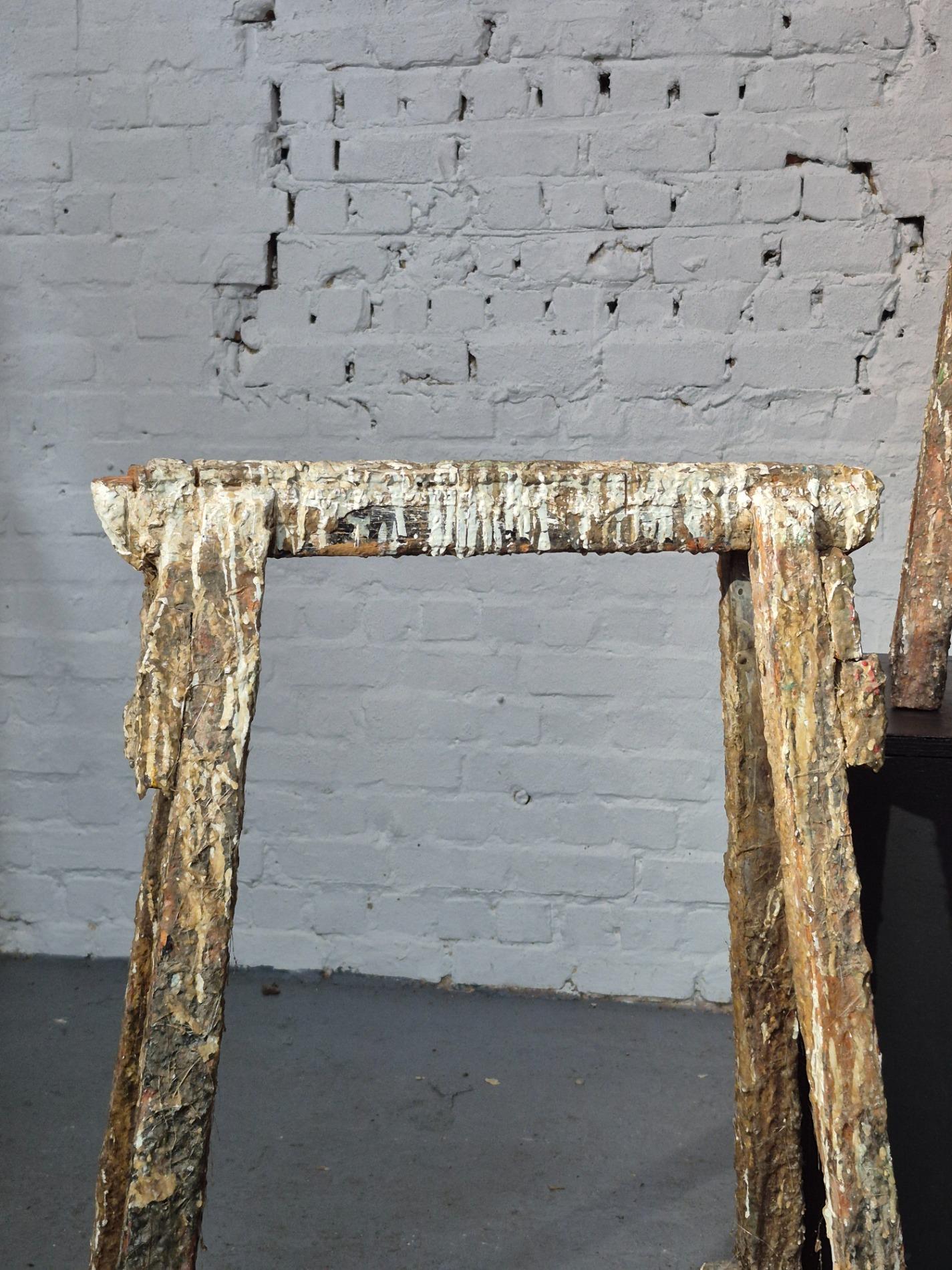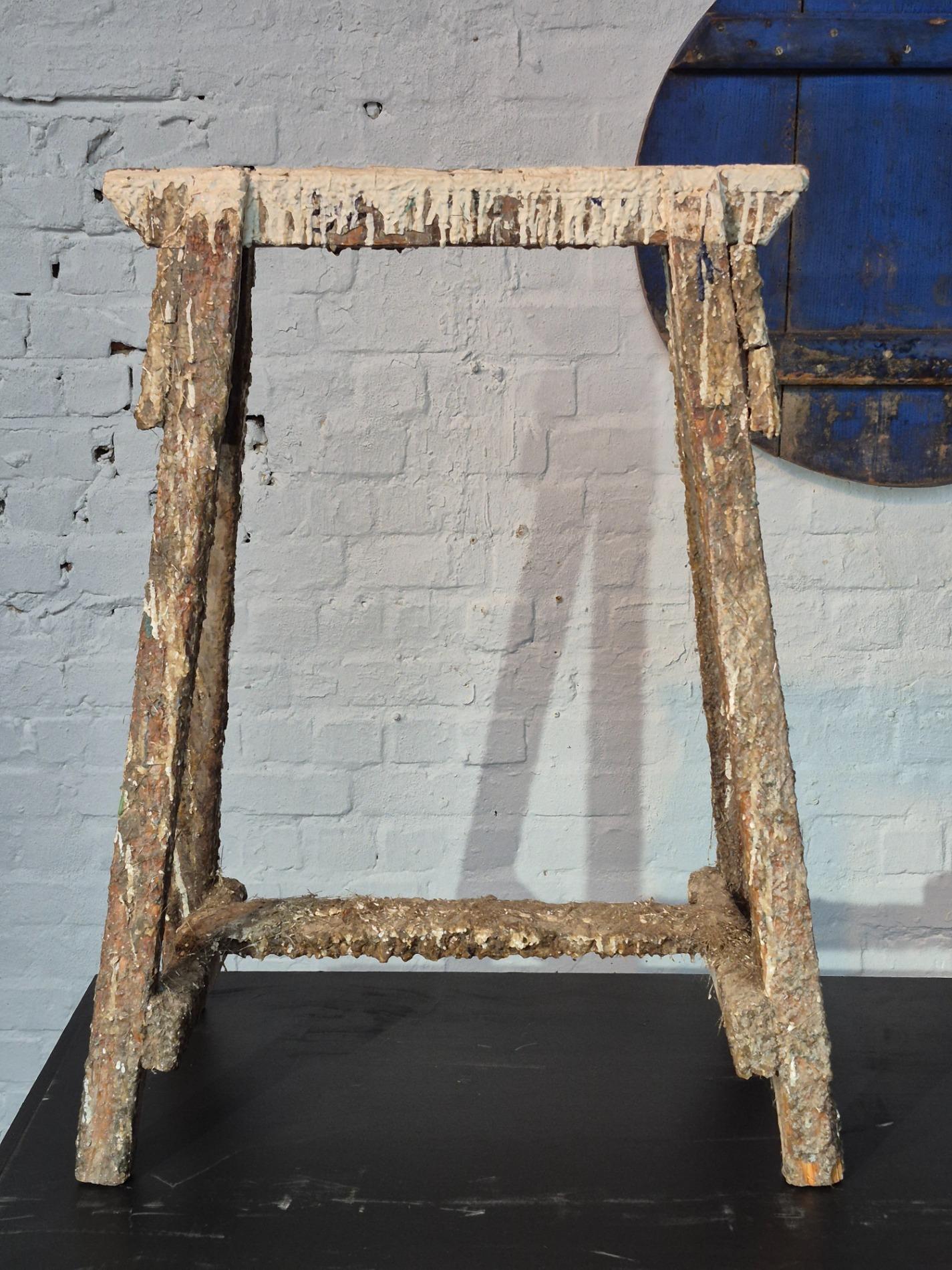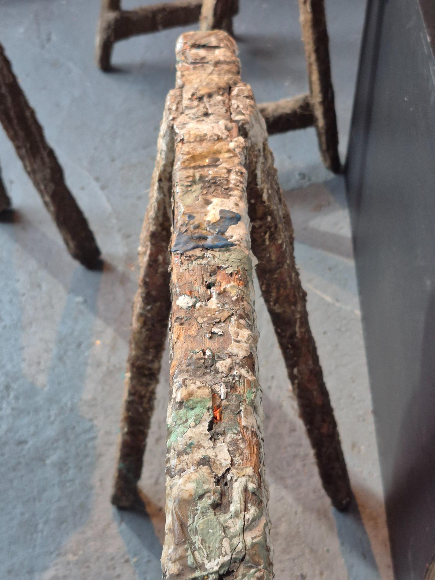 Set of 4 old artist workshop trestles. Made of wood with a thick layer of paint and polyester. Found in an old artist atelier in Belgium. These trestles went pieces of art through time and use.