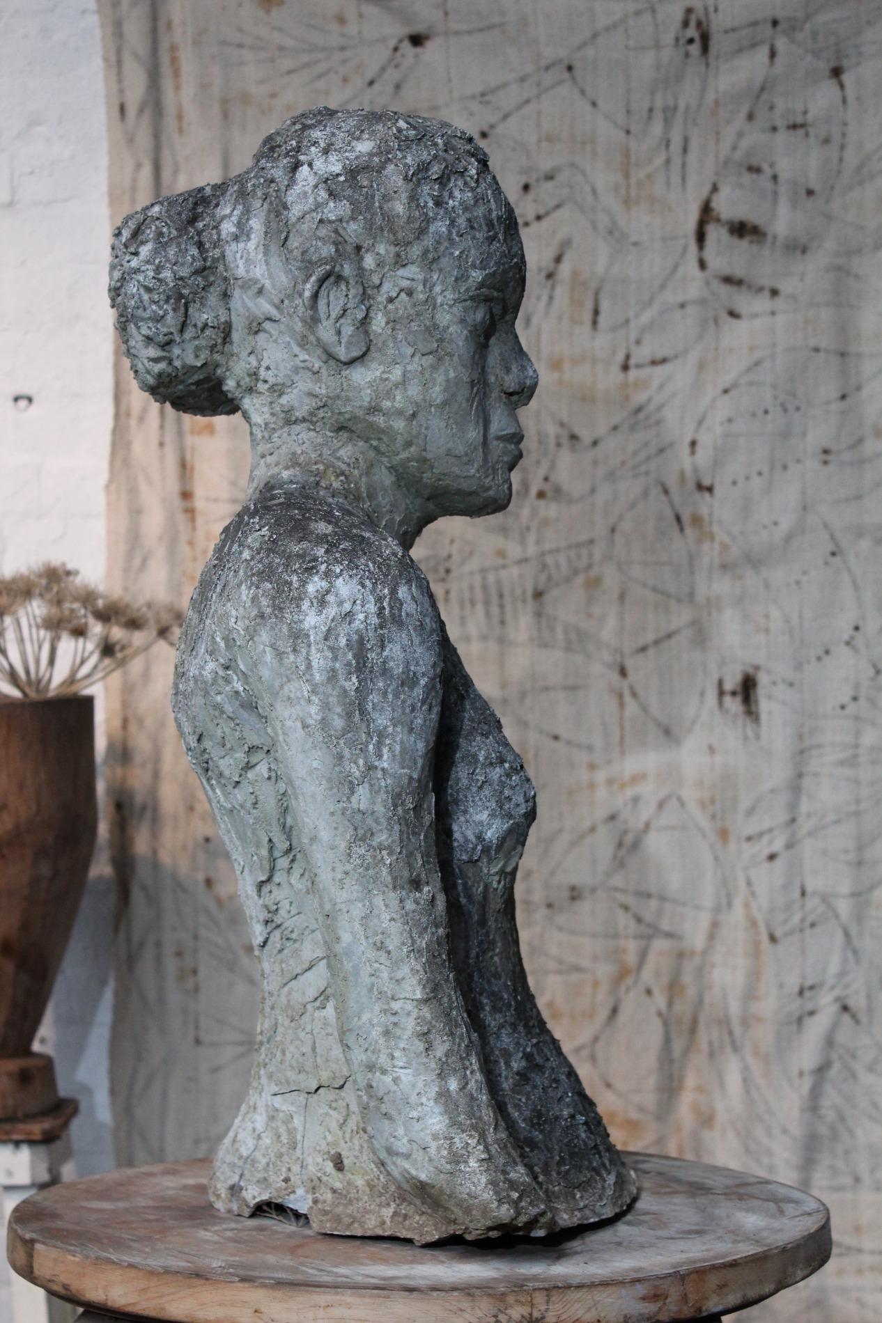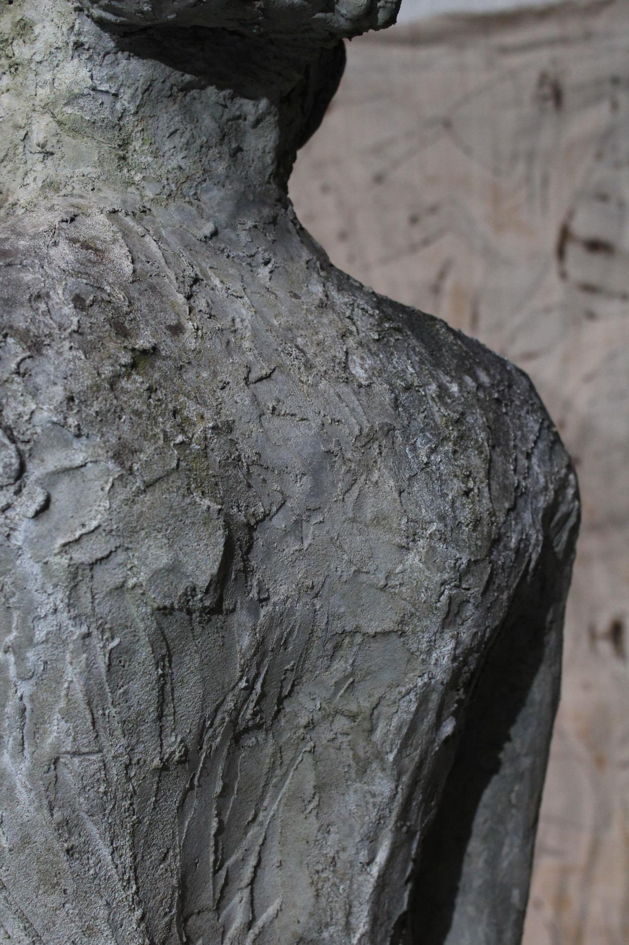 Artistic primitive study of a woman, made of terracotta on a metal base. Origin 1970s Belgium, and has been standing in a garden for years, the weather influences gives the sculpture a unique and amazing patina. The sculpture was hand sculpted and thick layered, which gives a lot of structure.