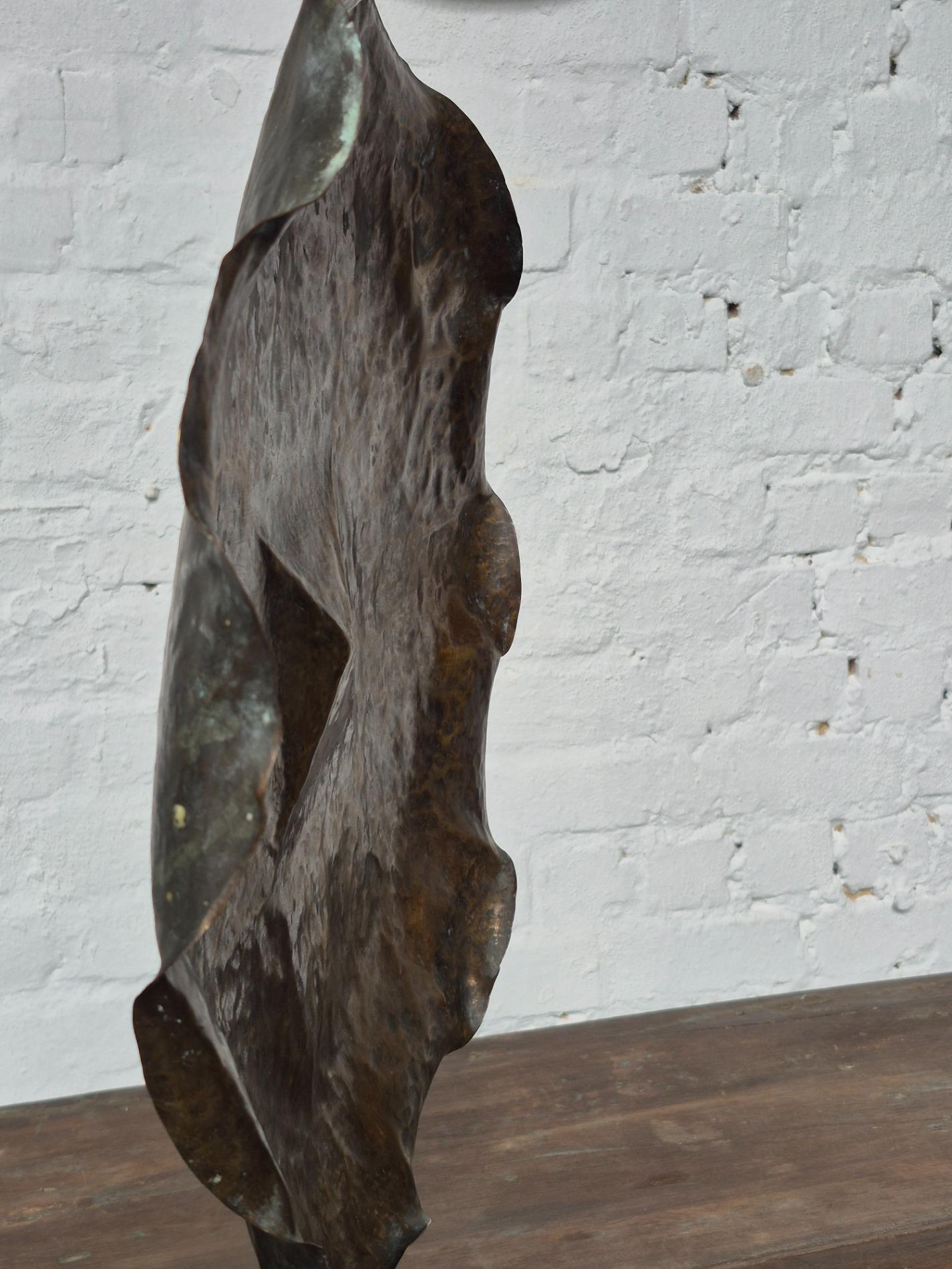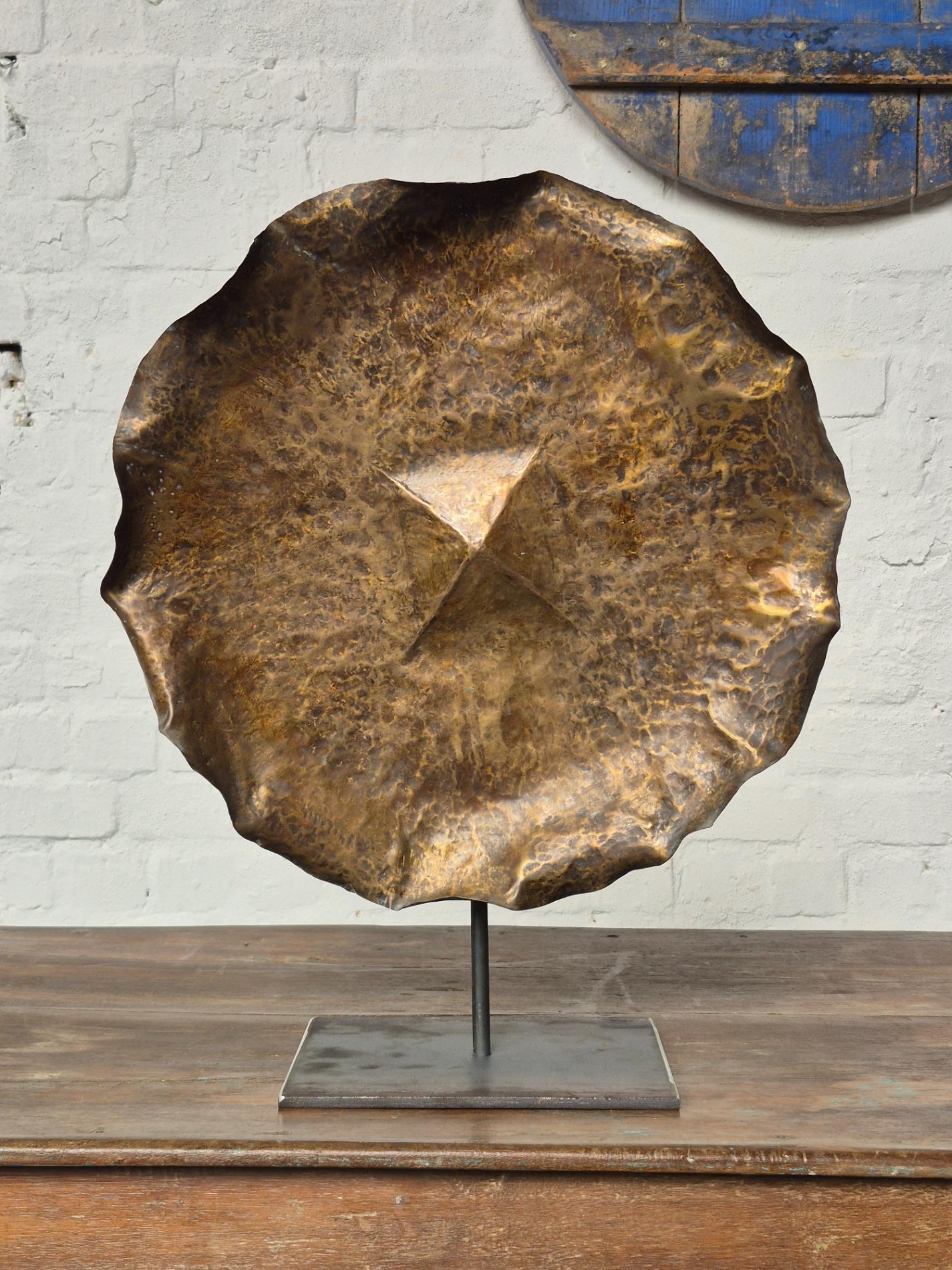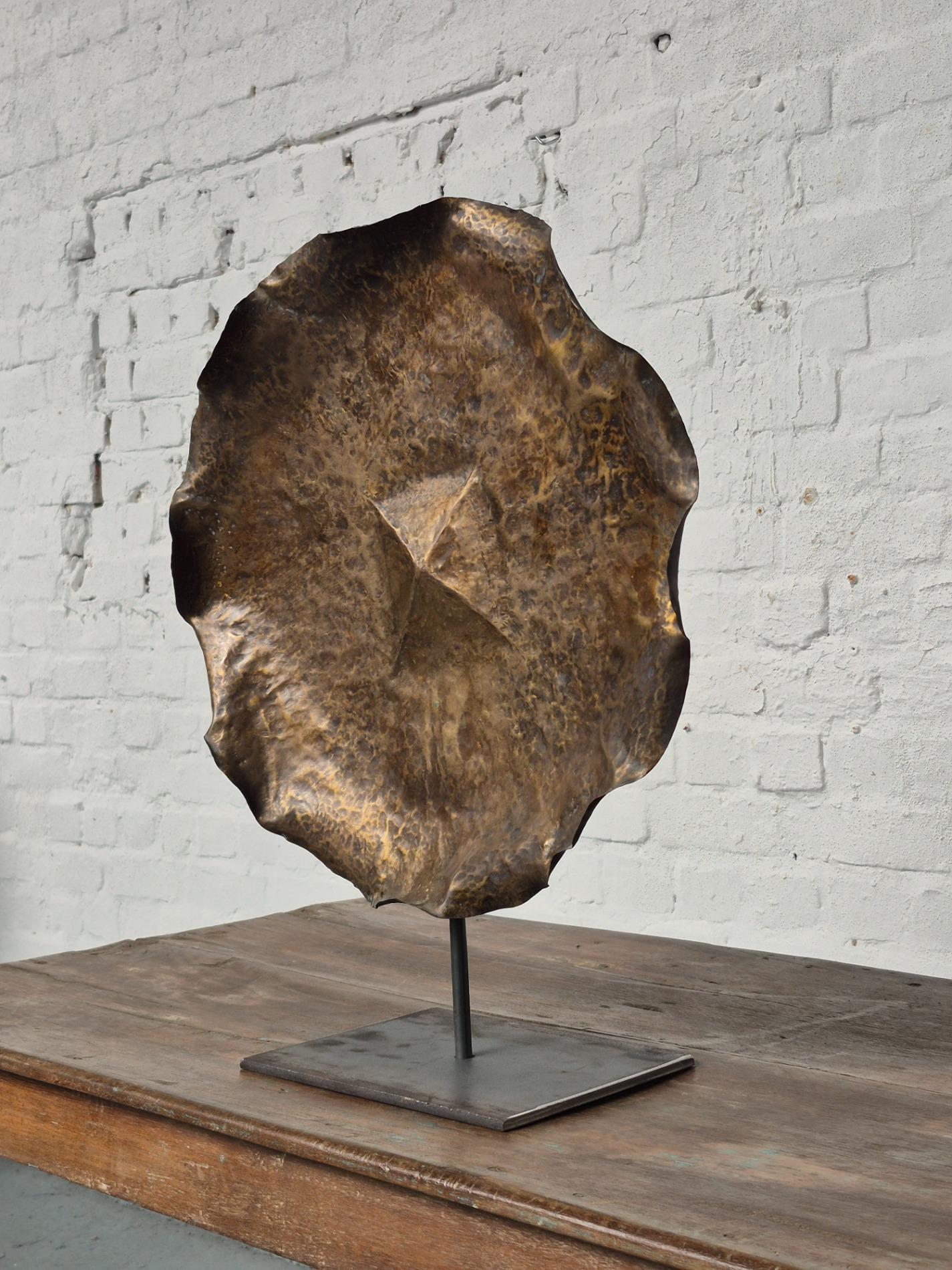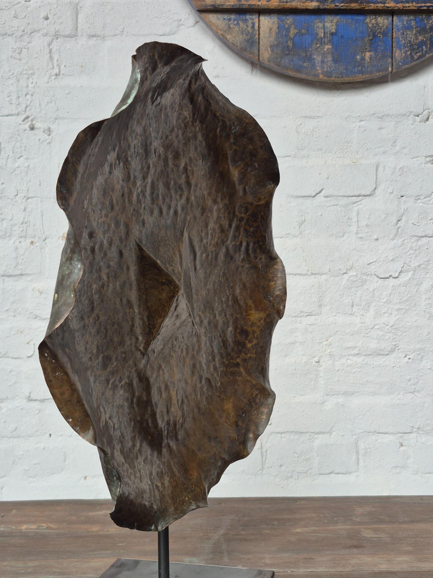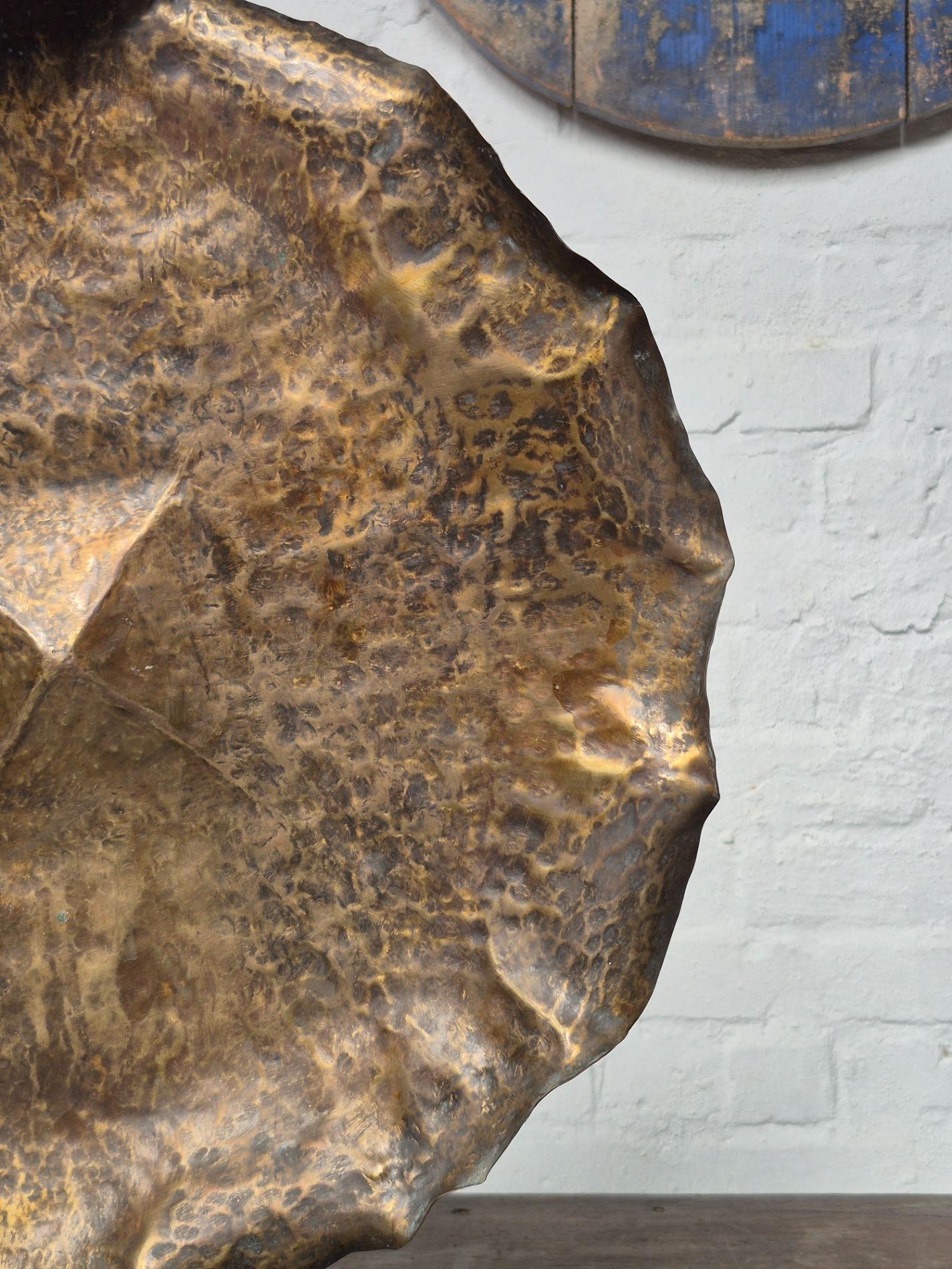 A brutalist sculpture made of hammered copper depicting a flower. A beautiful combination of raw hammered structures, old patina and solid design with curled edges. Belgium 1970s, comes with custom made metal display.