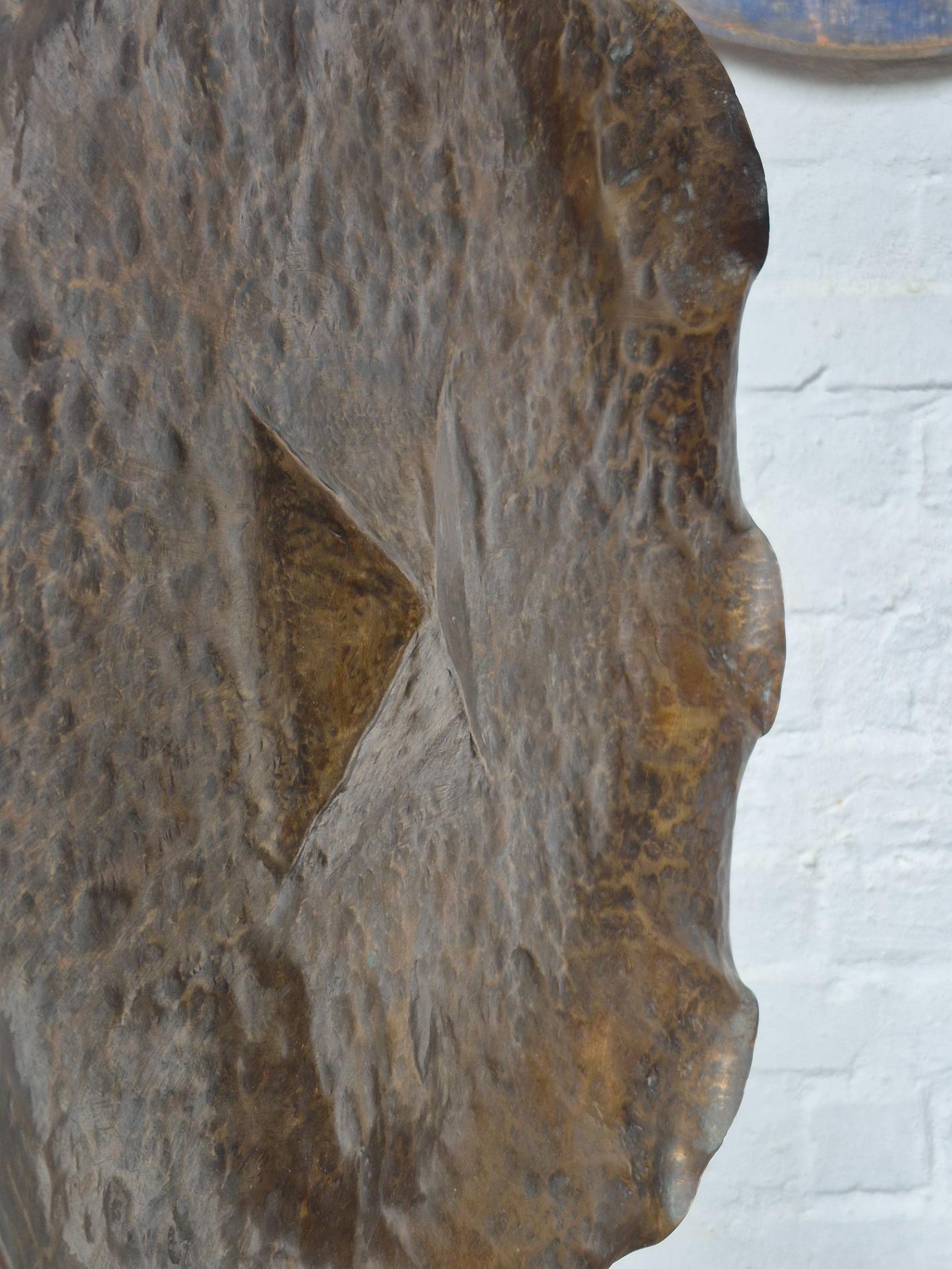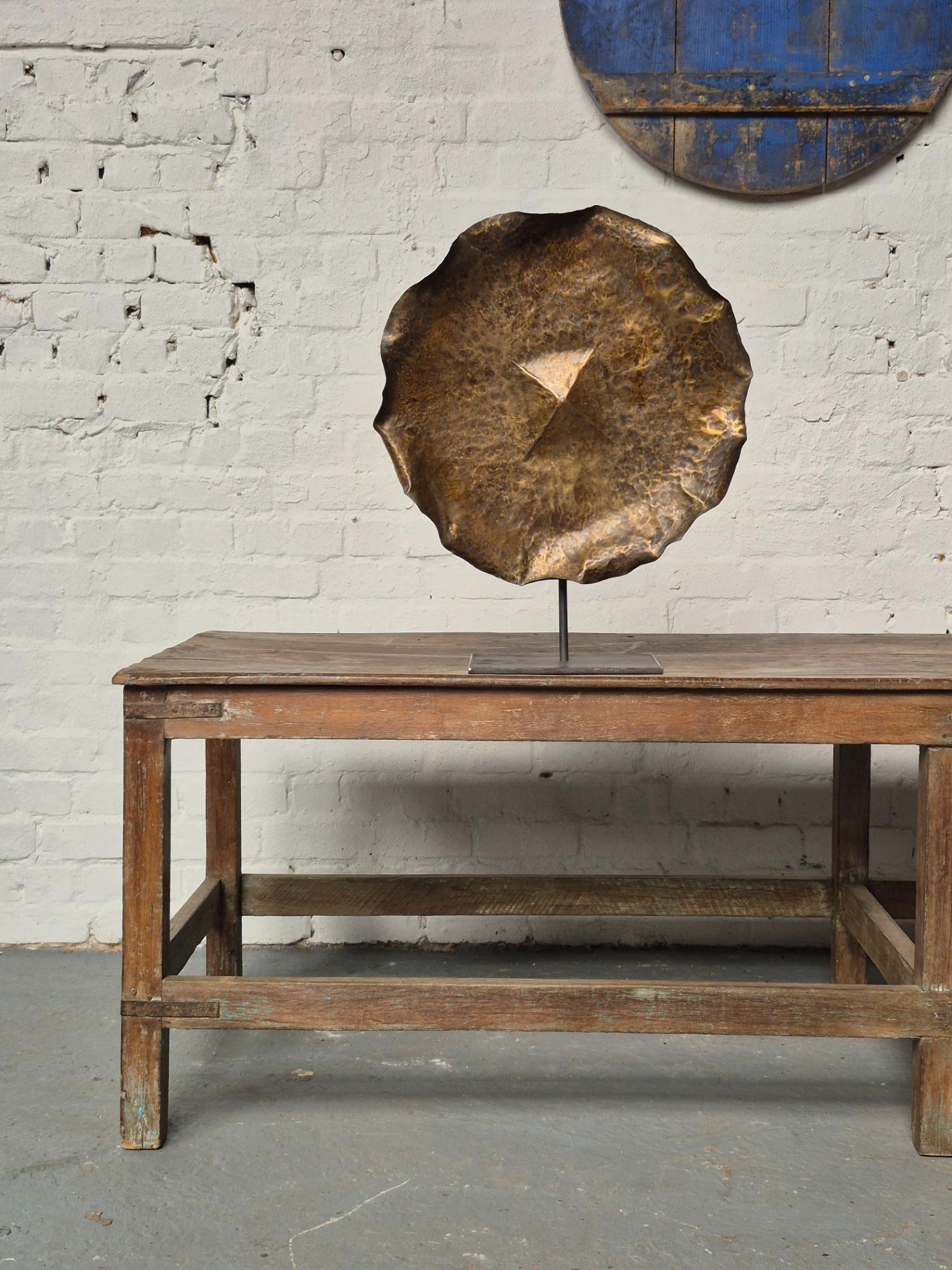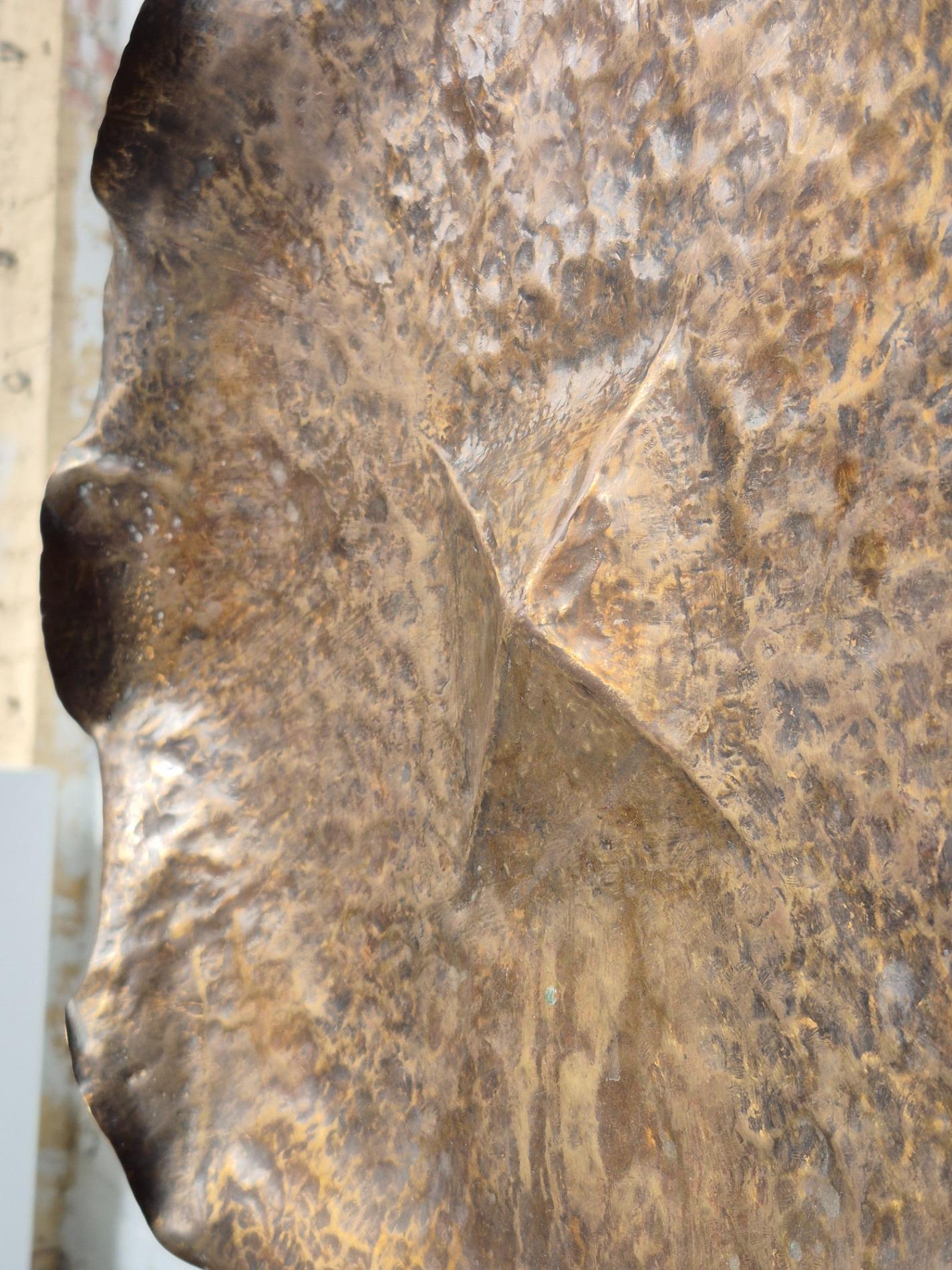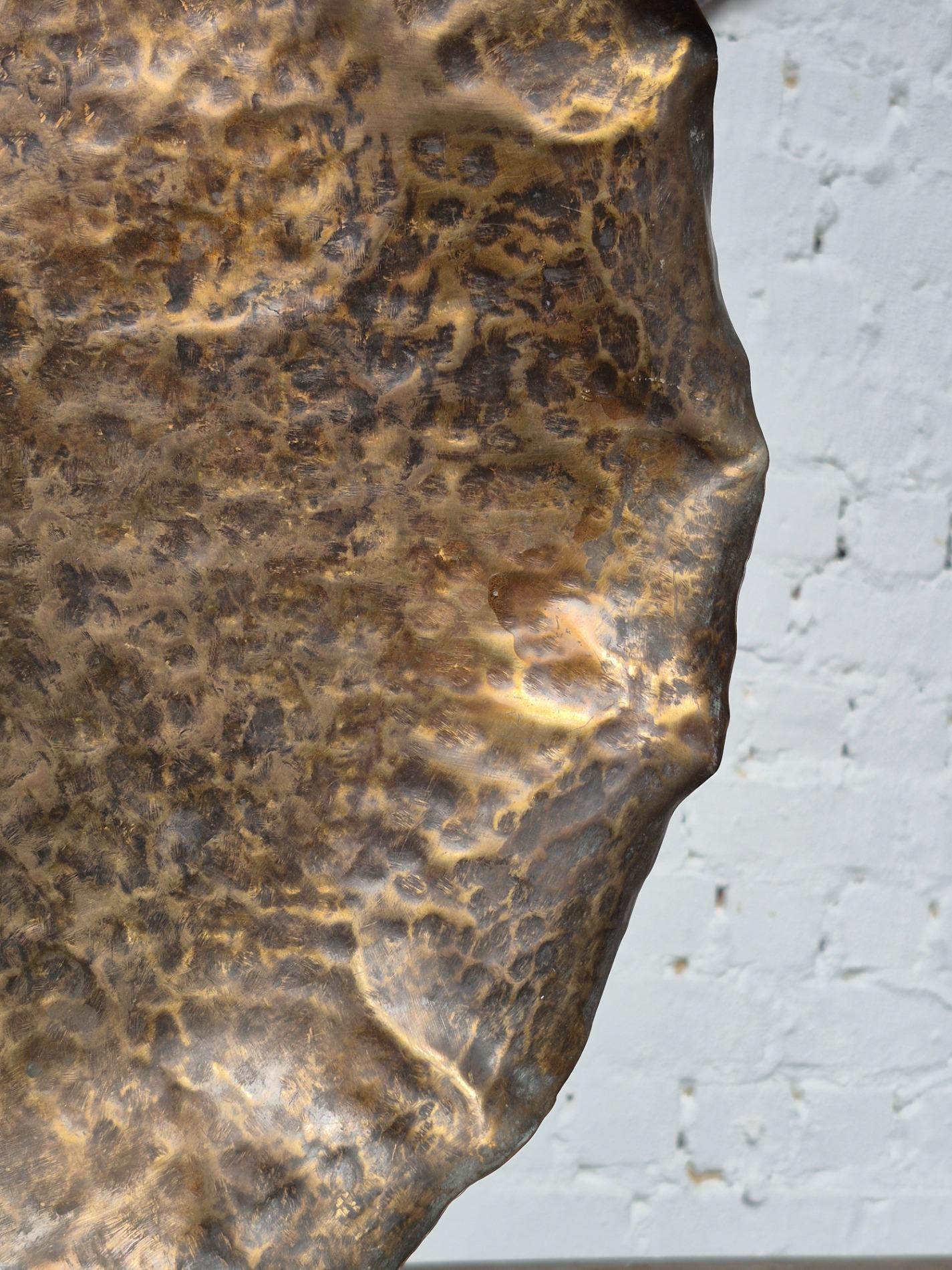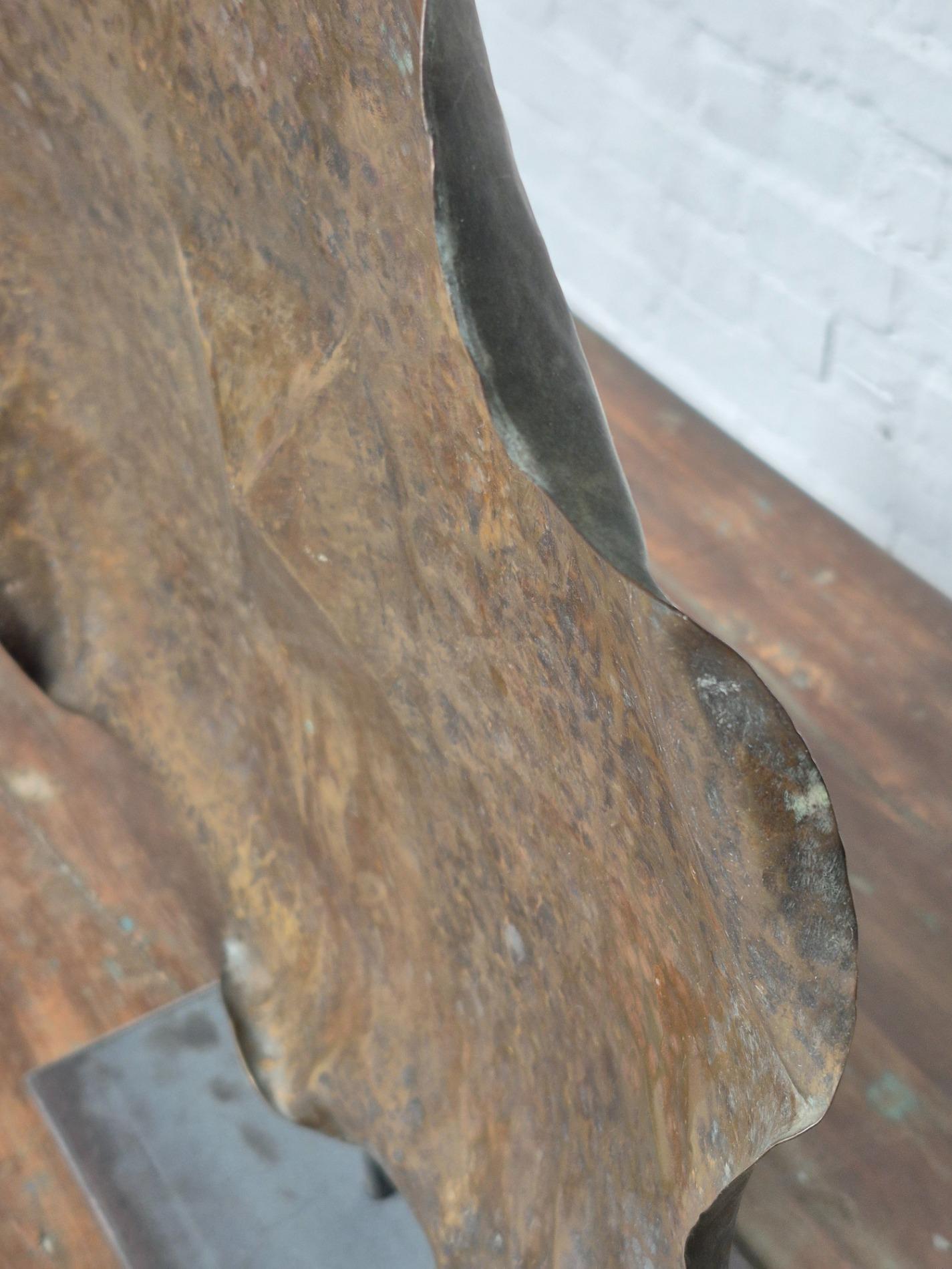 A brutalist sculpture made of hammered copper depicting a flower. A beautiful combination of raw hammered structures, old patina and solid design with curled edges. Belgium 1970s, comes with custom made metal display.