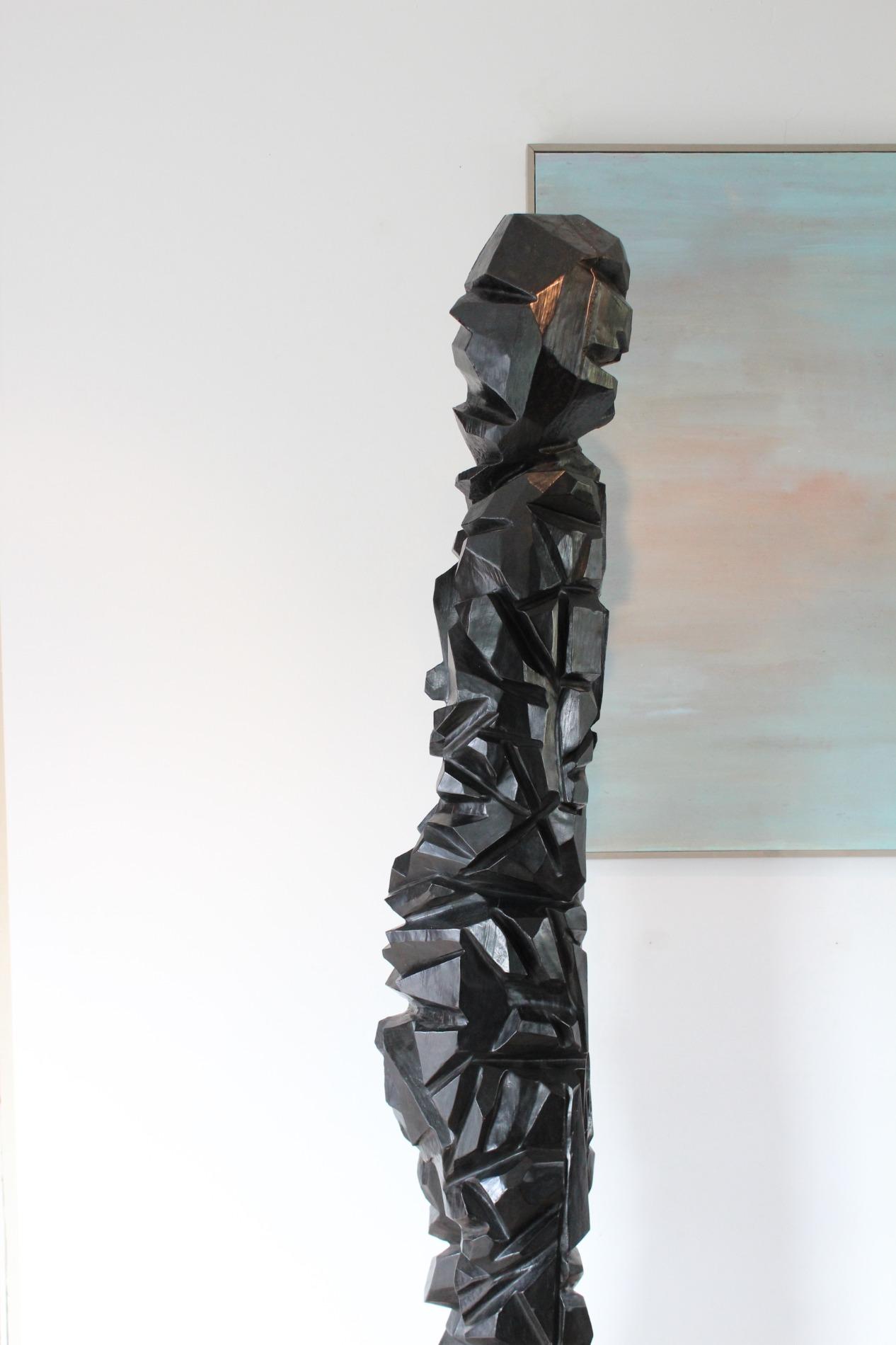 Large cubist totem sculpture, depicting a non figurative figure, built out of a massive block of wood and sculpted in several different shaped smaller wooden blocks. Made of burned wood, also calles so shugi ban, an ancient Japanese way for conservating wood. Origin France 1980s, unsigned