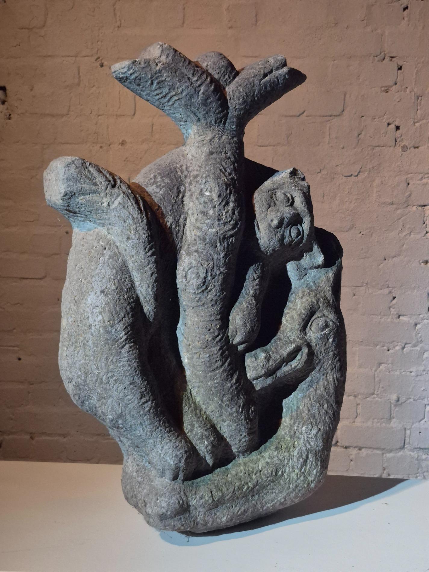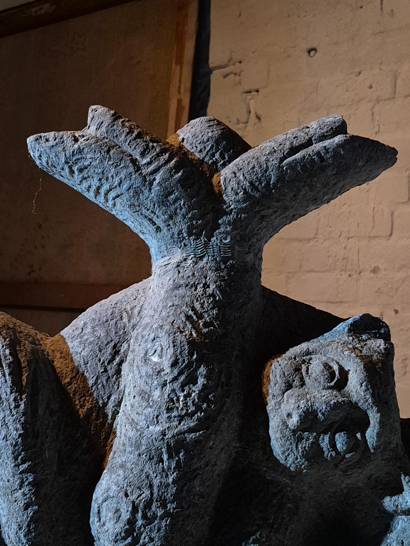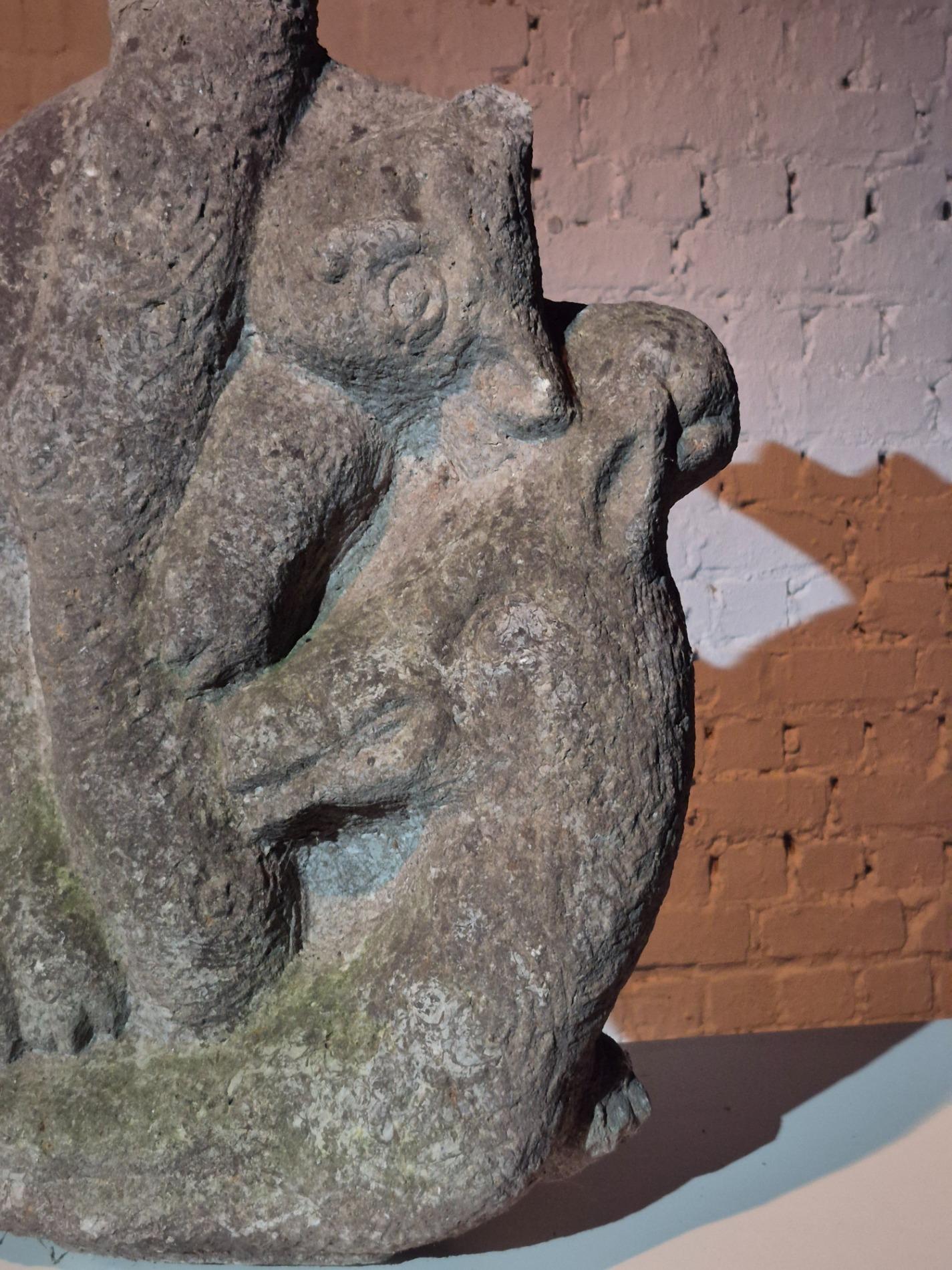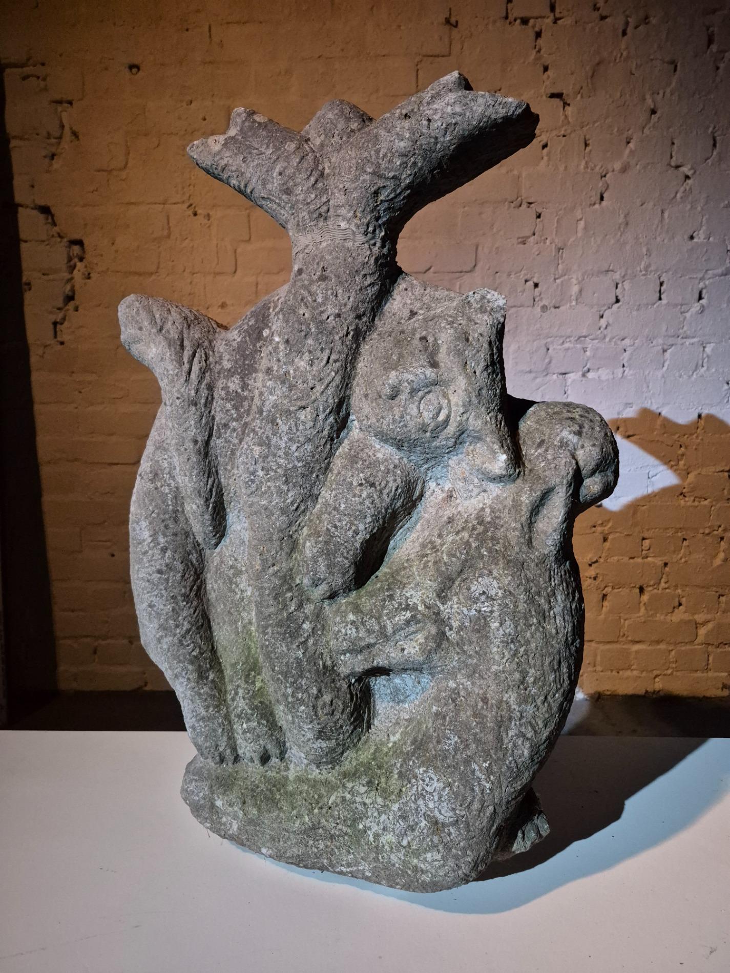 Late 17th C stone fragment of a mythical creature fighting with a deer, horse or unicorn around the tree.