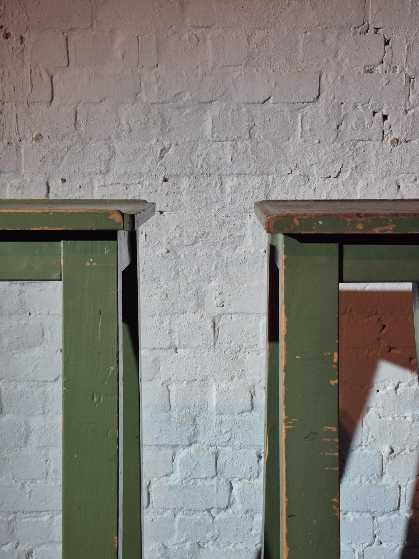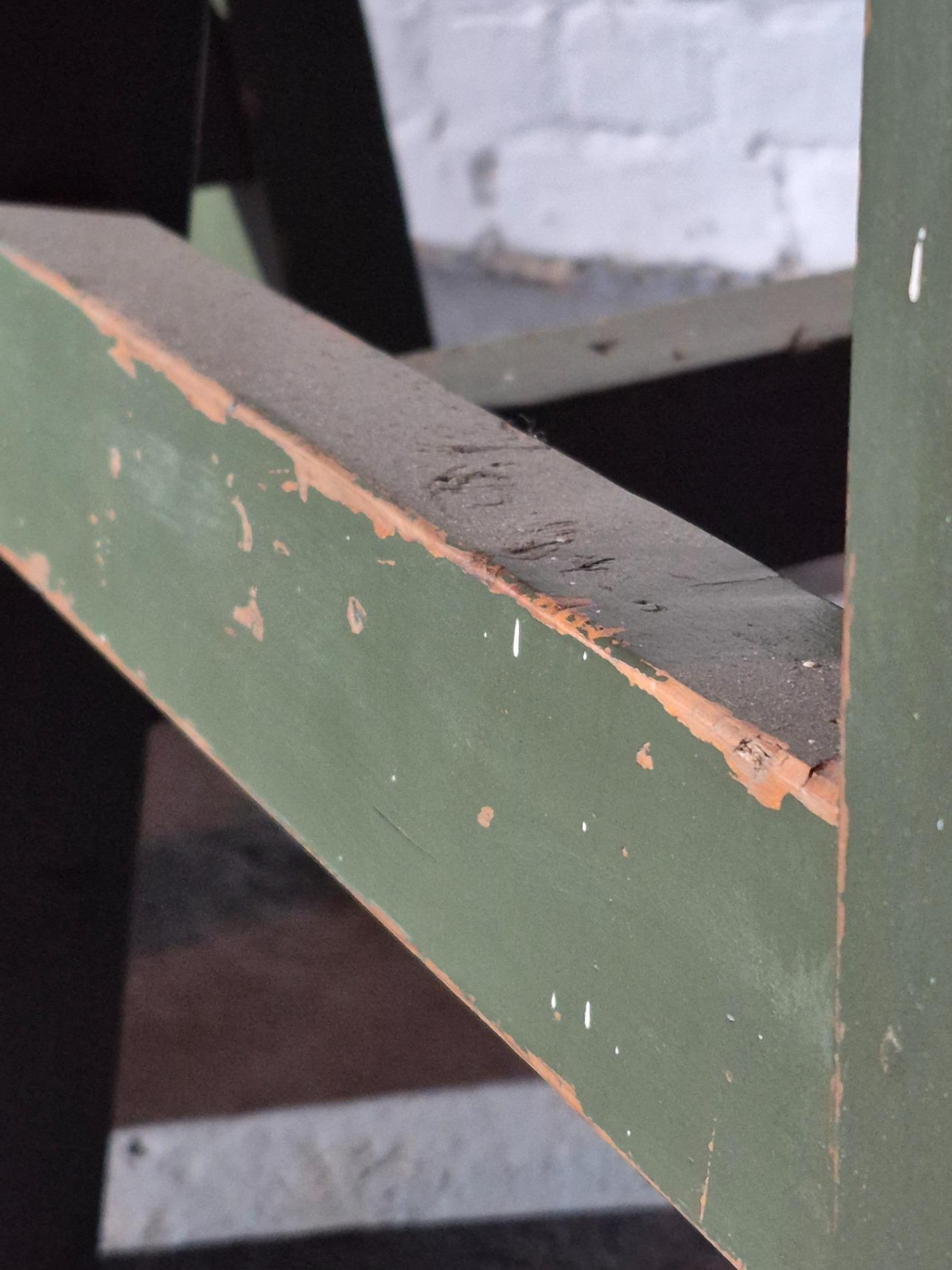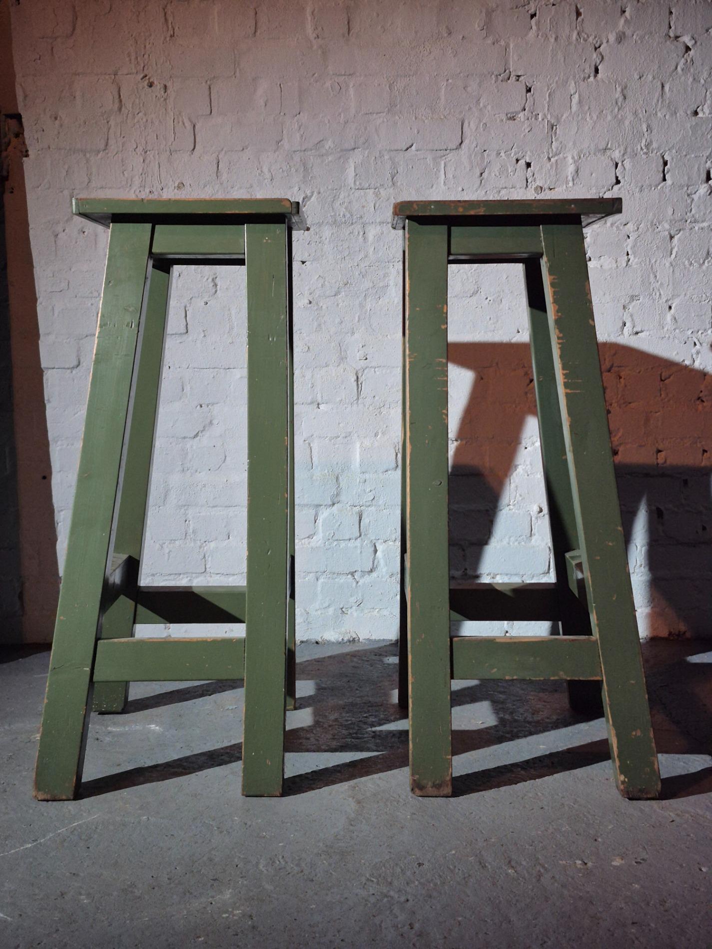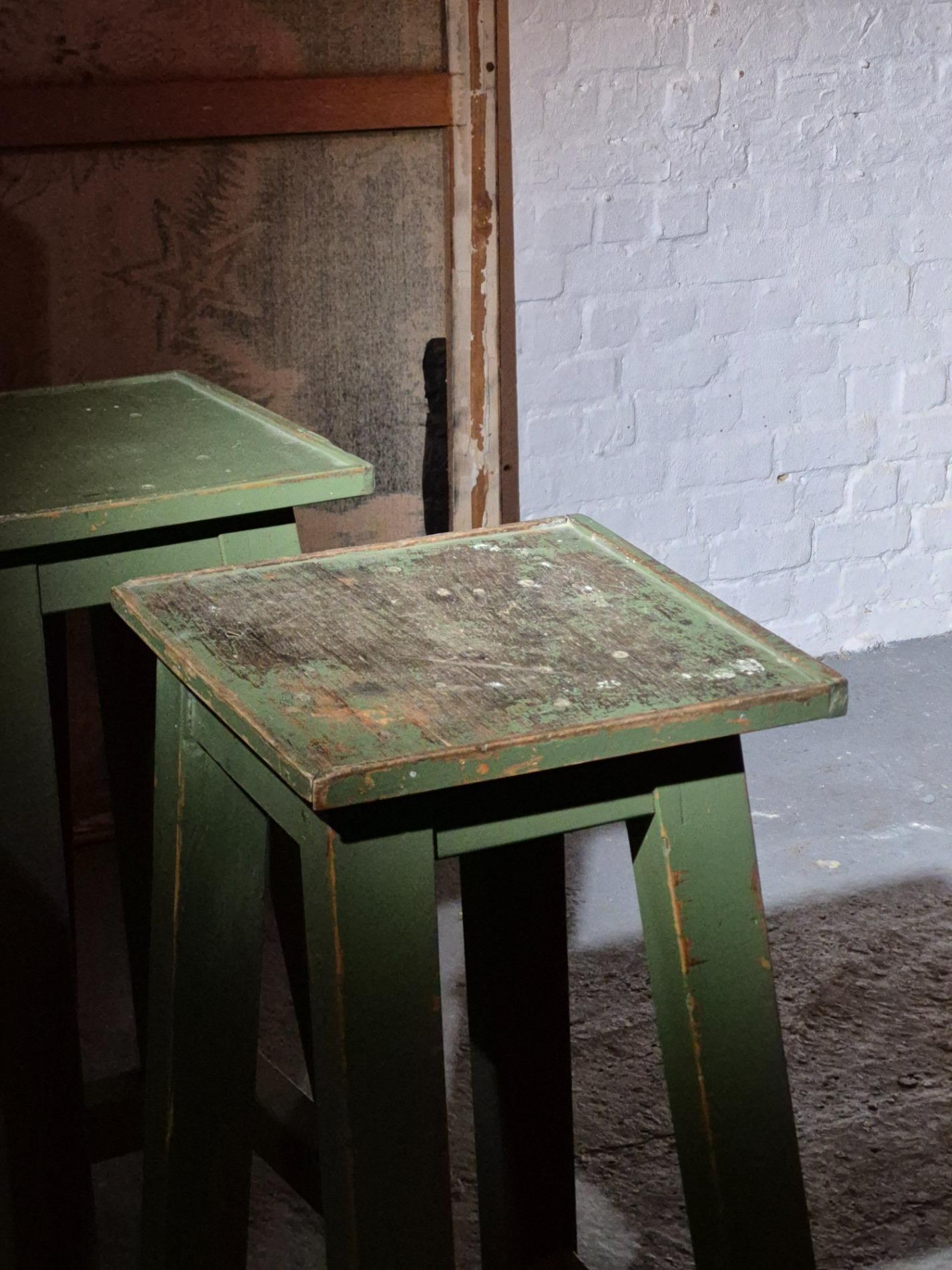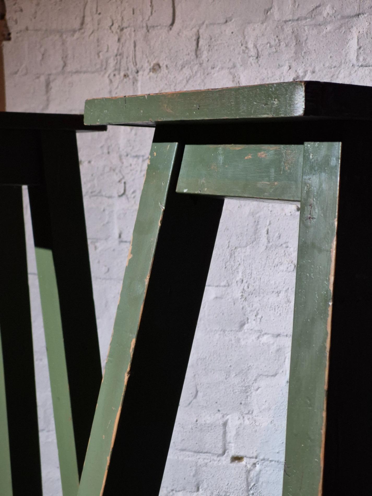 Green paint with nicely weathered patina. Asymetric design which gives the option to place them next to a wall.