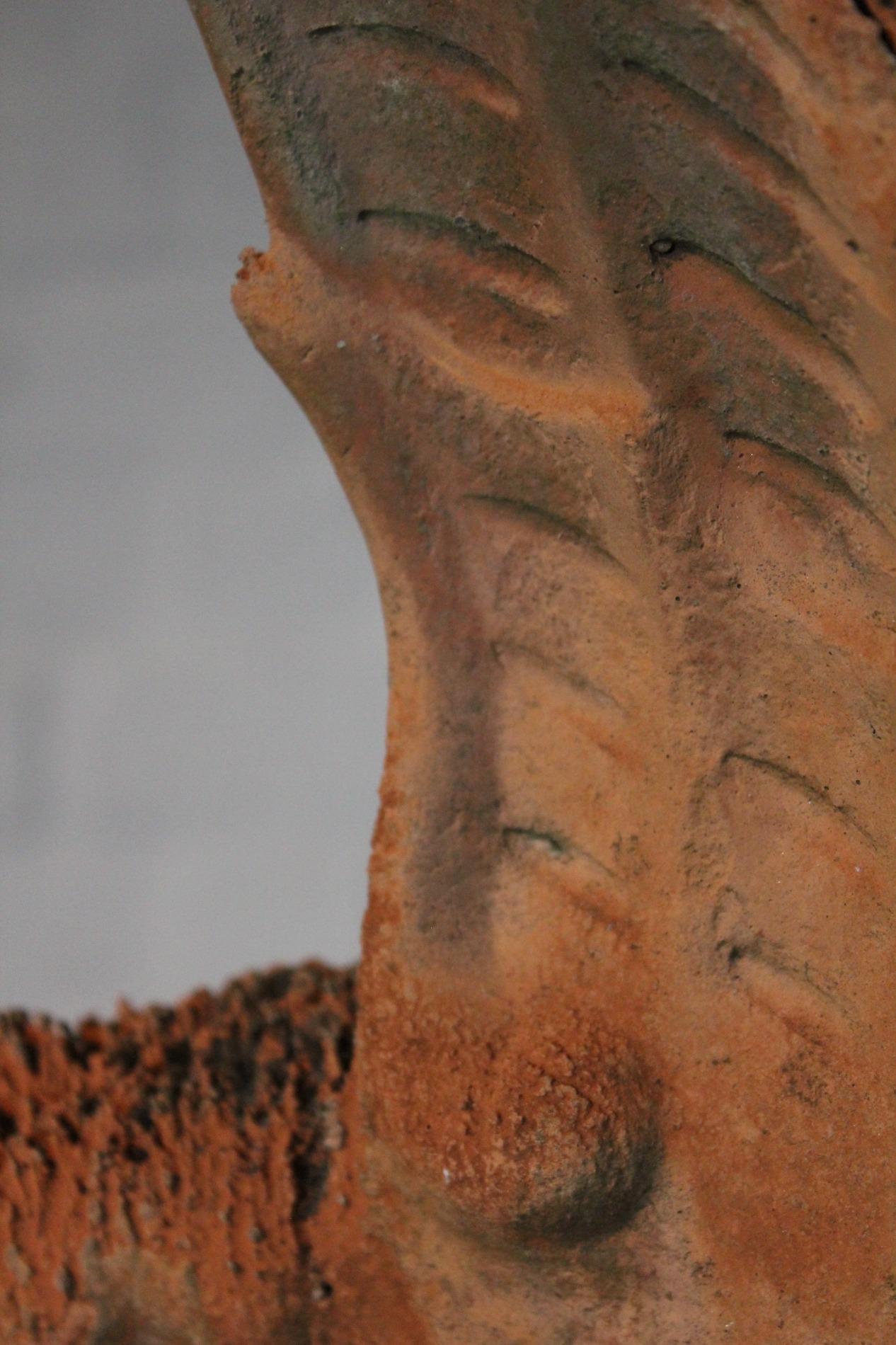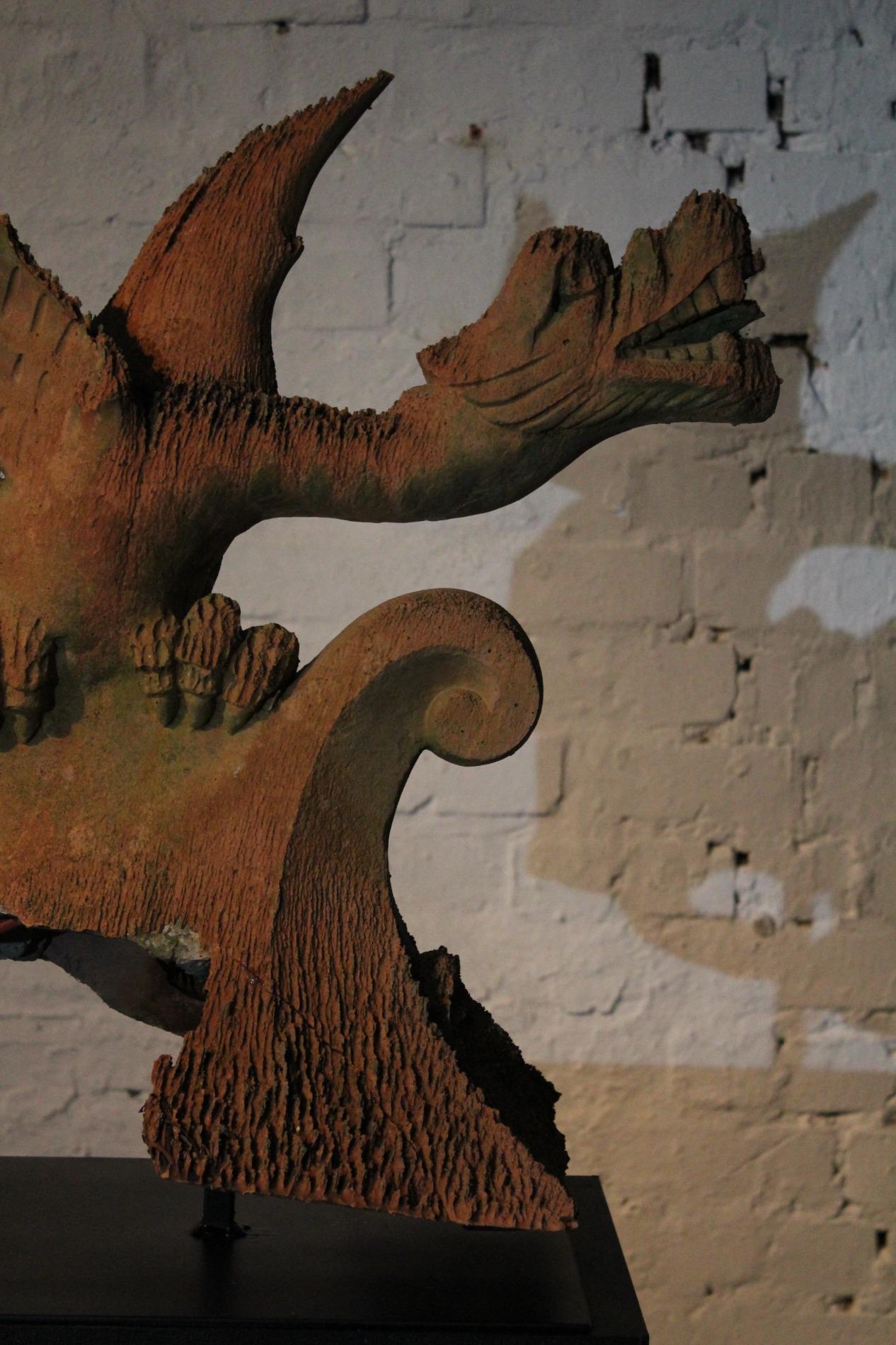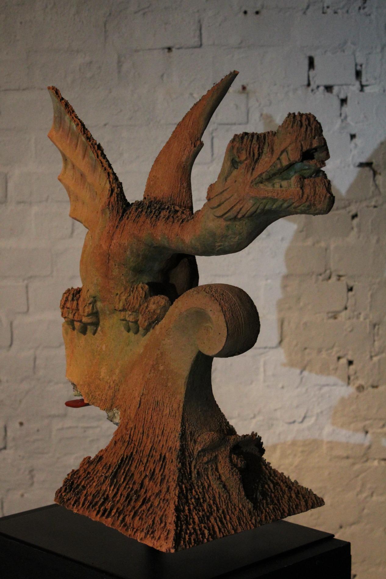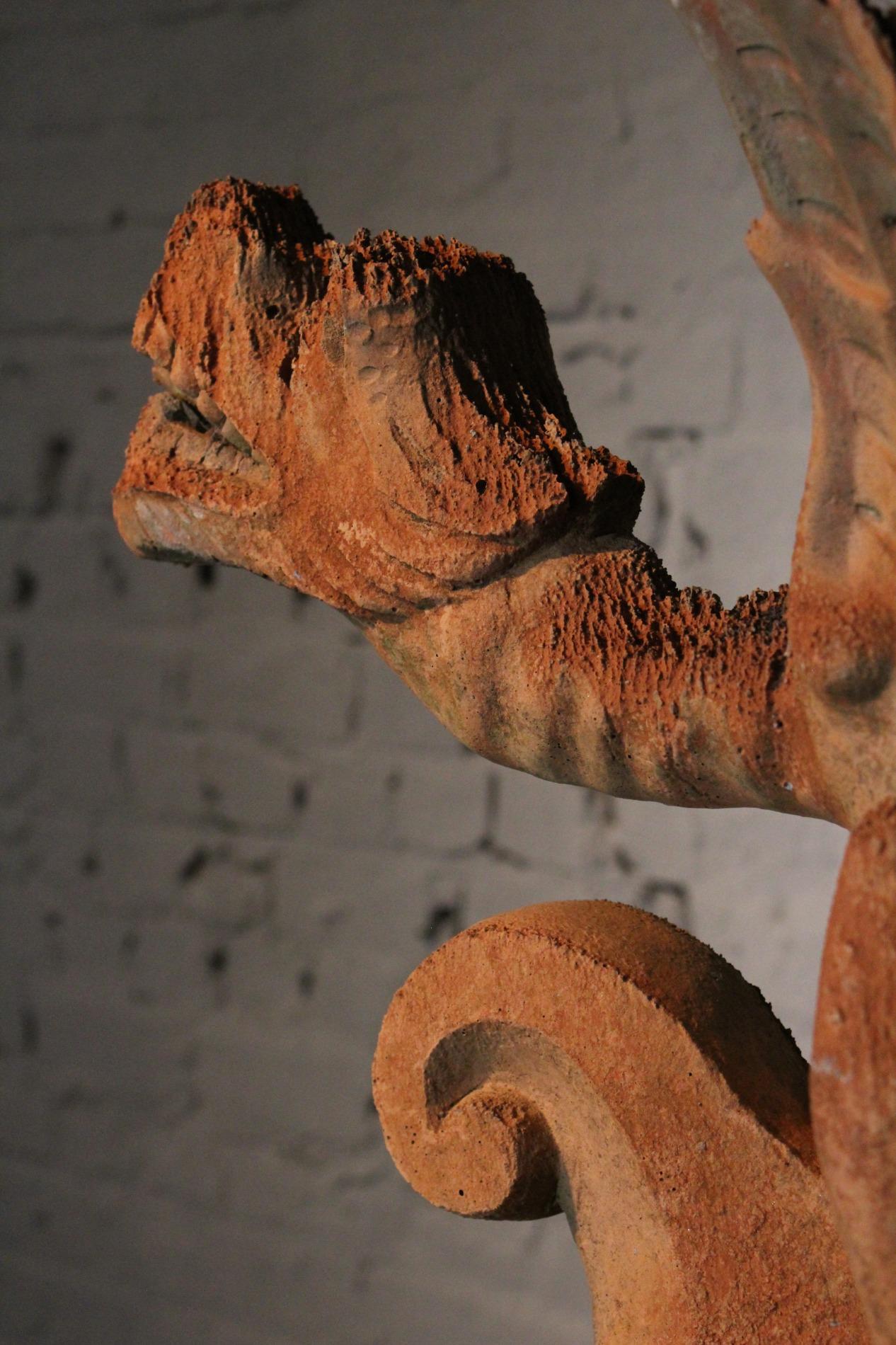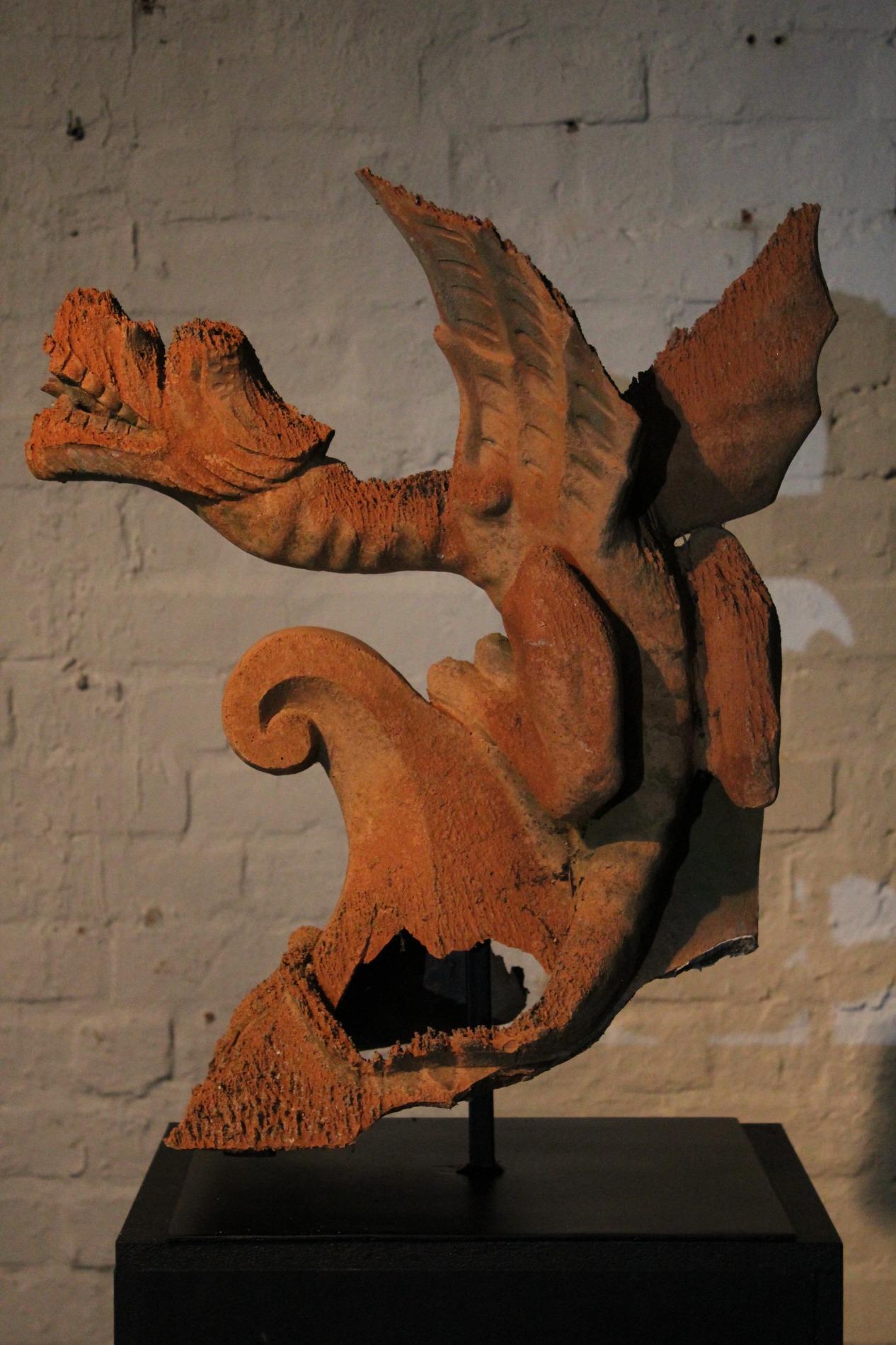 Old English terracotta dragon finial, in nicely weathered condition and shown on a custom made metal display. The decoration of the ridge of the roof and gables revived in the Victorian times. Before 1870's, in the gothic revival period the dragon and other figures were preferred to keep the evil spirits away. This custom probably originated in the Chinese belief.