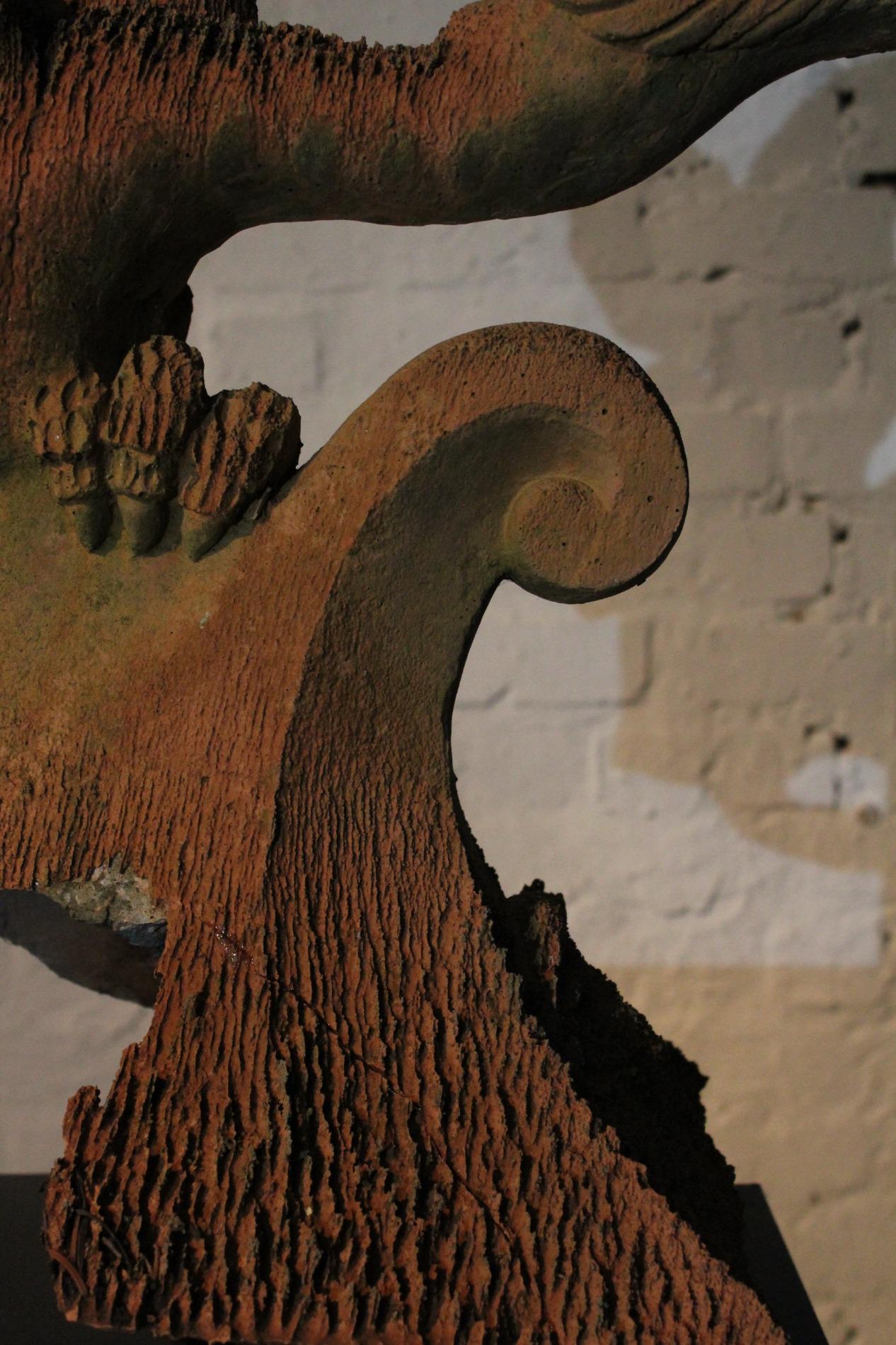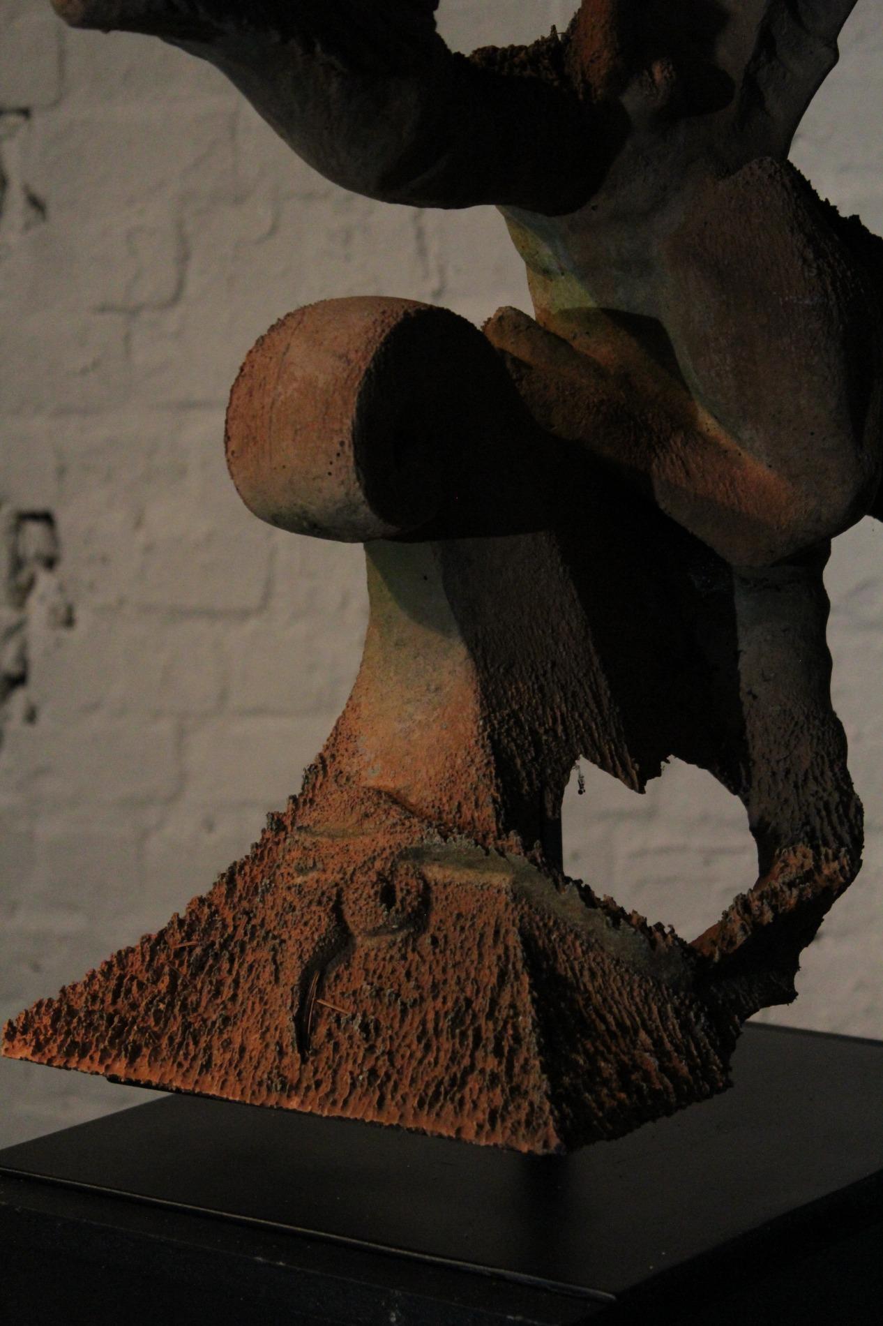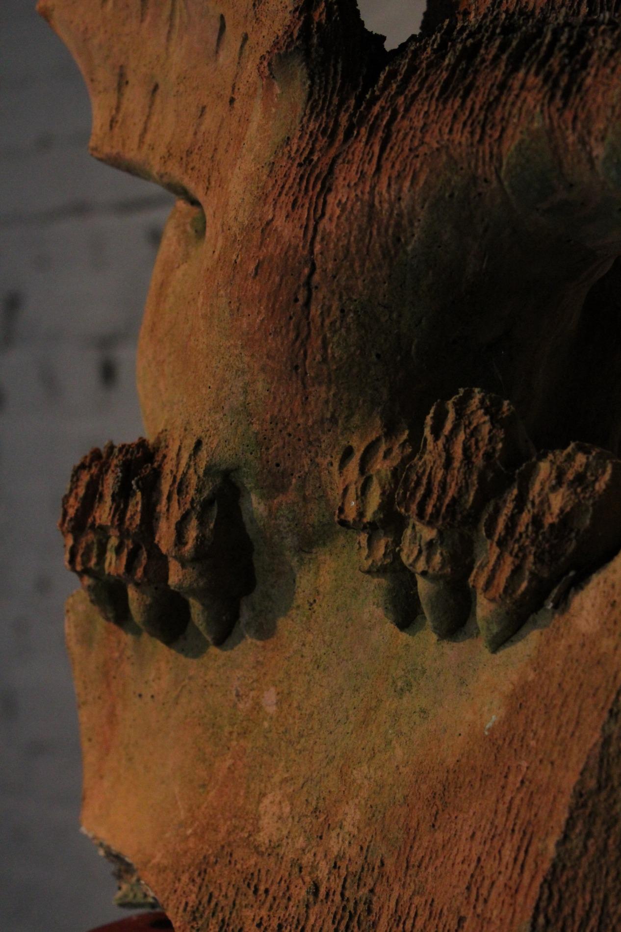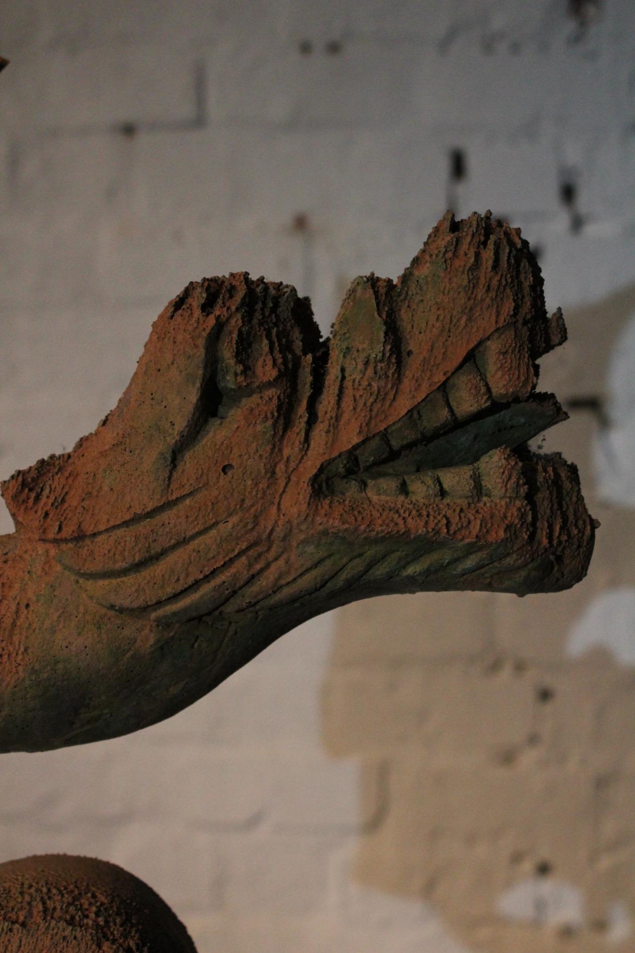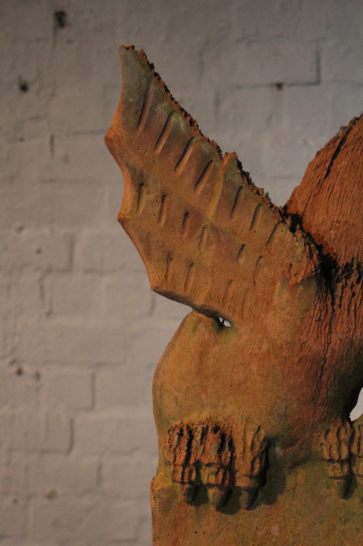 Old English terracotta dragon finial, in nicely weathered condition and shown on a custom made metal display. The decoration of the ridge of the roof and gables revived in the Victorian times. Before 1870's, in the gothic revival period the dragon and other figures were preferred to keep the evil spirits away. This custom probably originated in the Chinese belief.