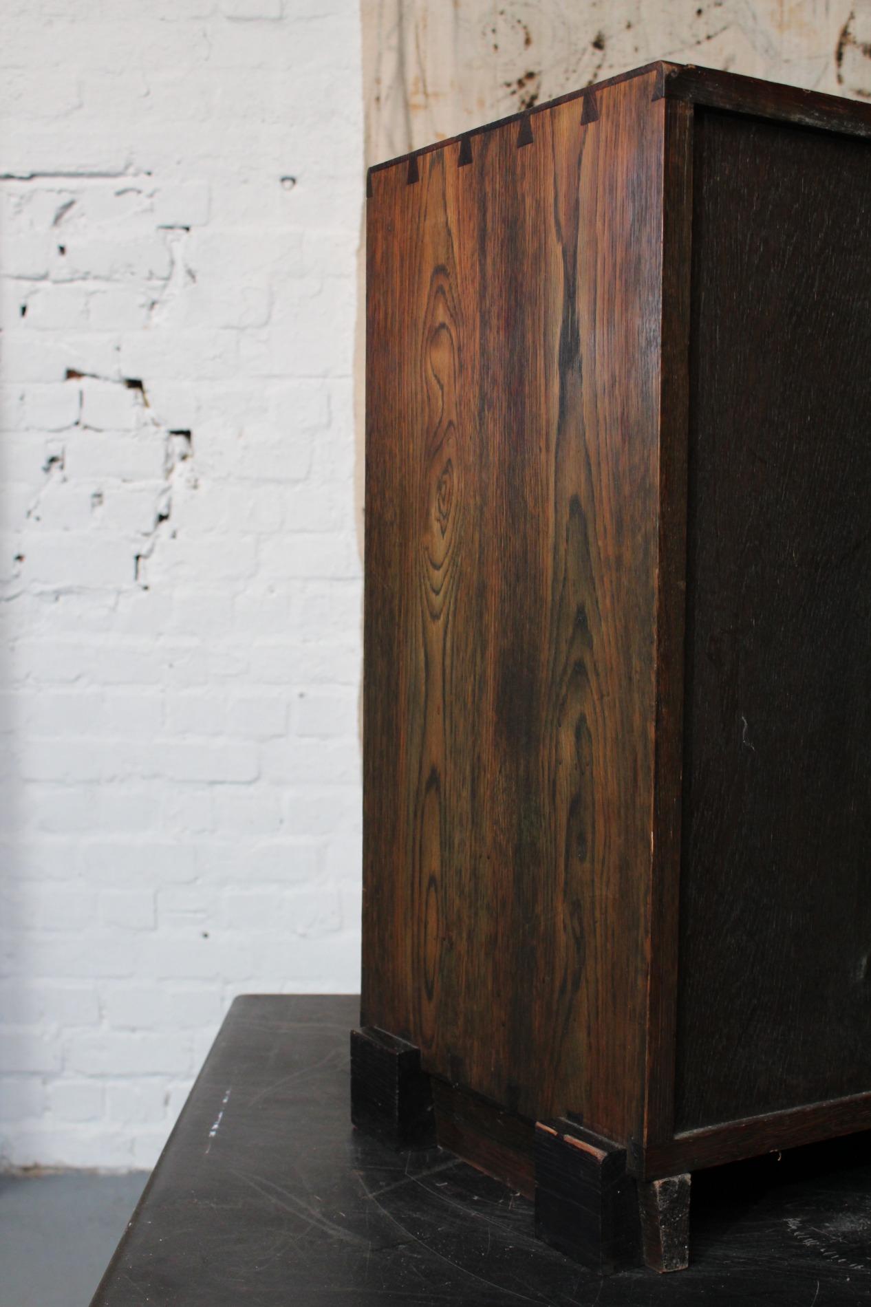 Original cabinet made by the 'Amsterdamse school'. In beautiful used condition with its typical strong straight lined design and cubic elements such as the 'cube' feet and the cubic door handle. Origin Holland 1920s