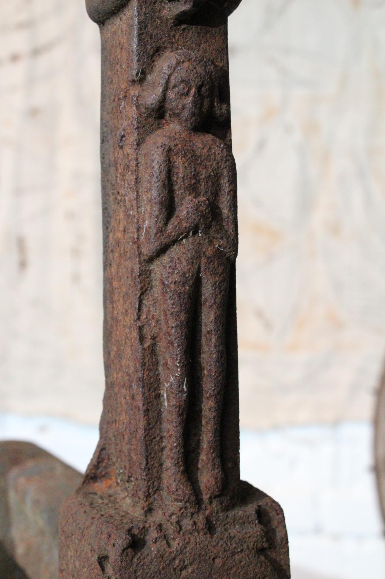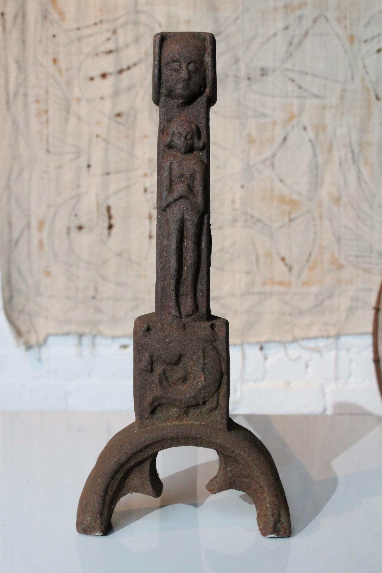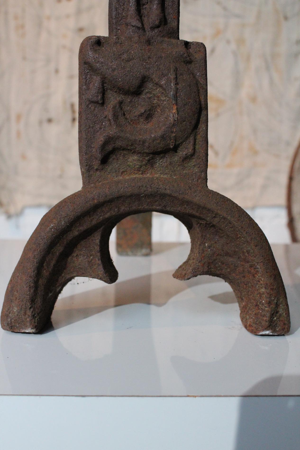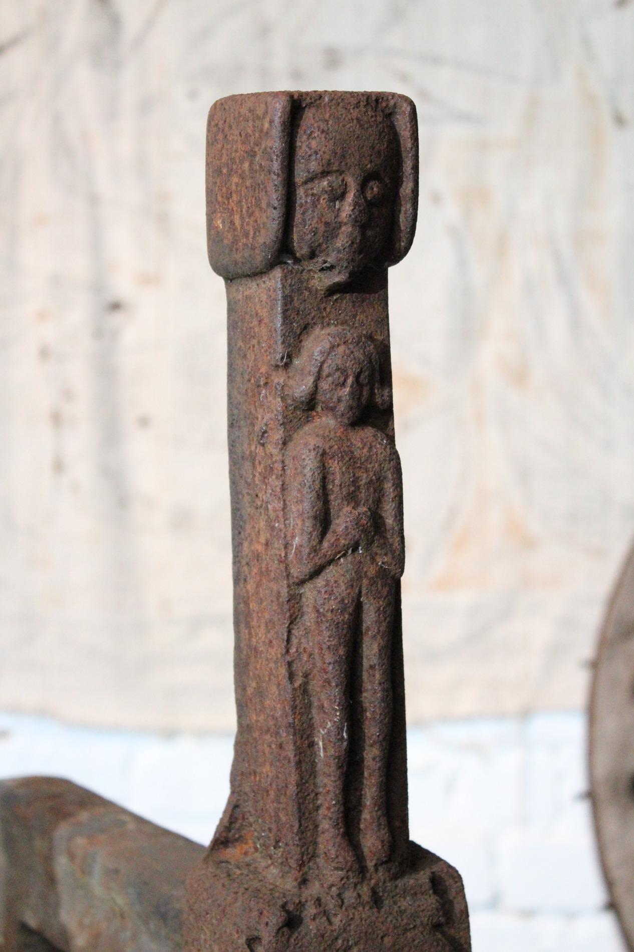 Pair of atypical forged iron andirons. Depicting a face, a figure and a mythical creature. Origin France 18th C, shaped with gothic elements.