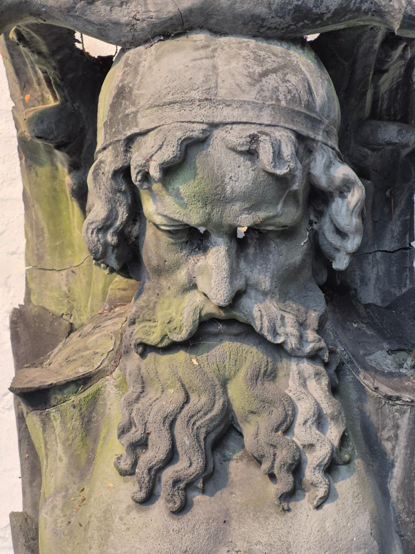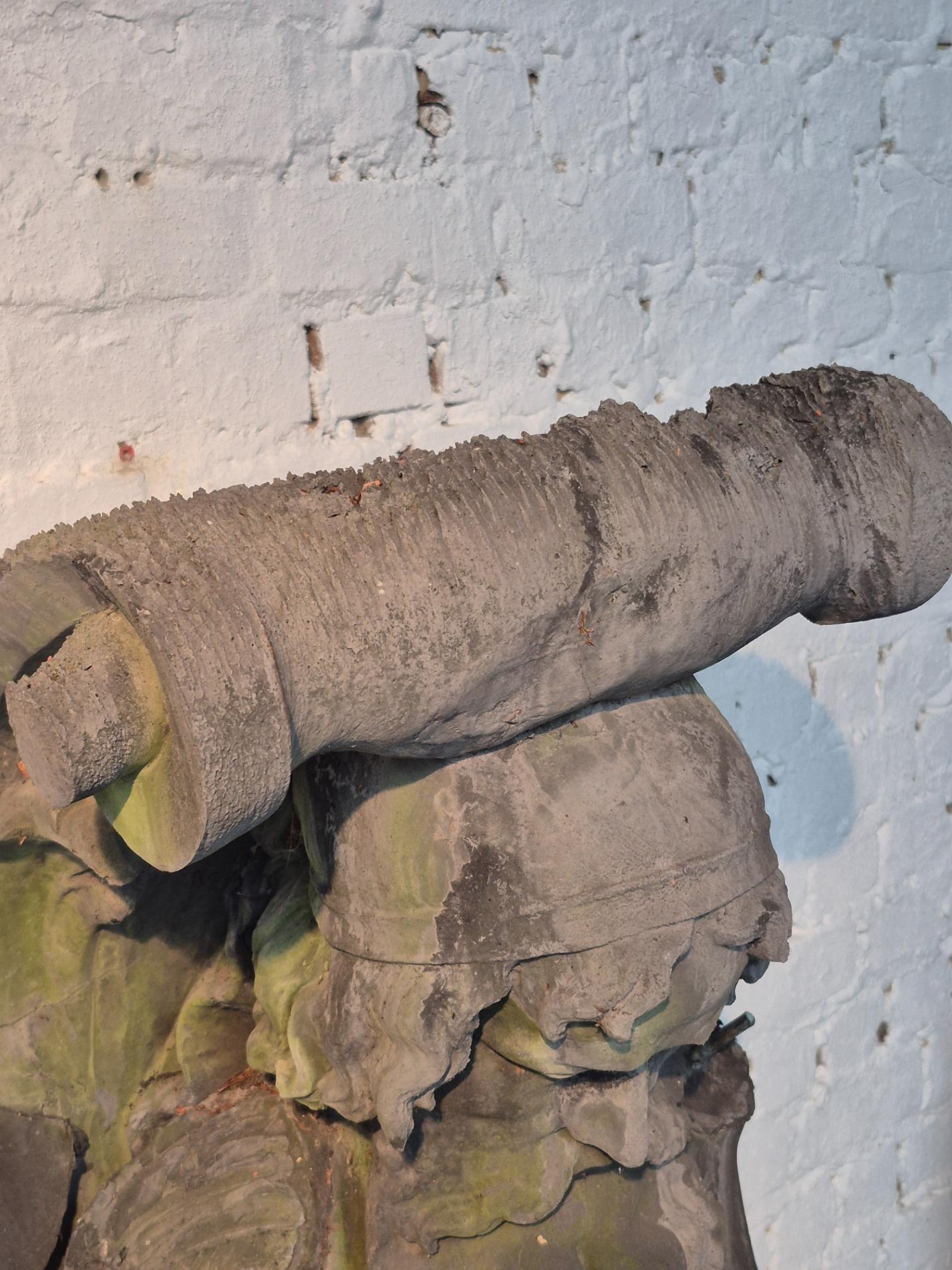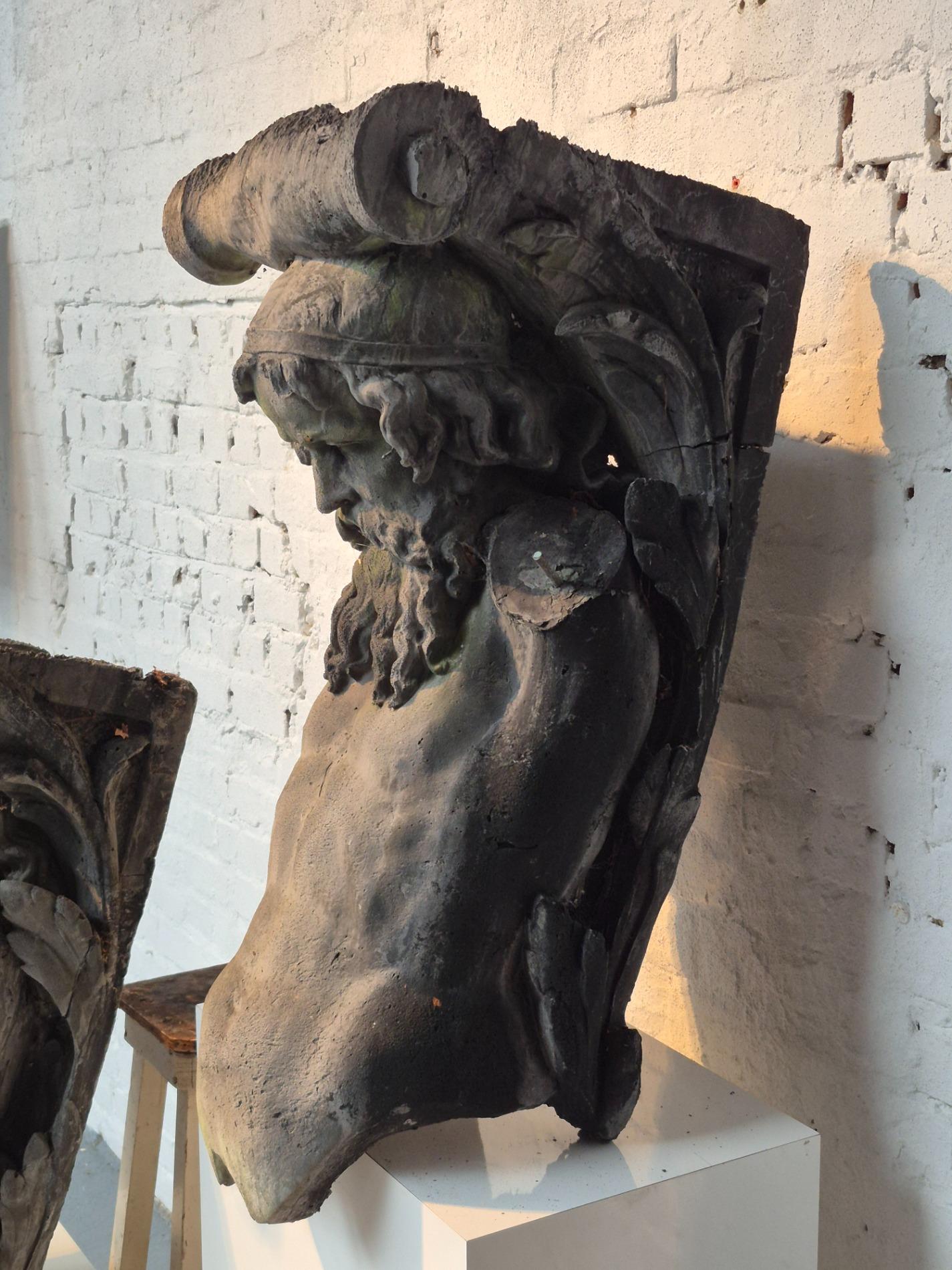 Pair of old cariatides depicting two mythological figures. Made in the 1960s as theatre props. Material is a mix of cement and plaster and with a metal structure inside. Weathered patina from hanging outside.