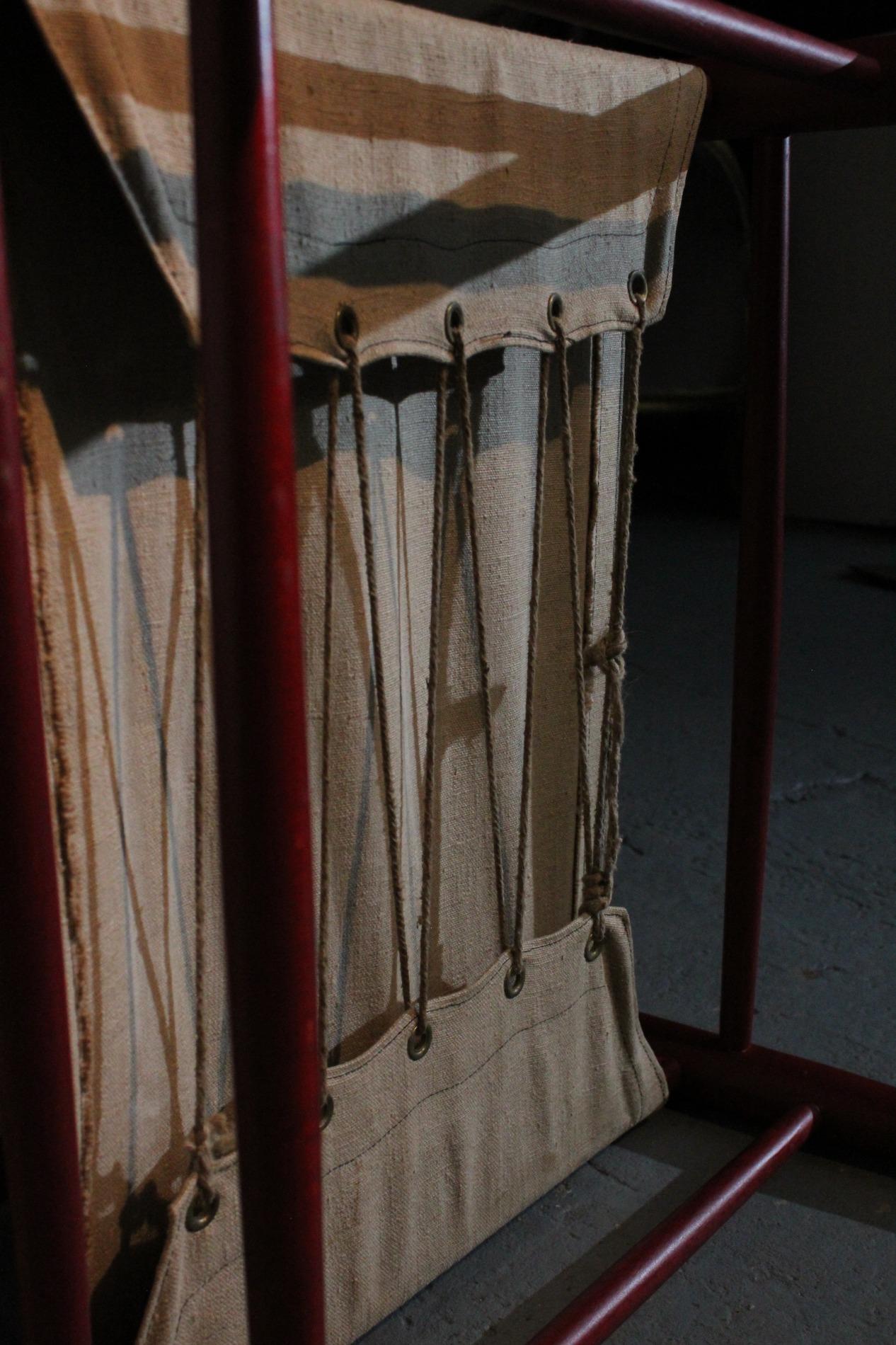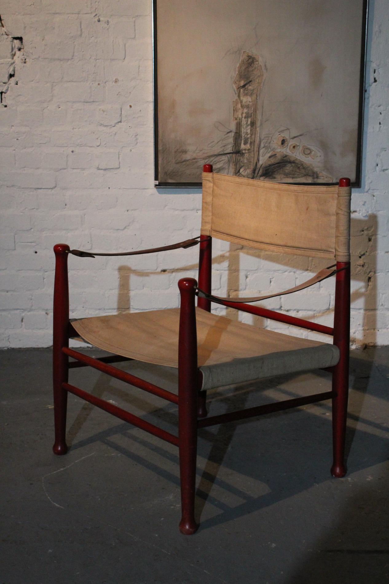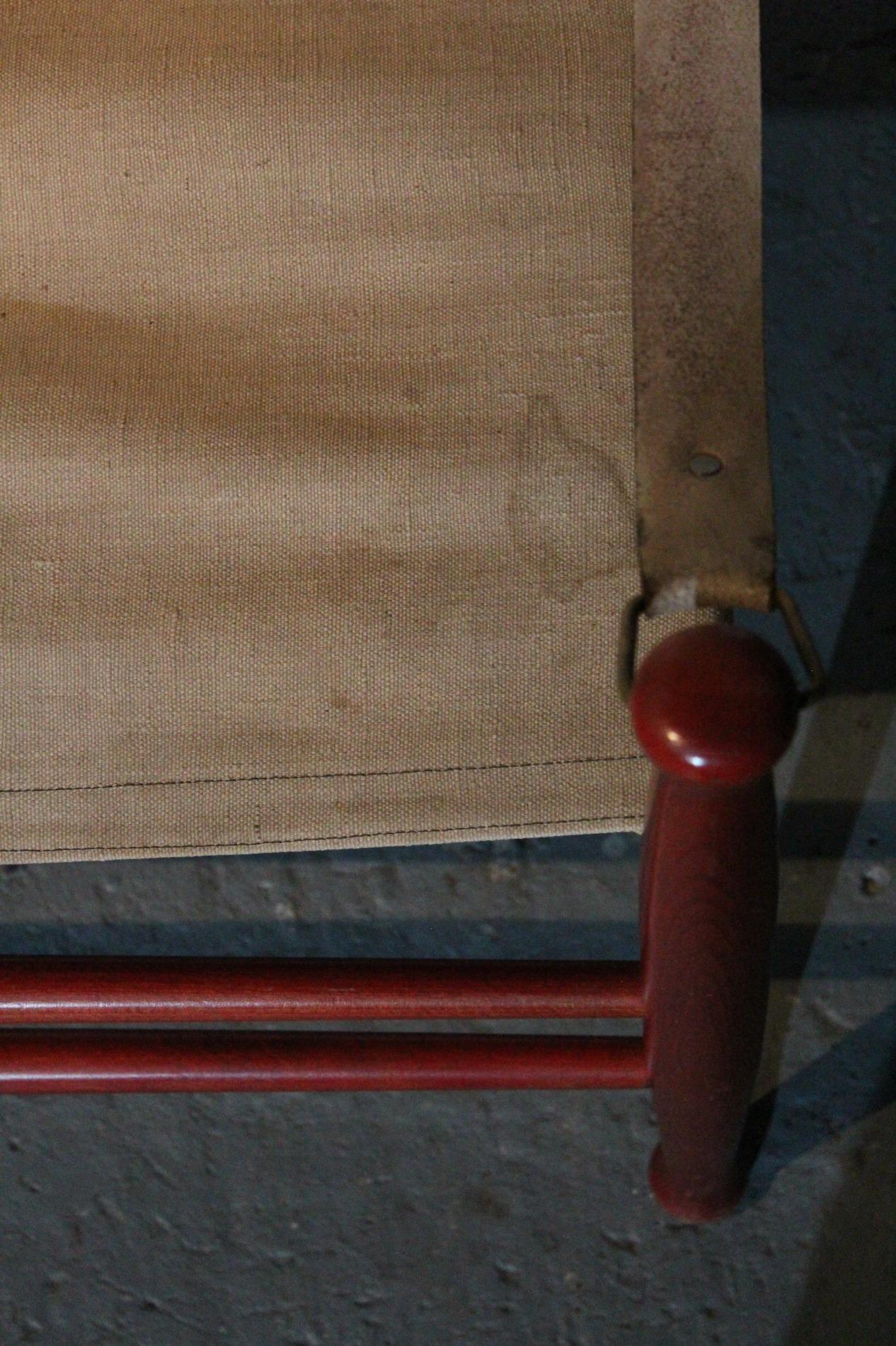 Pair of original Danish 1960s 'Safari' chairs by Farstrup Stolen. Made of tent canvas, rope, leather armrests and a solid beech frame. In very good and stable condition, one leather strap was replaced. Farstrup is a Danish furniture brand, founded in 1910, specializing in handmade, high-quality and individually customizable chairs and armchairs, known for Danish design, ergonomics, craftsmanship and the use of sustainable materials, with production in its own Danish factory.